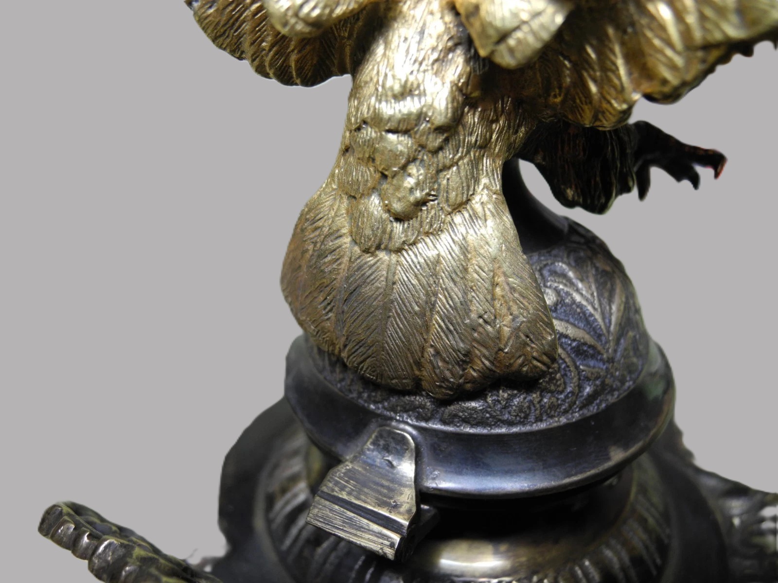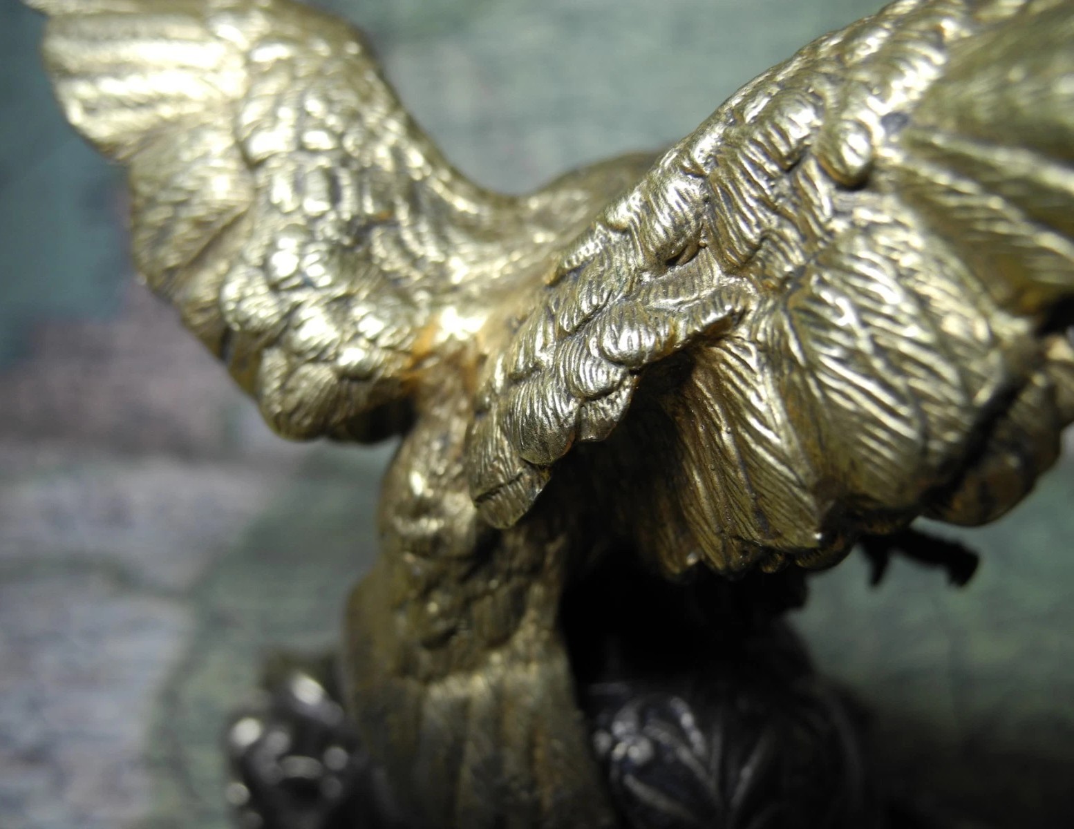 - The Eagle: The focal point is a finely cast eagle with wide, outstretched wings, captured in a powerful and alert pose. The casting is detailed, showing individual feathers and a sharp, open beak.