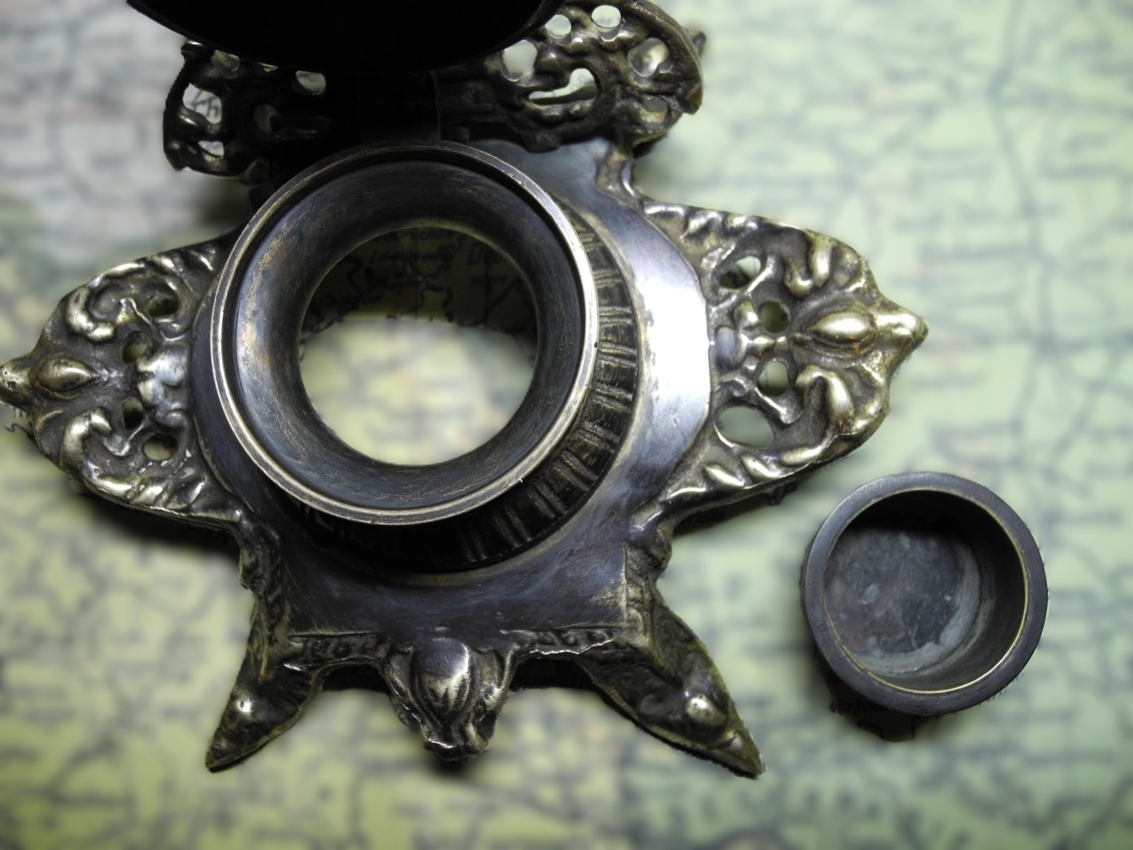 - The Base: The inkwell sits on a six-pointed star base. The points of the star feature elaborate filigree and rococo-style openwork. Behind the dome, there is a decorative, upright filigree panel that serves as a backrest for the lid when opened.