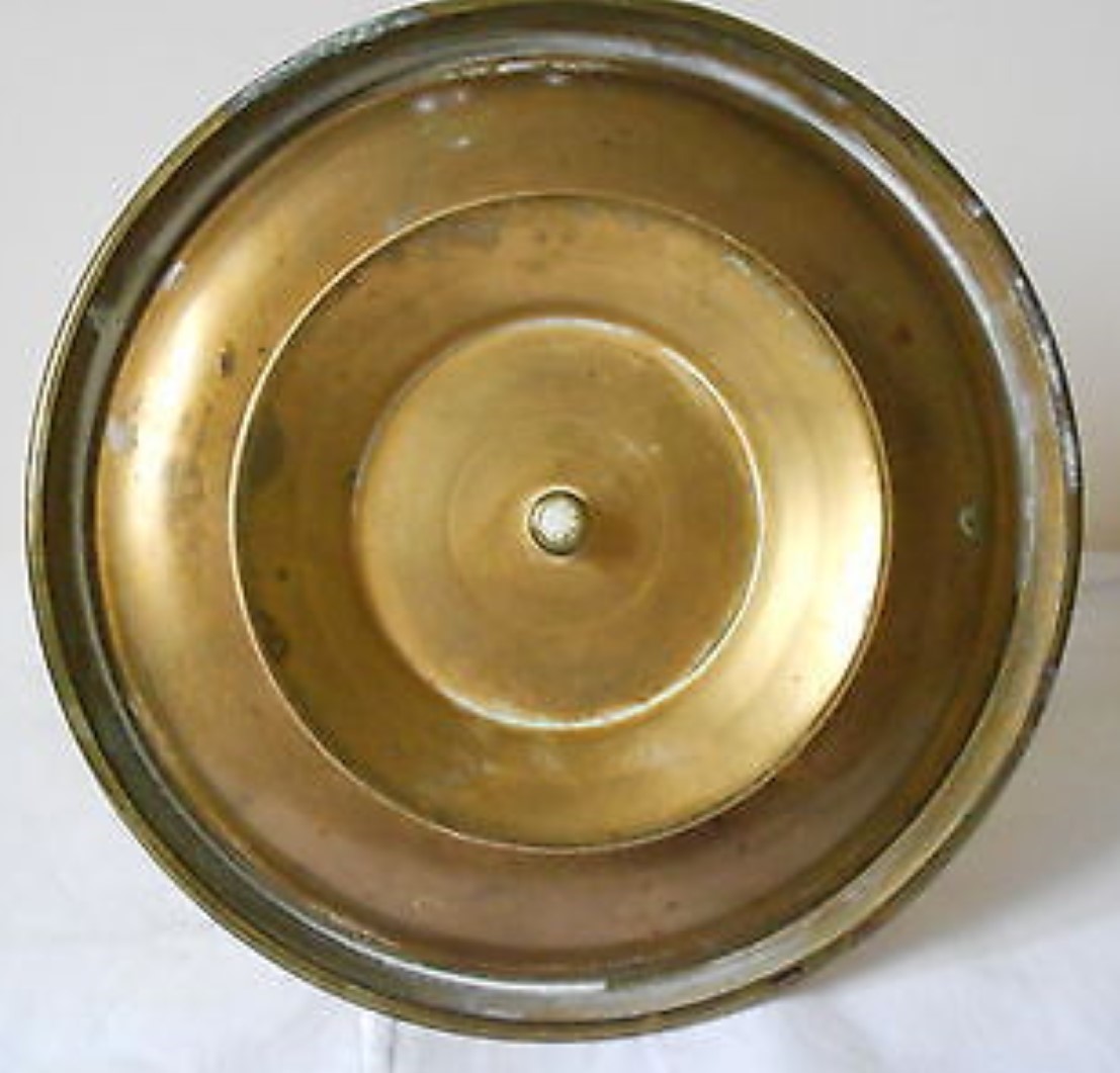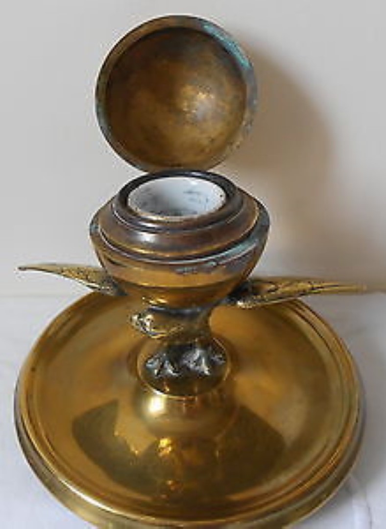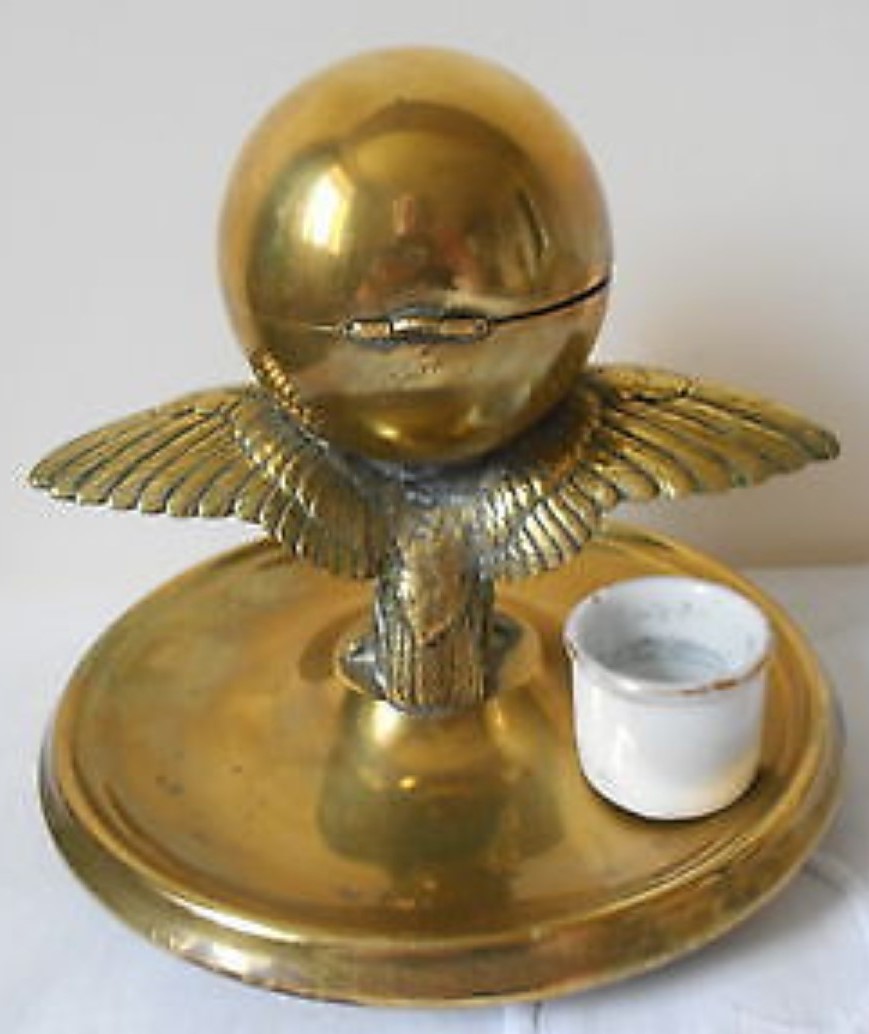 Spread-winged eagle, with brass sphere (inkwell) resting on top, is attached to a circular brass base.