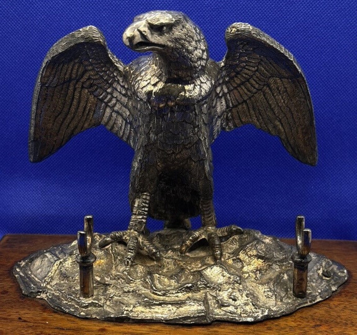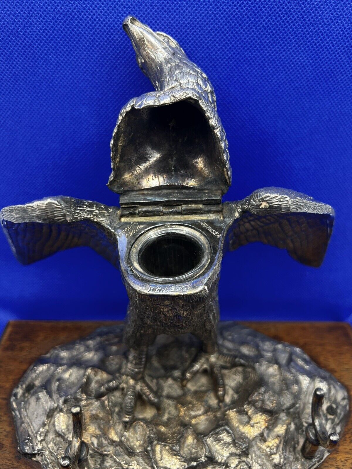A stately eagle with outspread wings stands on rocky terrain behind a pen holder. The eagle’s anatomy and feathers are displayed in detail. His head is hinged, opening to the inkwell.