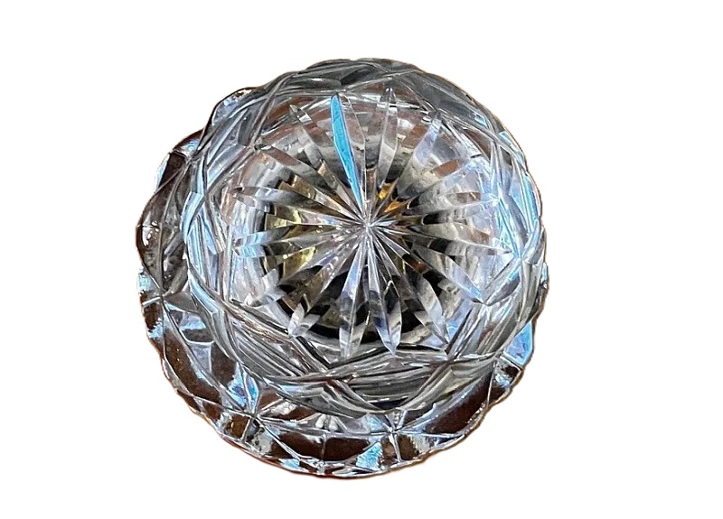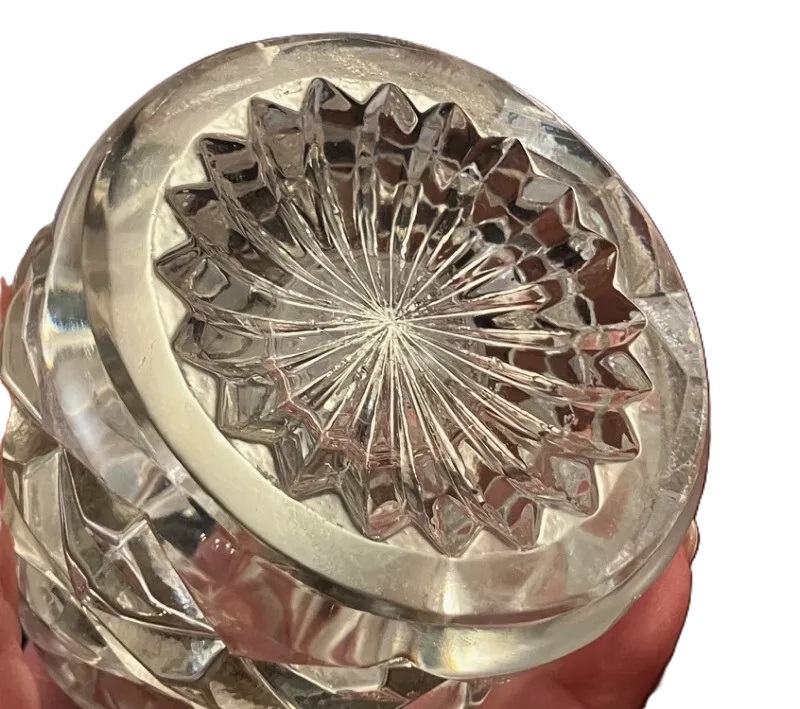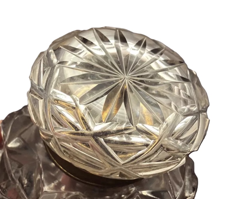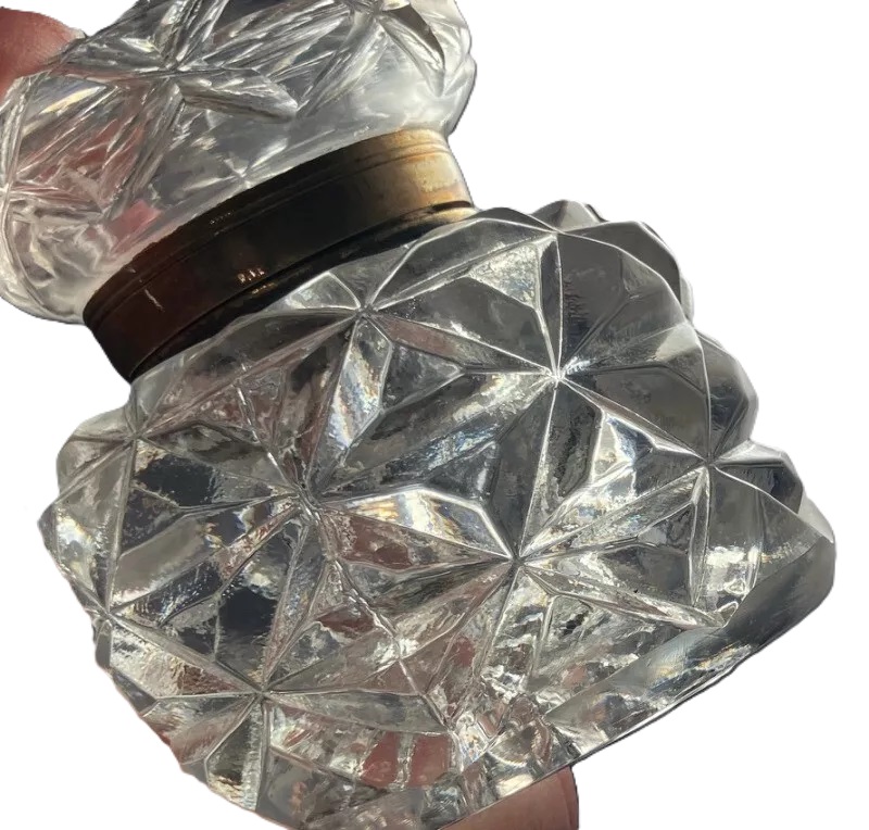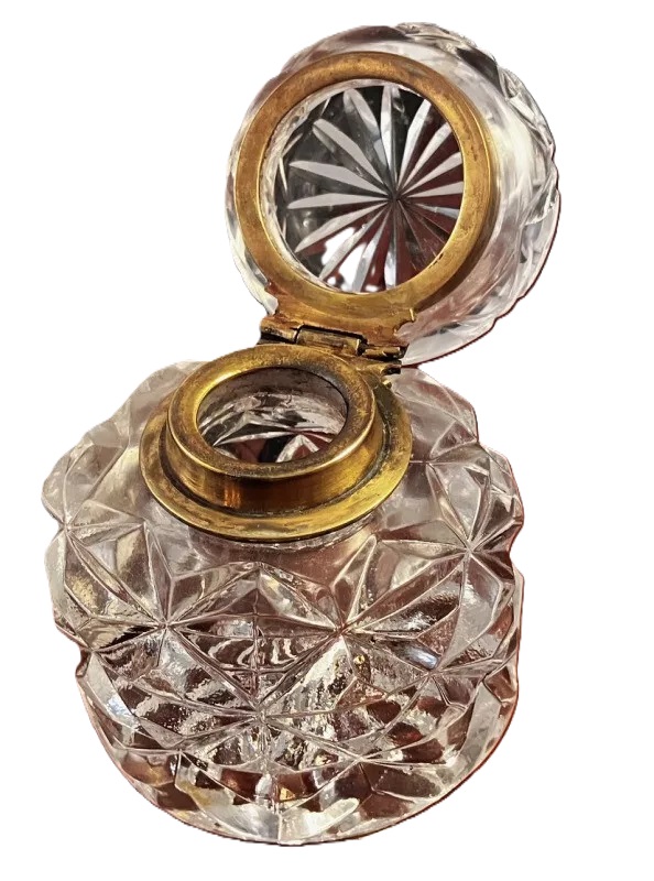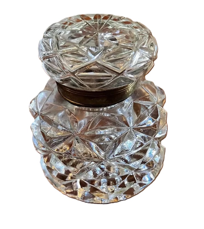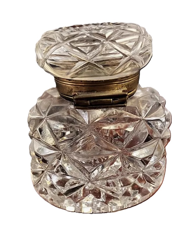This early American pressed glass (EAPG) inkwell was molded in a deep mitered diamond, oversized daisy or giant flattened sawtooth type pattern. It has brass neck bands hinged at the rear. The base is concave with a 24-point starburst. The lid is a flattened pillow form with a center starburst ringed by divided triangles.