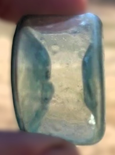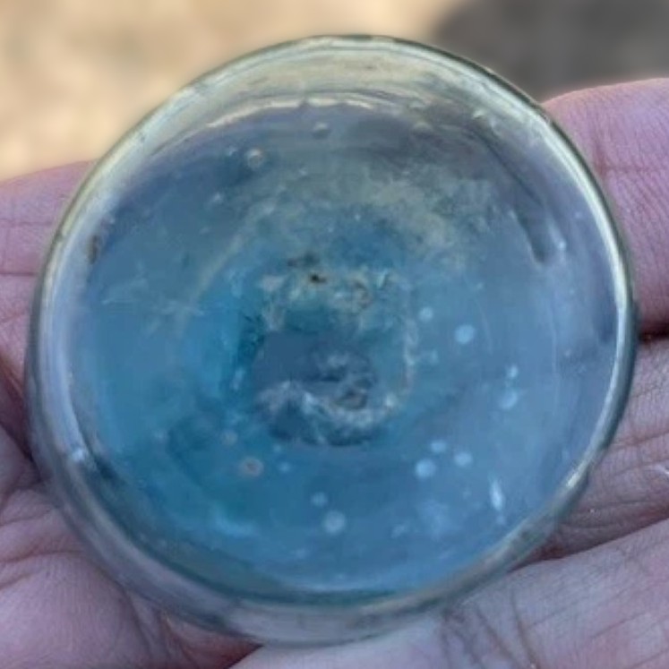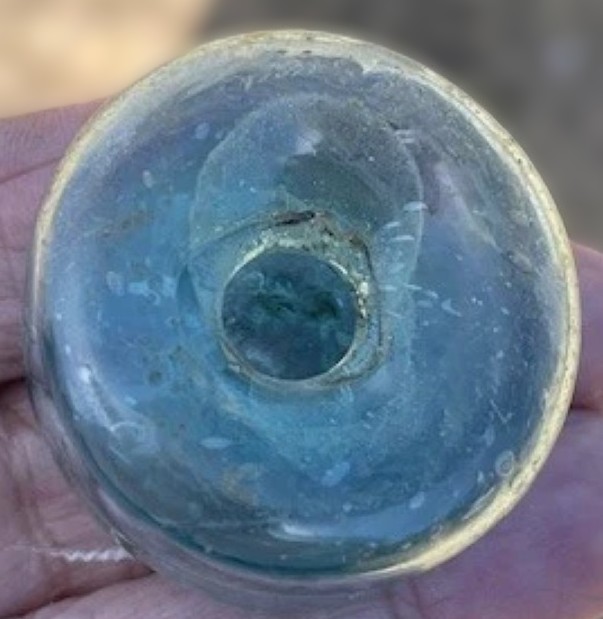 Type: Early Free-Blown Open Pontil Ink Bottle Date: c. 1780–1820 Origin: Likely English or early American (e.g., Wistarburgh or early Stiegel-type) Characteristics: Pale aqua/mint green; thin, delicate “flint-like” walls; high seed count (“discoloration”) at the rim; sharp open pontil. Context: Dug in Charleston, S.C. (1760s site).