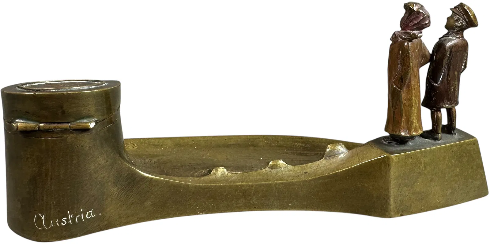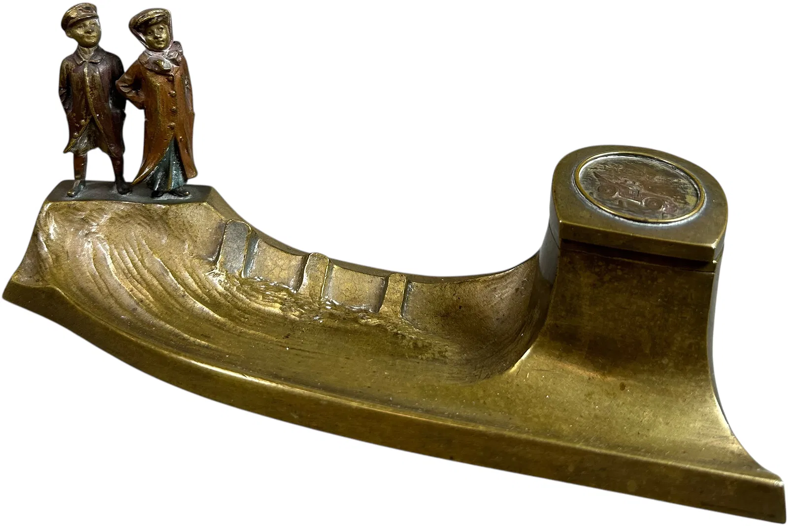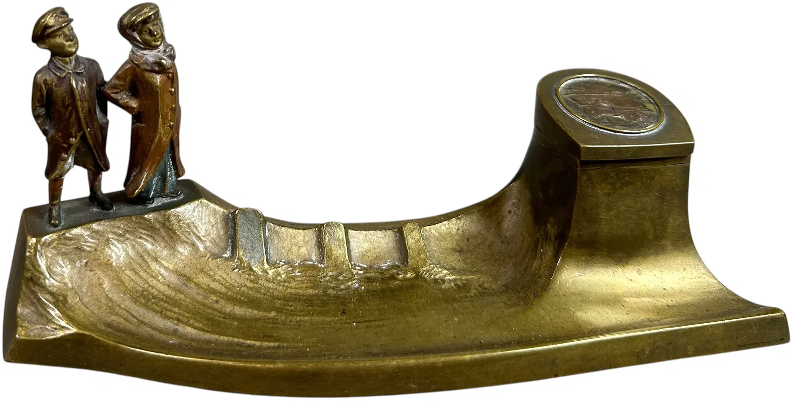 This inkstand captures the spirit of the early days of motoring. The inkstand’s base is made of bronze and features an oval-shaped pen tray. The inkwell itself has a hinged lid, which is embossed with an image of a vintage motor car, complete with spoked wheels and an open top. The inkstand is marked “Austria”.