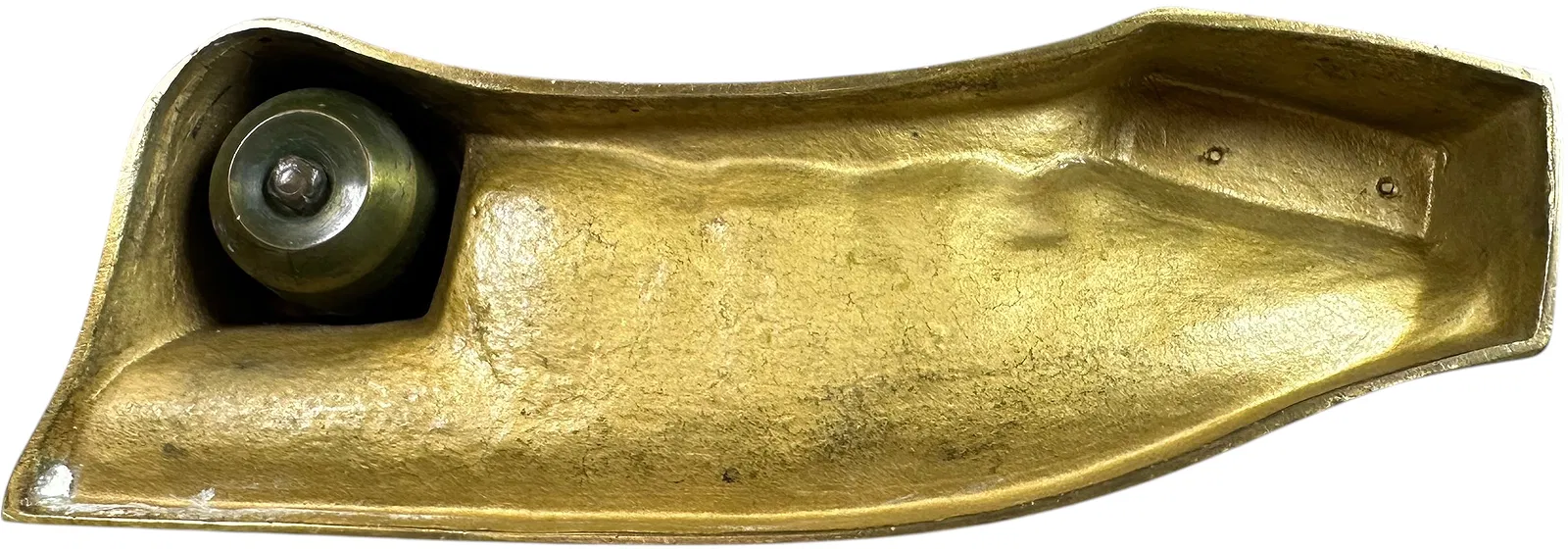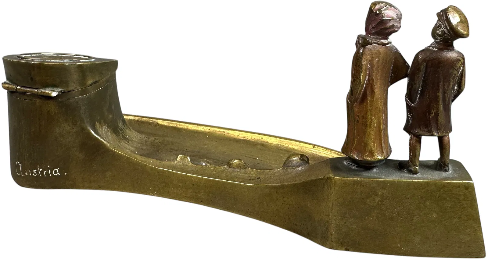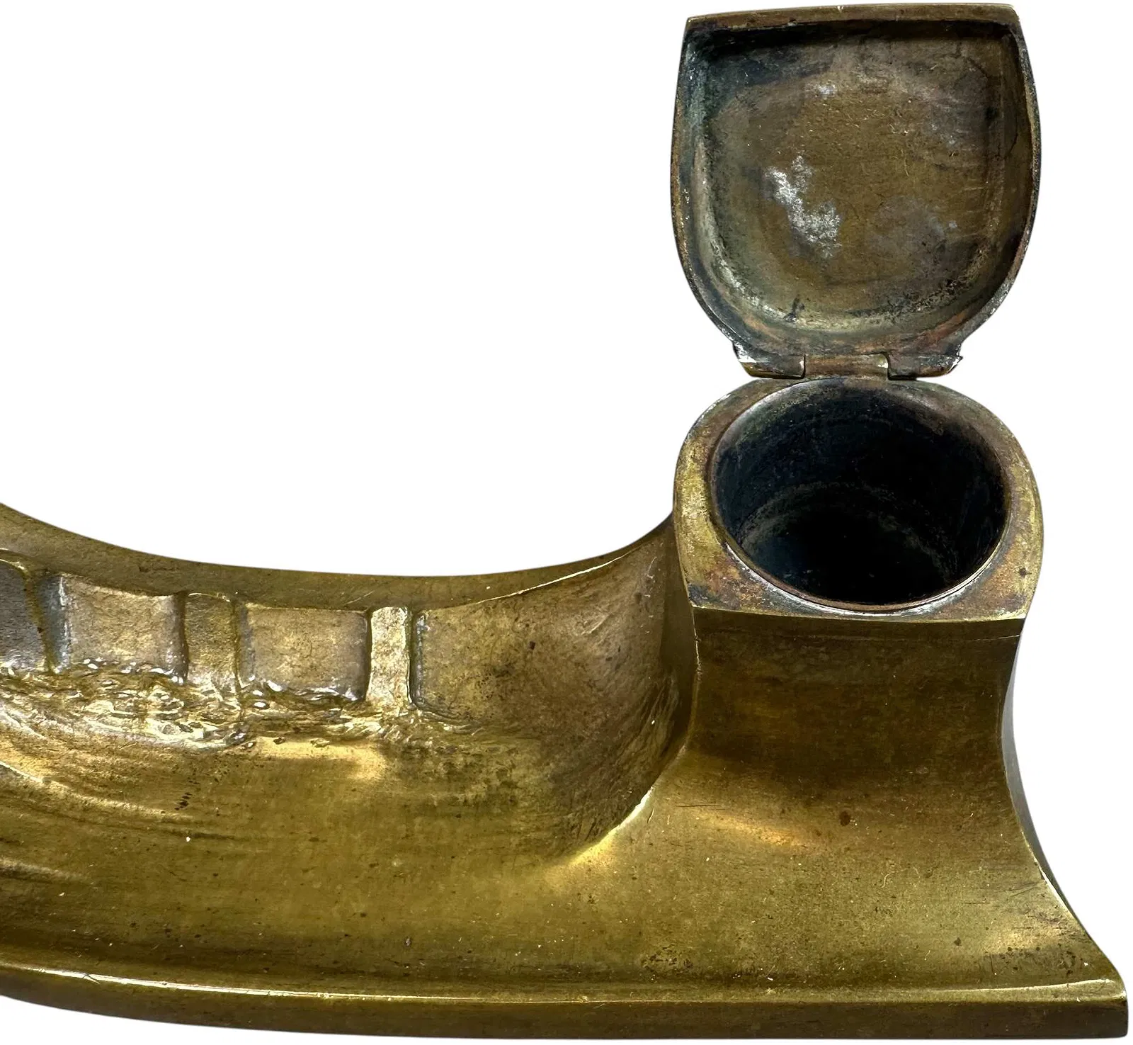 This inkstand captures the spirit of the early days of motoring. The inkstand’s base is made of bronze and features an oval-shaped pen tray. The inkwell itself has a hinged lid, which is embossed with an image of a vintage motor car, complete with spoked wheels and an open top. The inkstand is marked “Austria”.