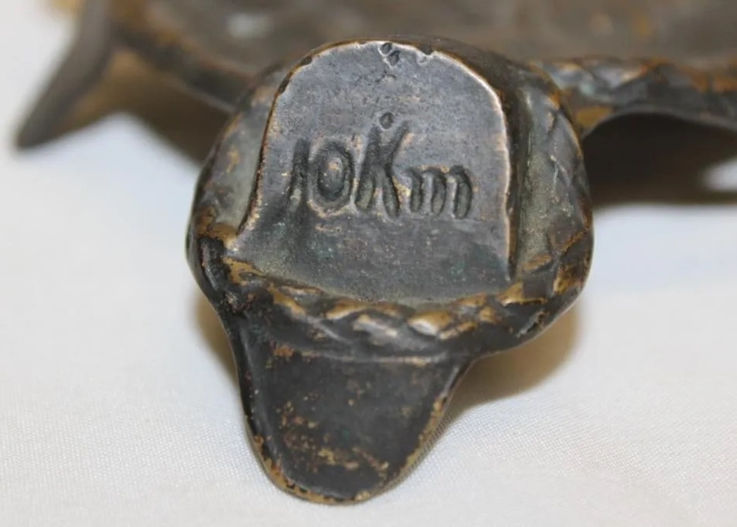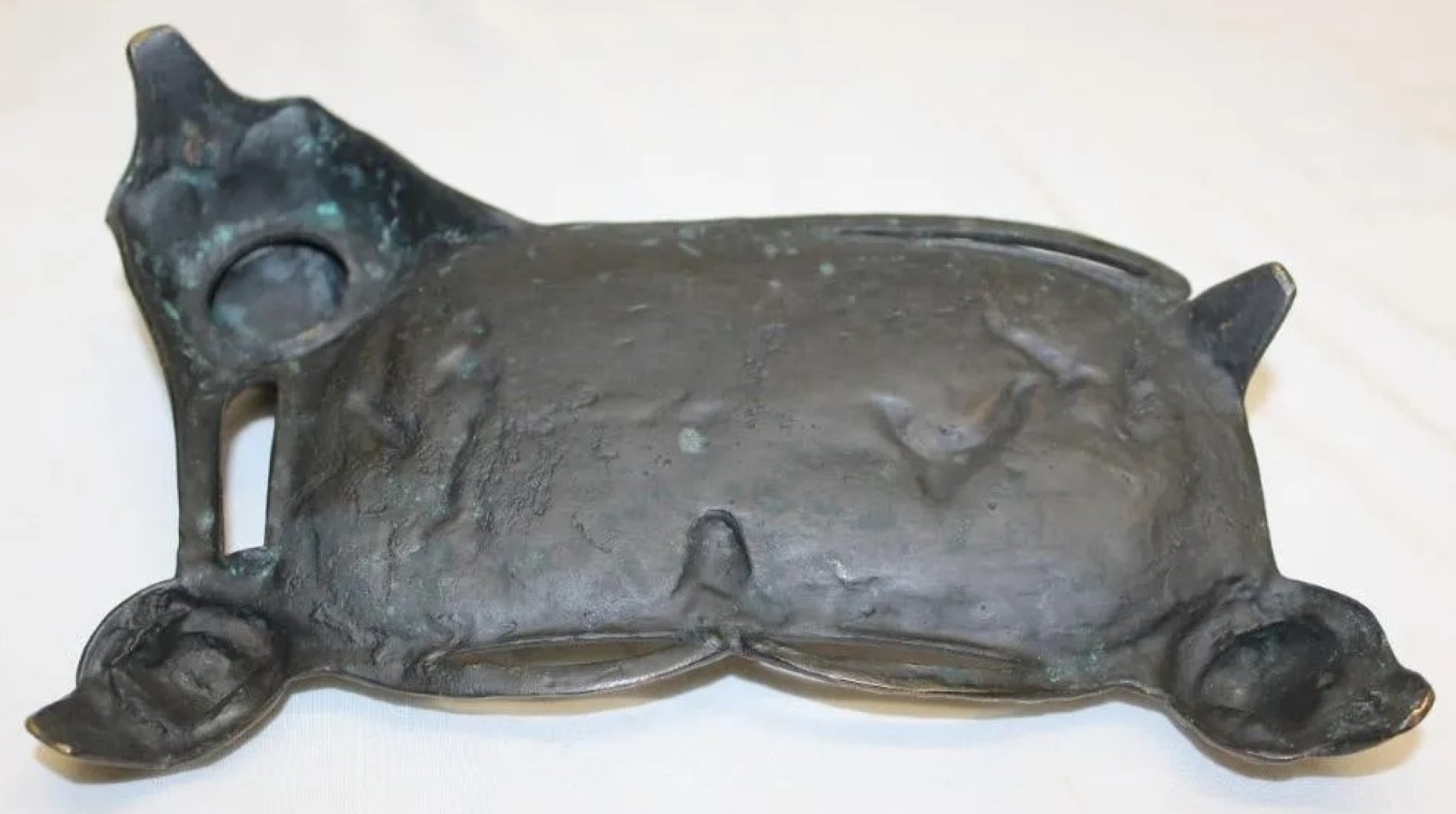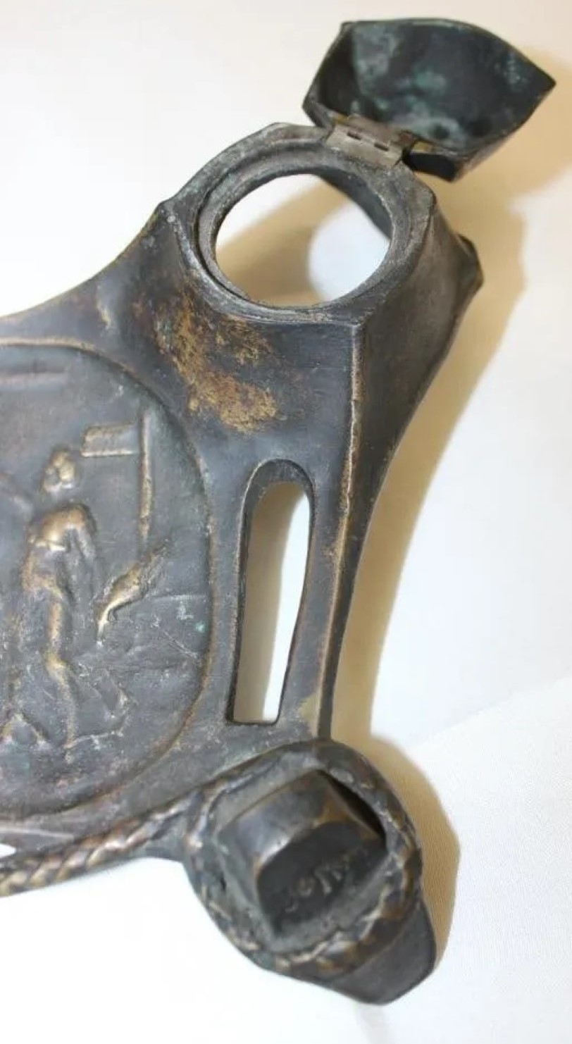 A motorist is driving an early automobile towards a female figure holding a torch, perhaps Lady Liberty. Mileage markers decorate the front of the pen tray. The inkwell is missing its insert.