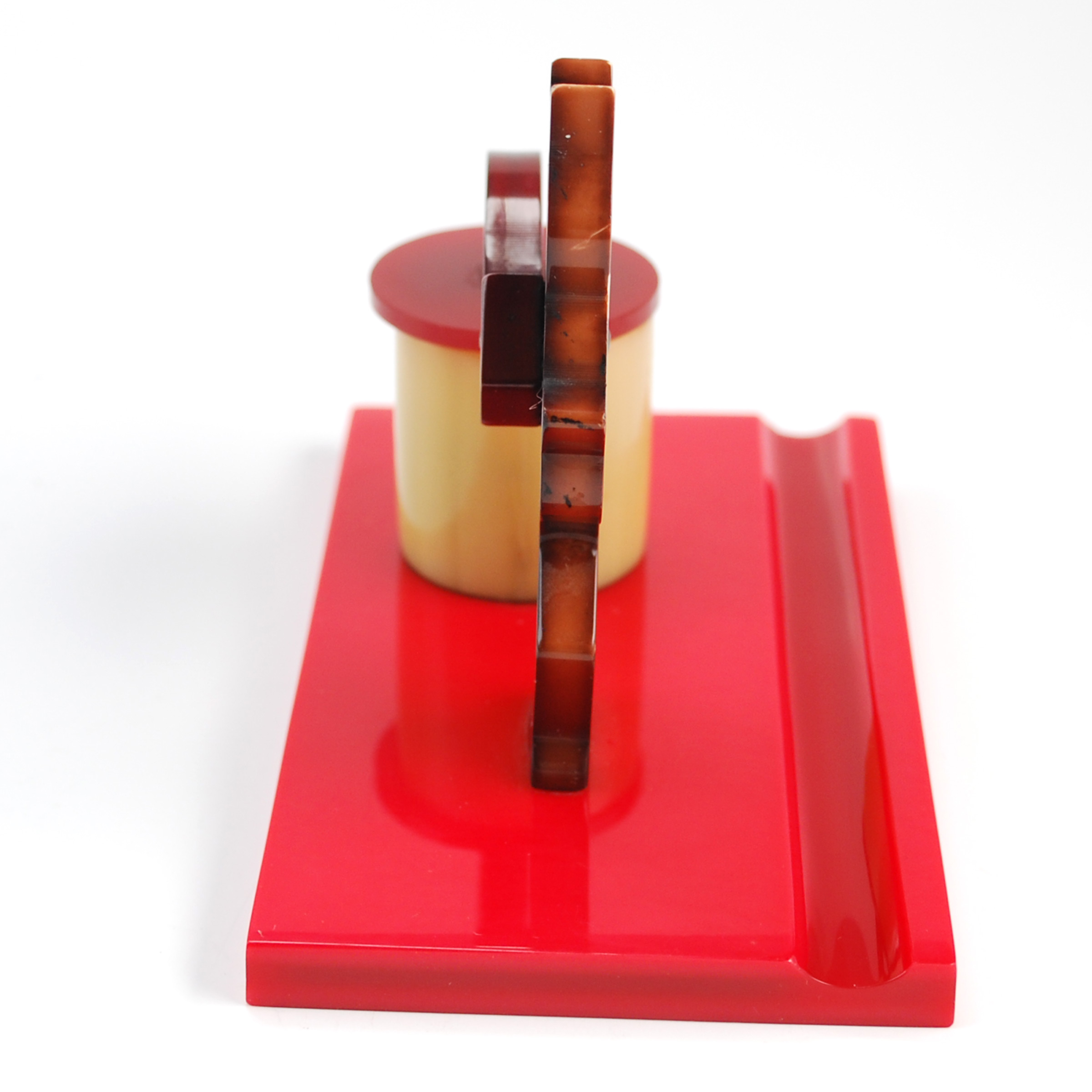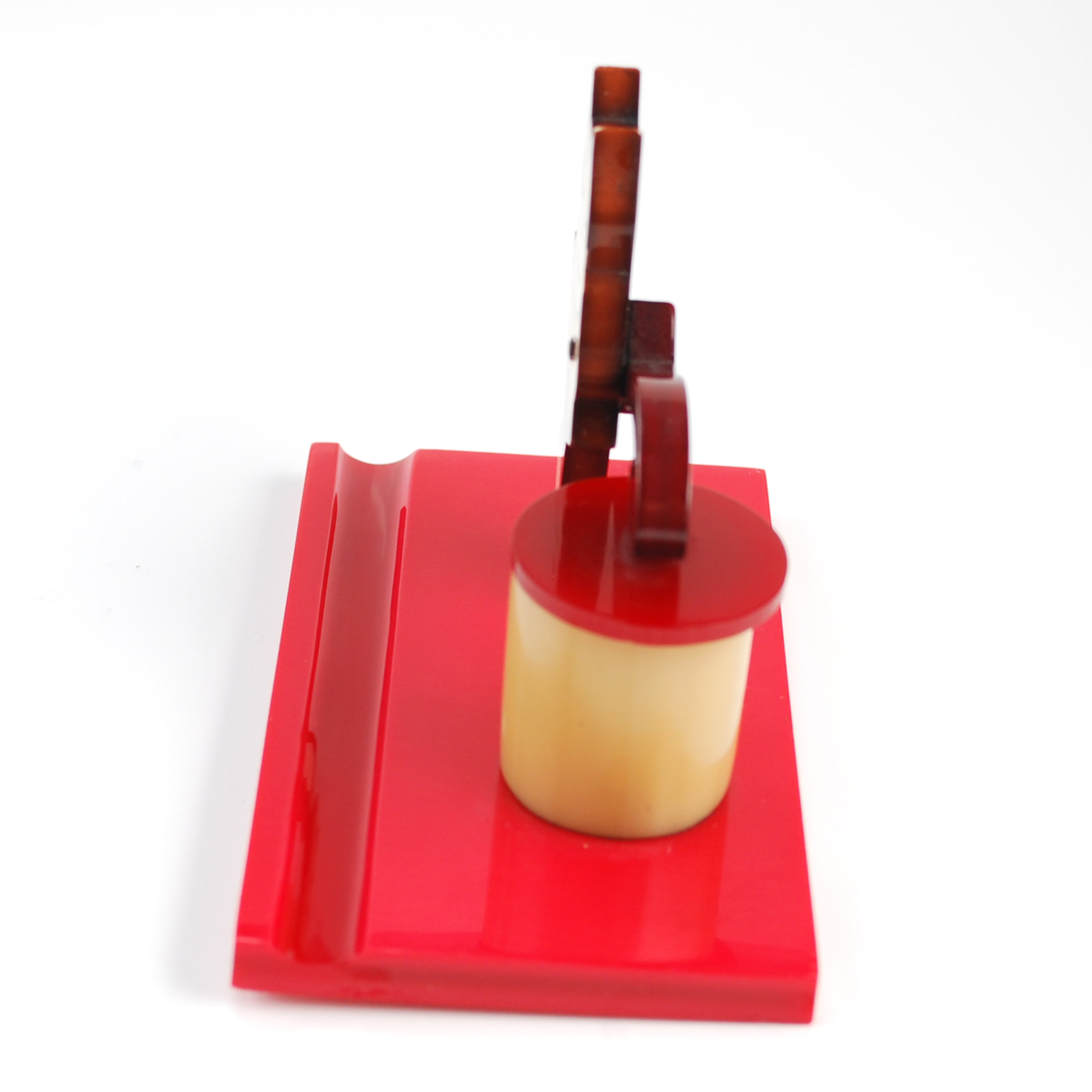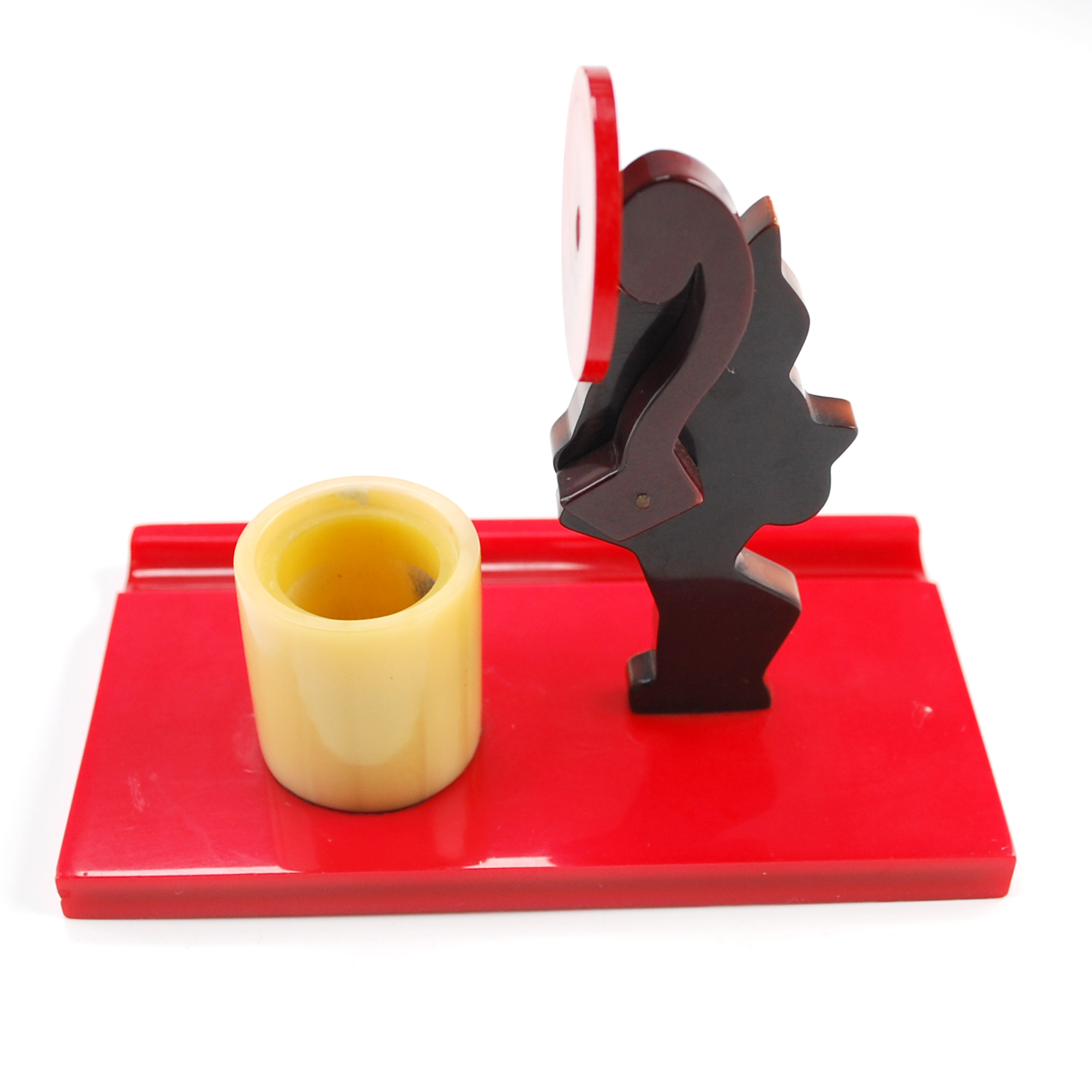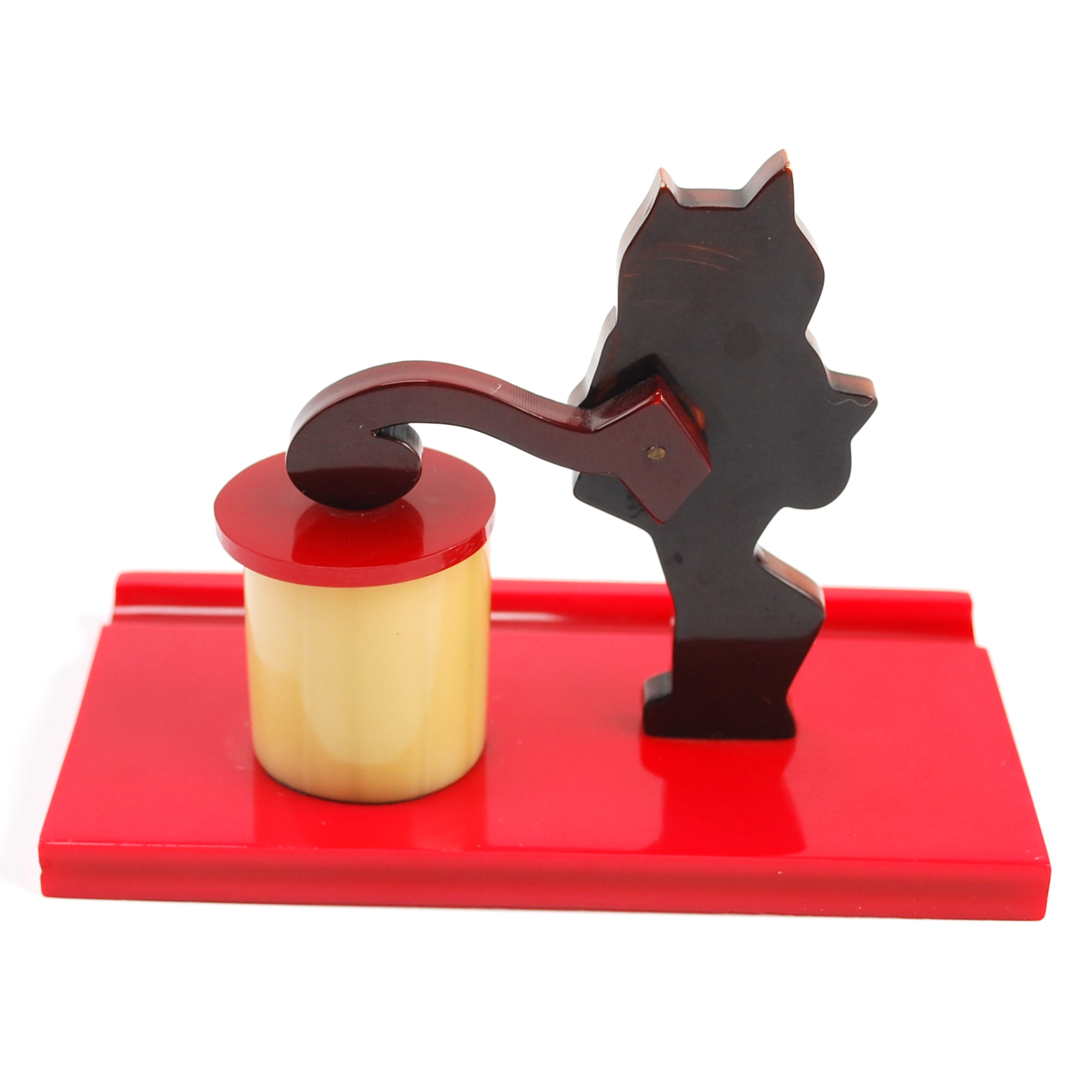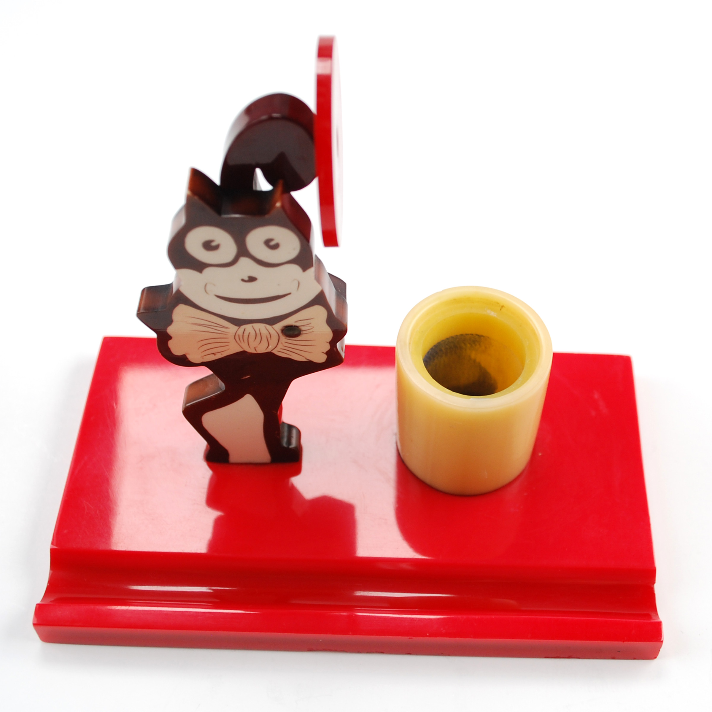 This fun inkwell is made of an early, light plastic – not bakelite. It features a cat who looks very much like the cartoon character Felix the Cat. I believe it was meant to depict this character, although is likely not an official version. The cat’s tail is attached to the plastic inkwell lid. When the tail is up, the lid is open. Because of the character and method of opening the lid, I believe this inkwell was meant for children. What child could resist using this inkwell and of course, then writing?!