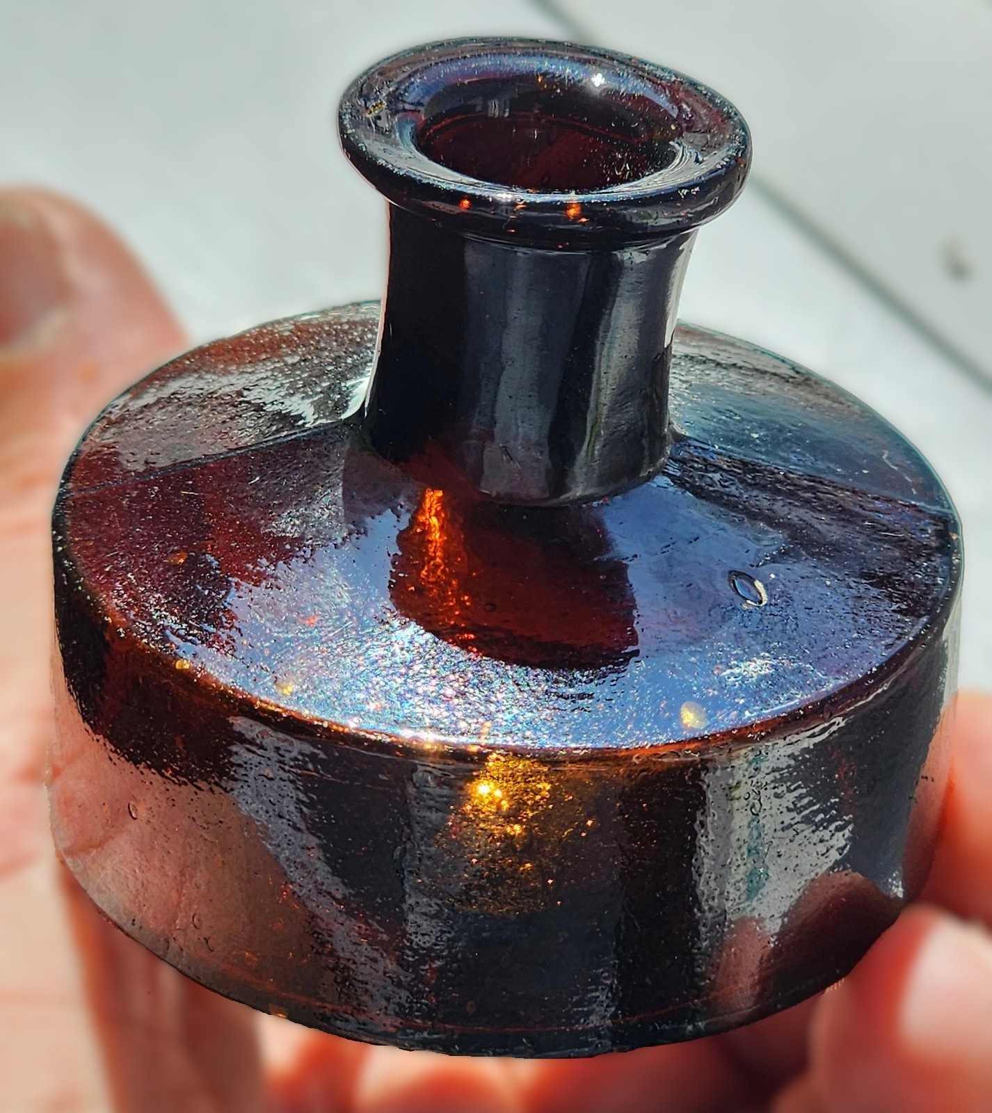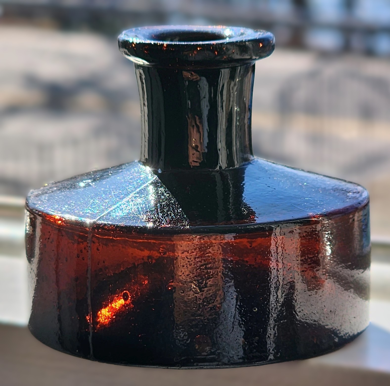 This early 19th-century ink bottle features a sophisticated three-piece mold construction, a form less common than the standard octagonal or “umbrella” shapes of the era. The glass is a rare and deeply saturated Amber Puce, showing brilliant flashes of violet and mahogany when held to the light.