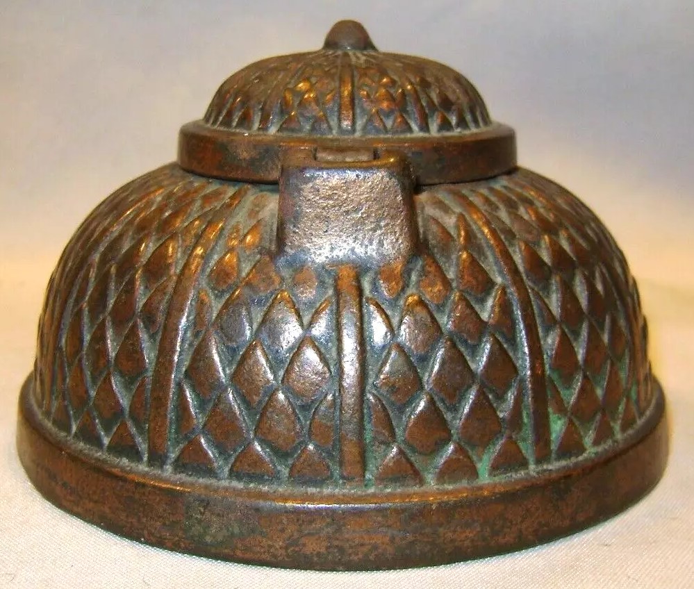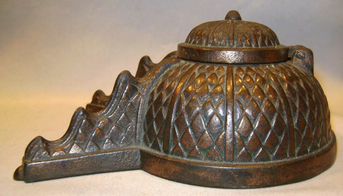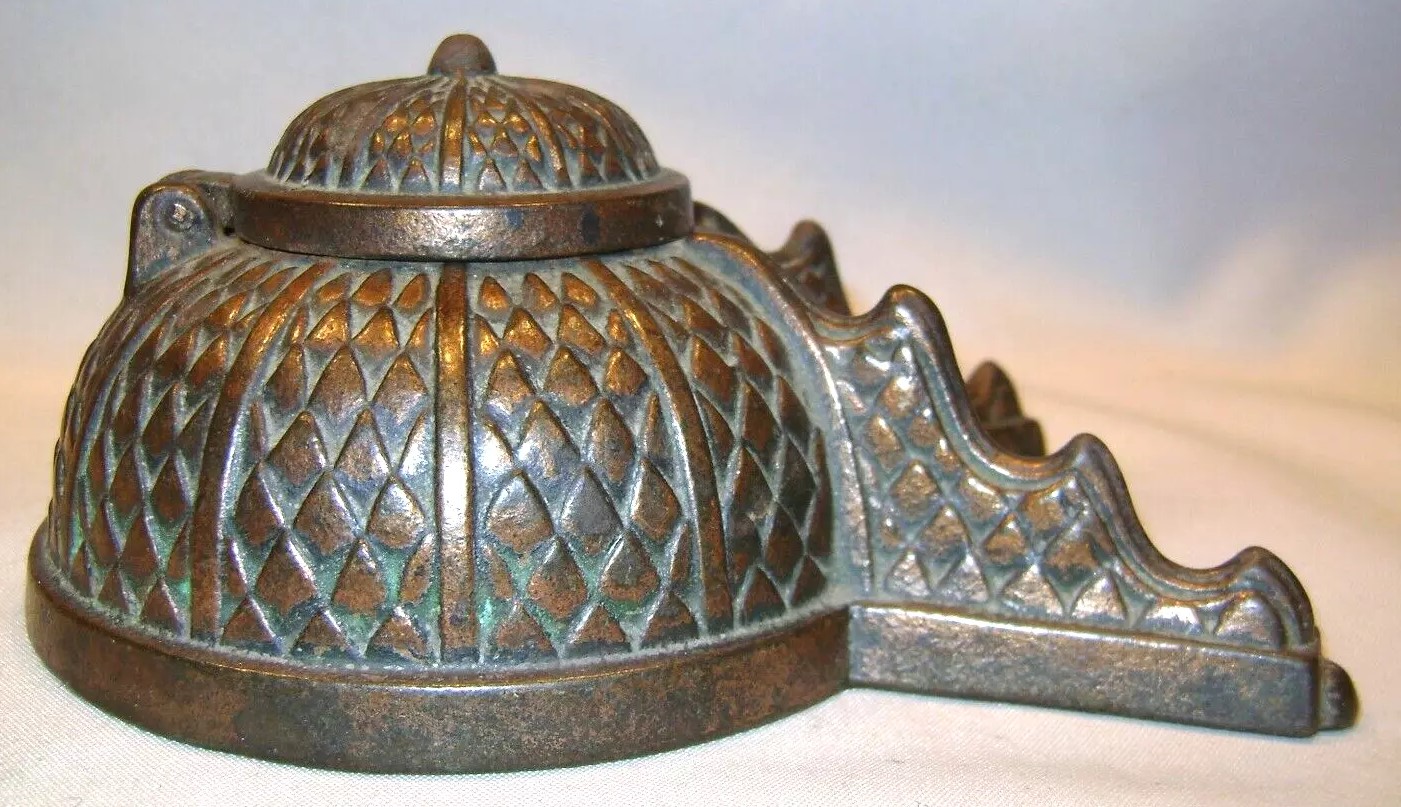 This cast iron inkwell features a hinged lid covering a domed body adorned with a diamond pattern. The stepped pen rack across the front is designed to hold three pens.