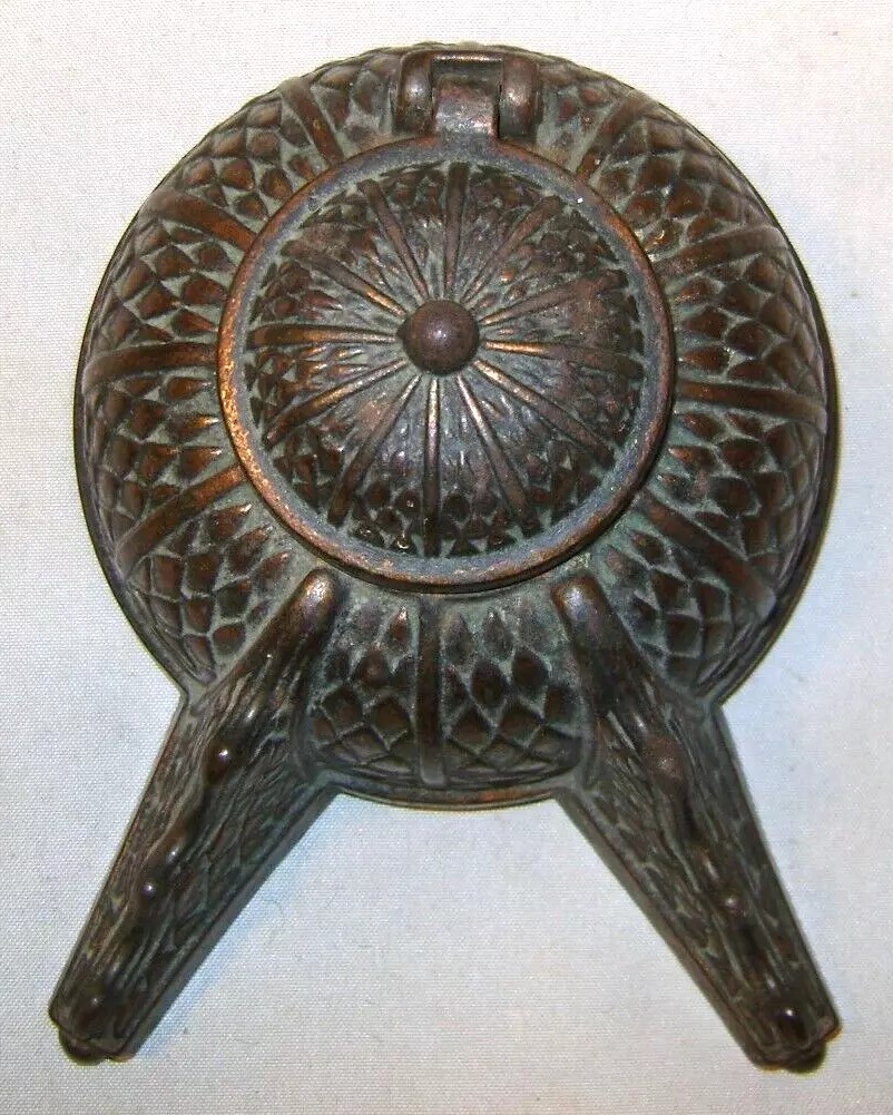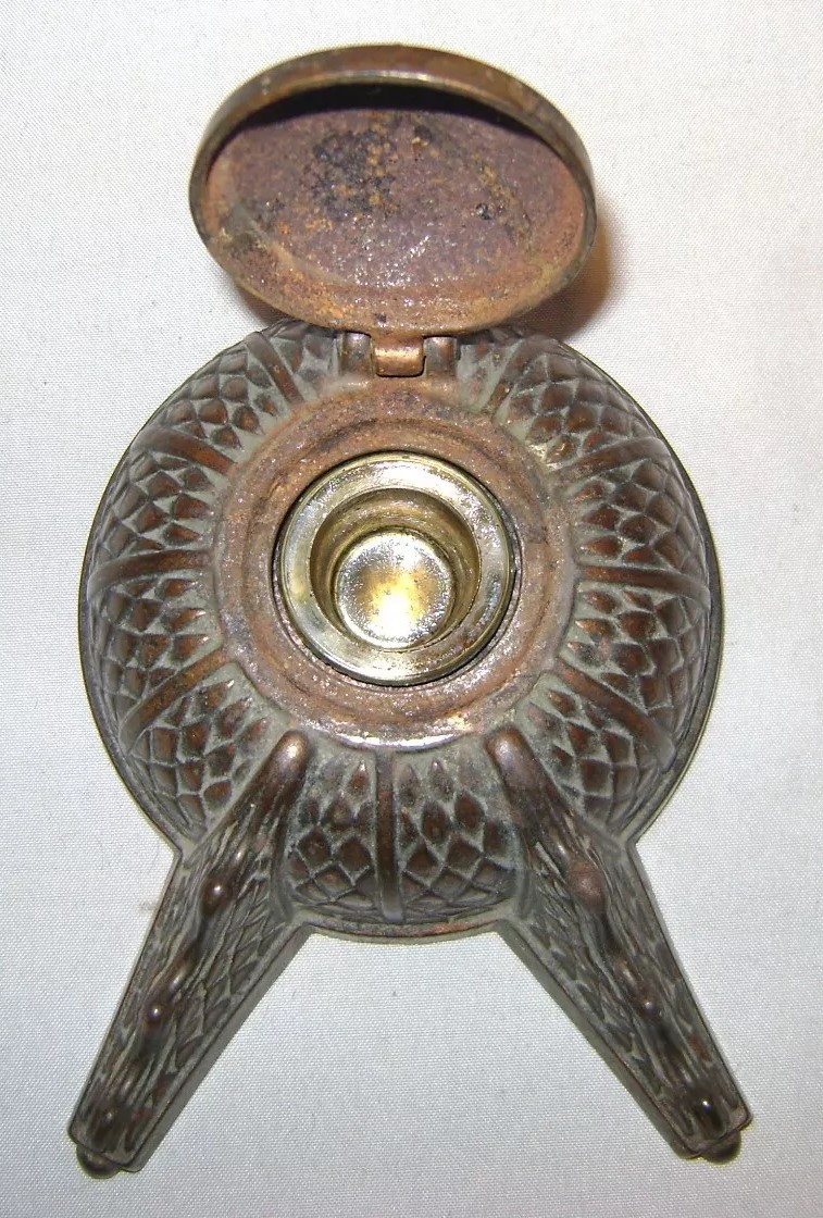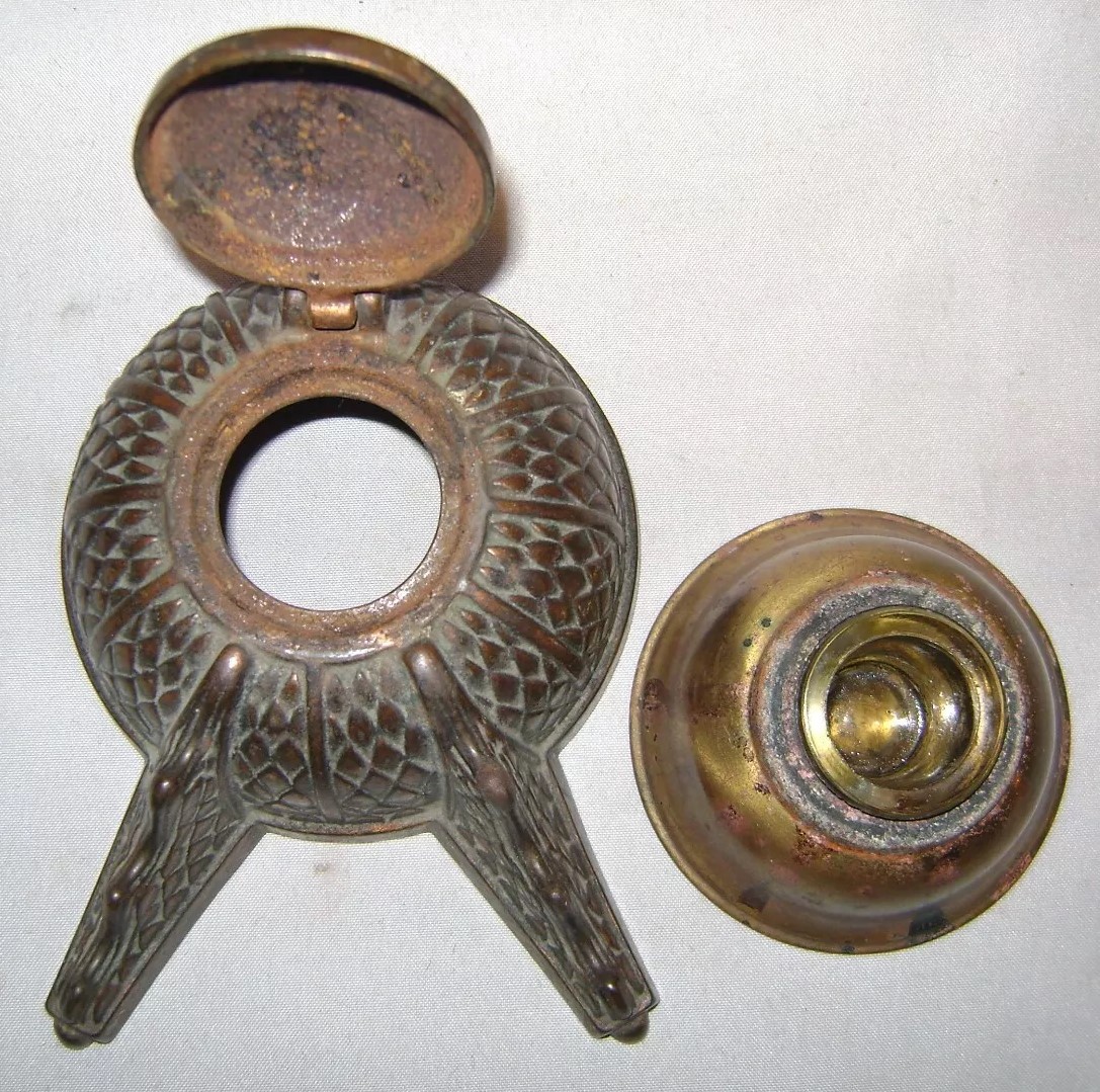 The “Eastlake” style, named after Charles Eastlake, an English architect and furniture designer, was popular in the late 19th century. This design movement is characterized by its emphasis on geometric shapes, intricate carvings, and a preference for natural materials. Eastlake style often features incised lines, low-relief carvings, and a more restrained, less ornate approach compared to earlier Victorian styles. This inkwell exemplifies the Eastlake style with its geometric patterns and detailed carvings, reflecting the aesthetic preferences of the period.