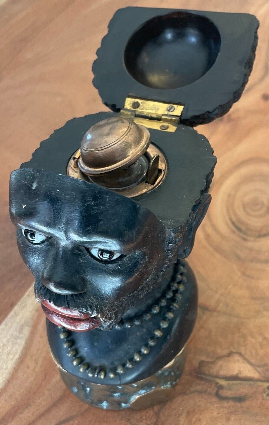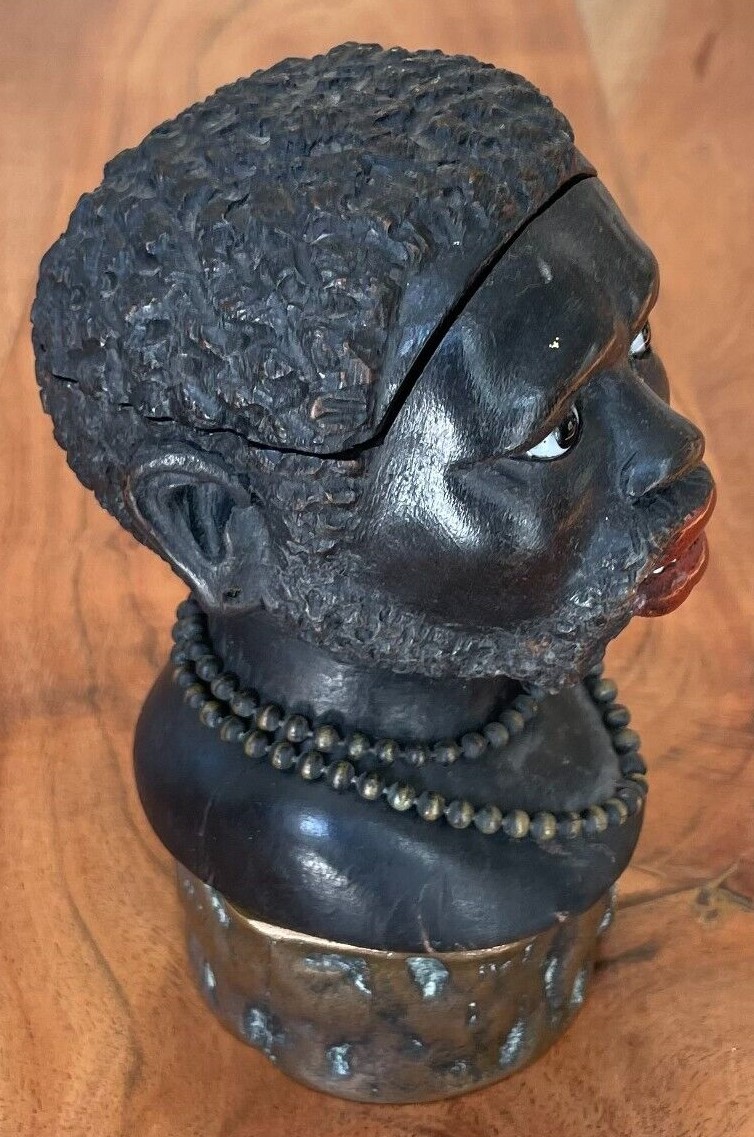 The ebony bust of an African woman with glass eyes on a bronze base. The top of her head is hinged at the hairline, opening to an inkwell with spring-loaded lid with a release catch.