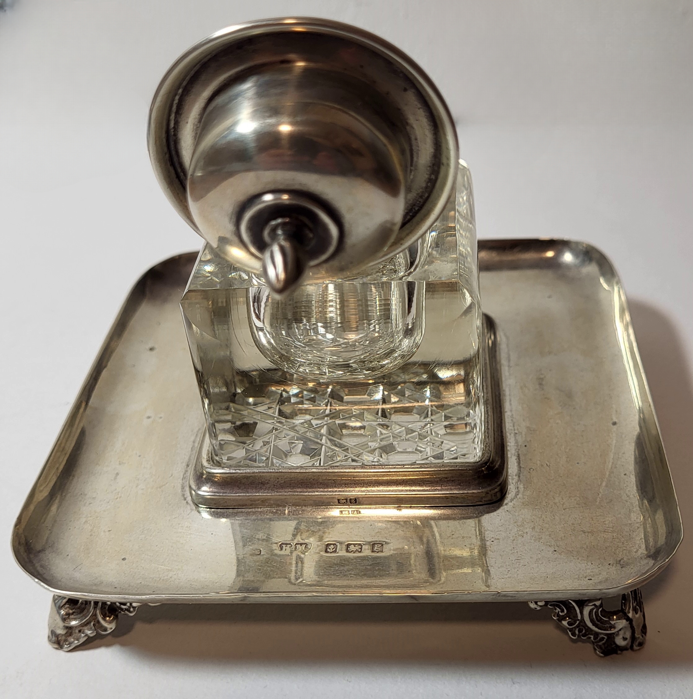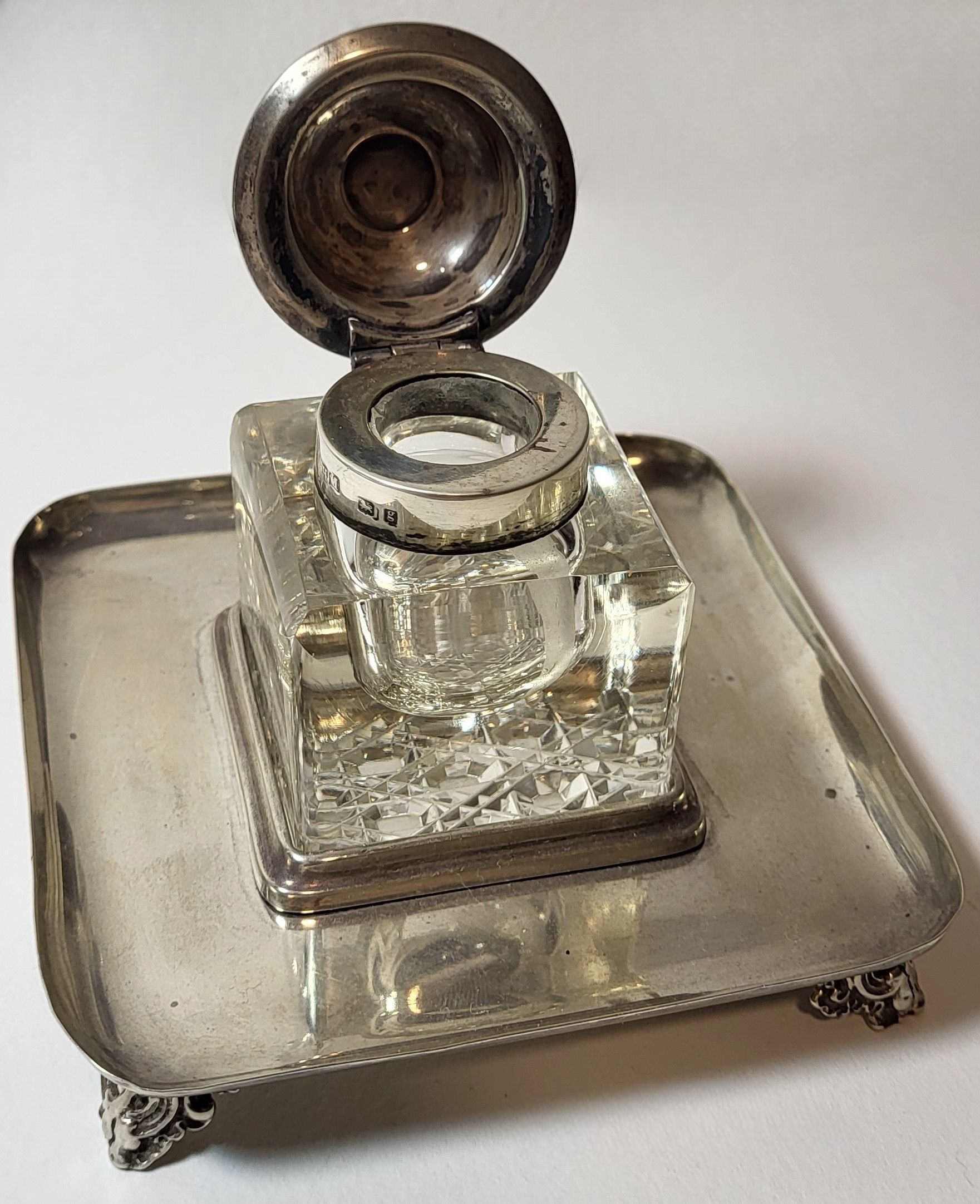 A silver tray standing on four legs and supporting a mounted crystal inkwell with a silver lid.