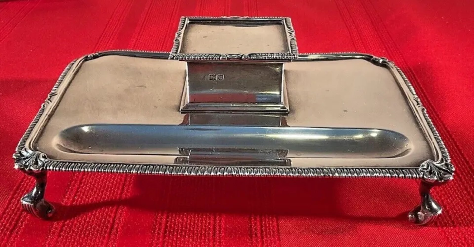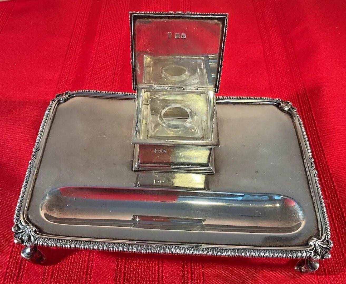 C.S. Harris & Sons of London crafted this sterling silver inkstand in 1909. Edwardian in style, the set includes a sterling silver base and a fitted crystal inkwell.