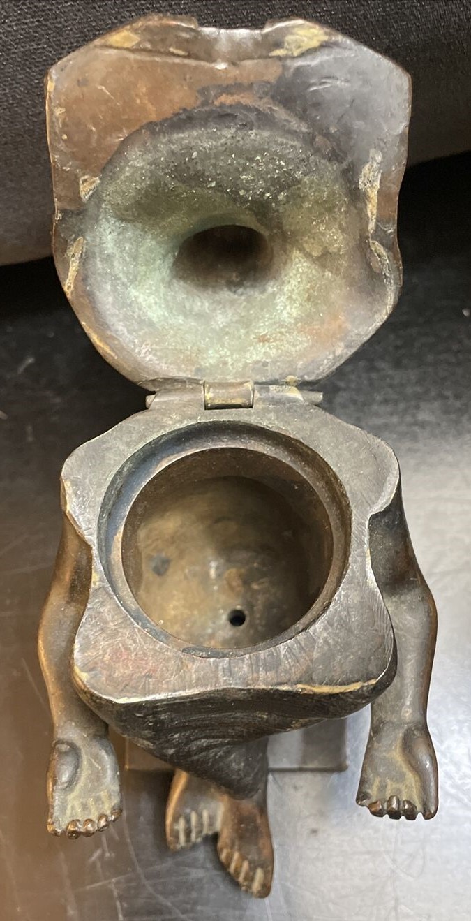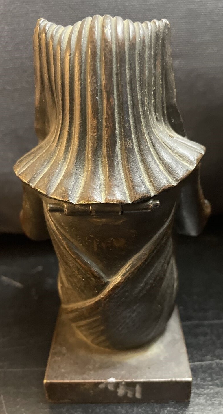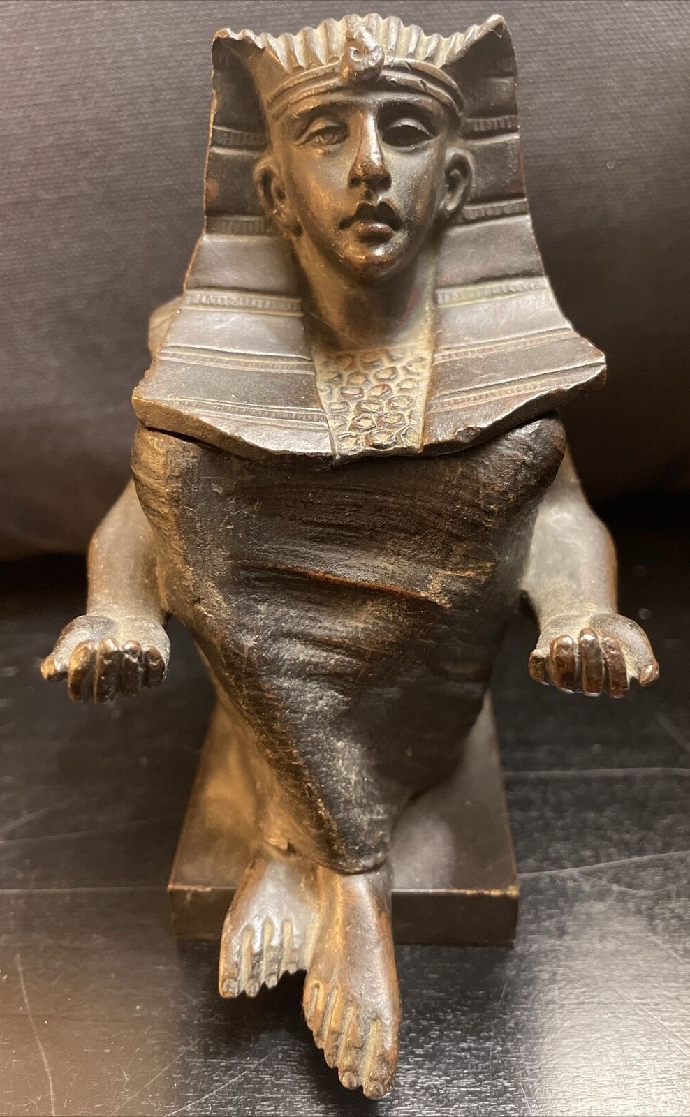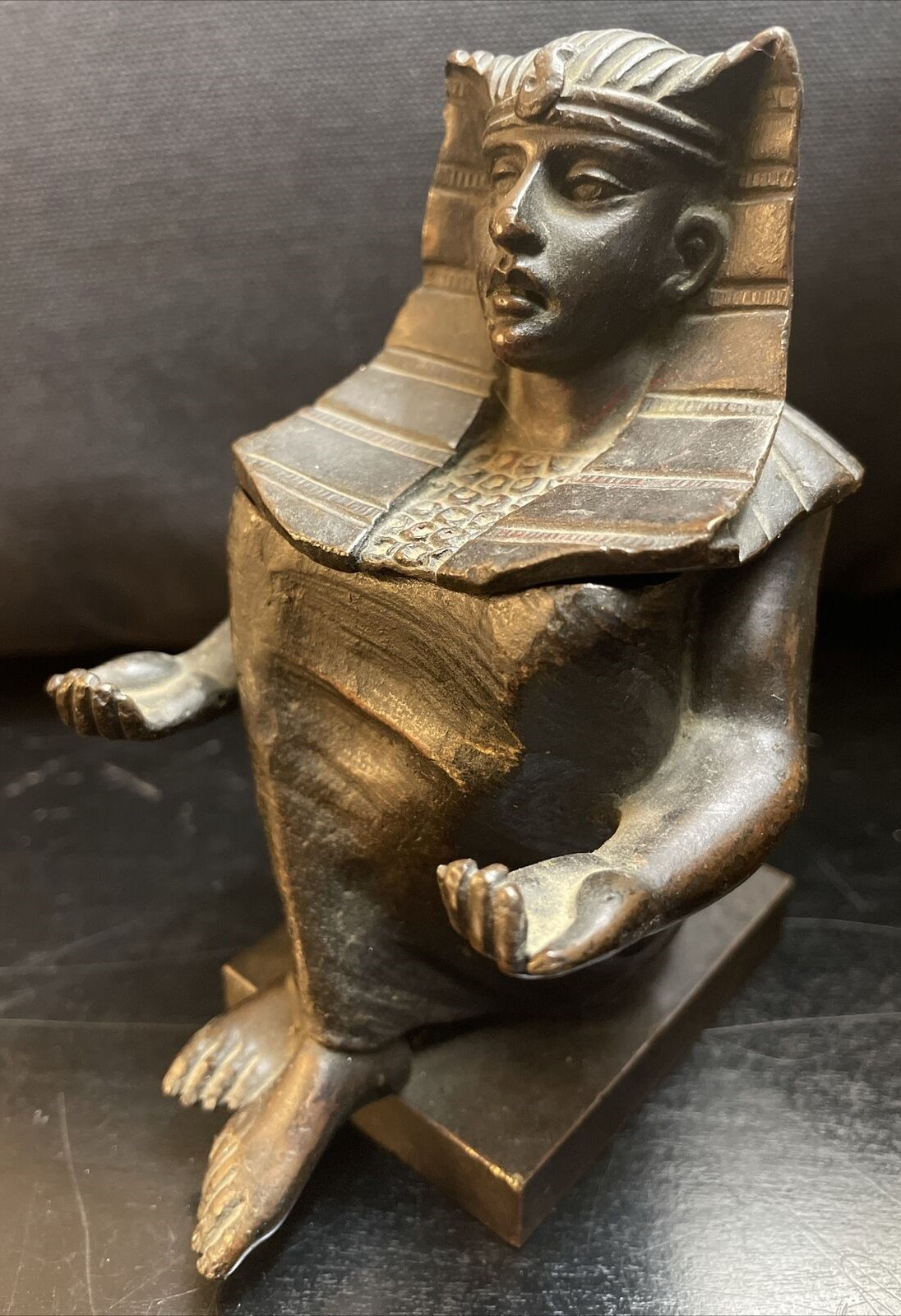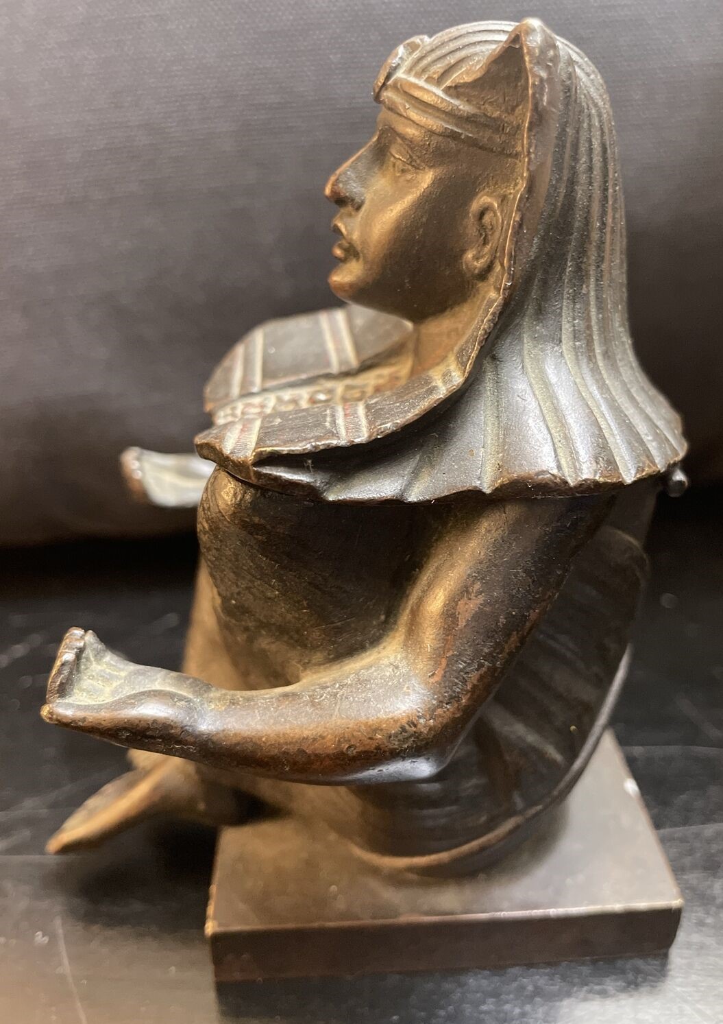 A sitting Pharaoh’s out-stretched hands serve as a pen holder.  His nemes headdress is hinged and opens to access the inkwell (insert missing).