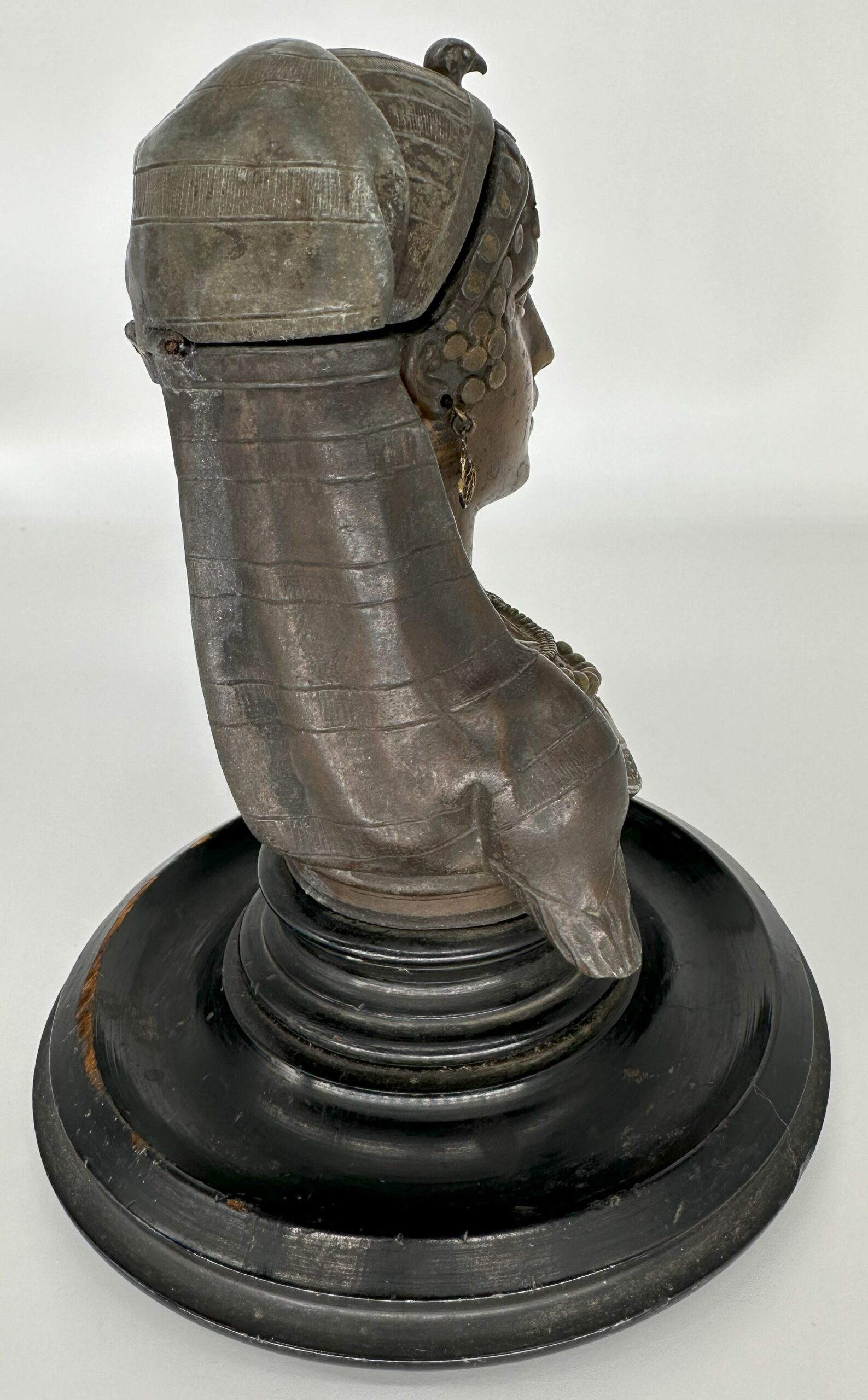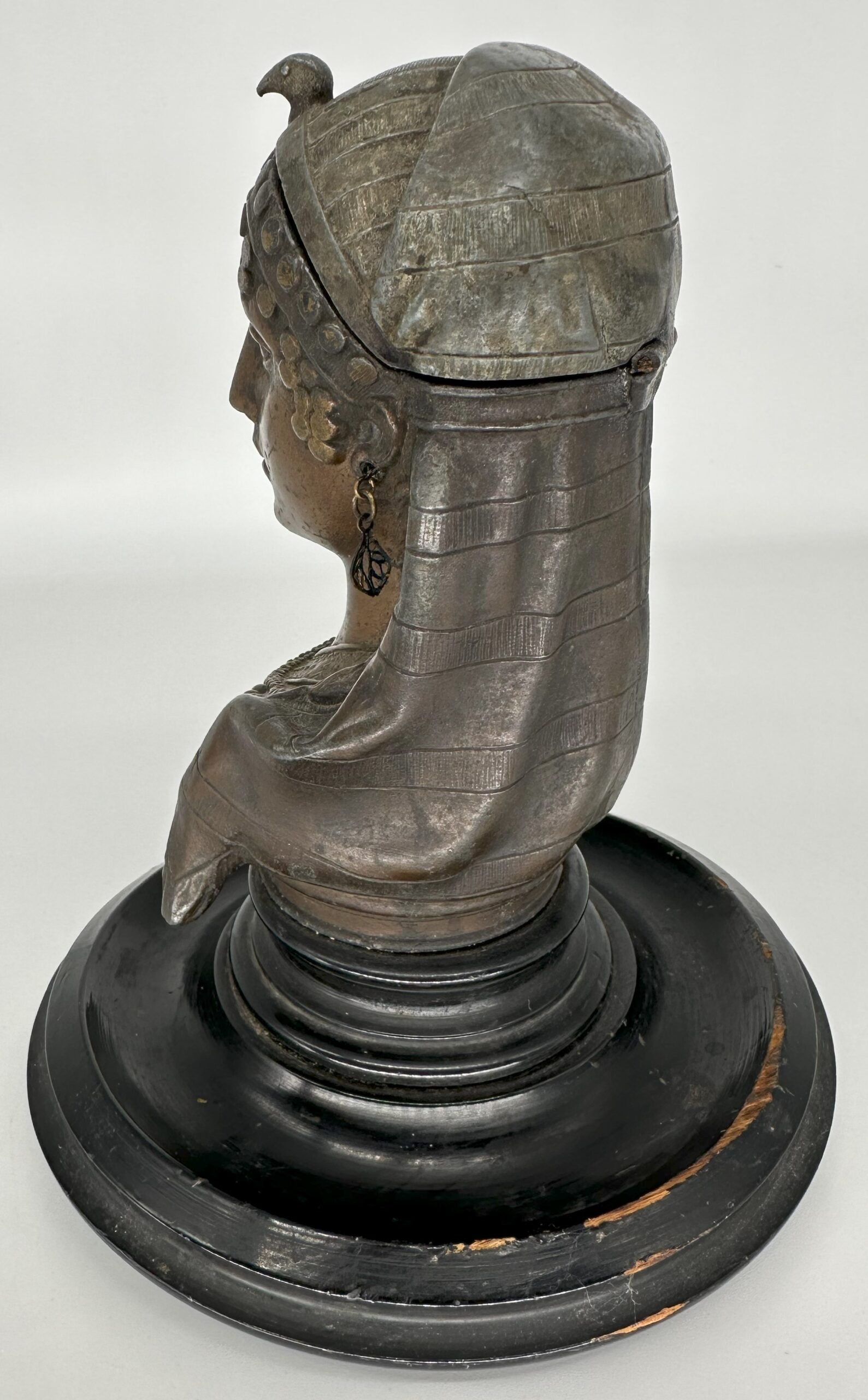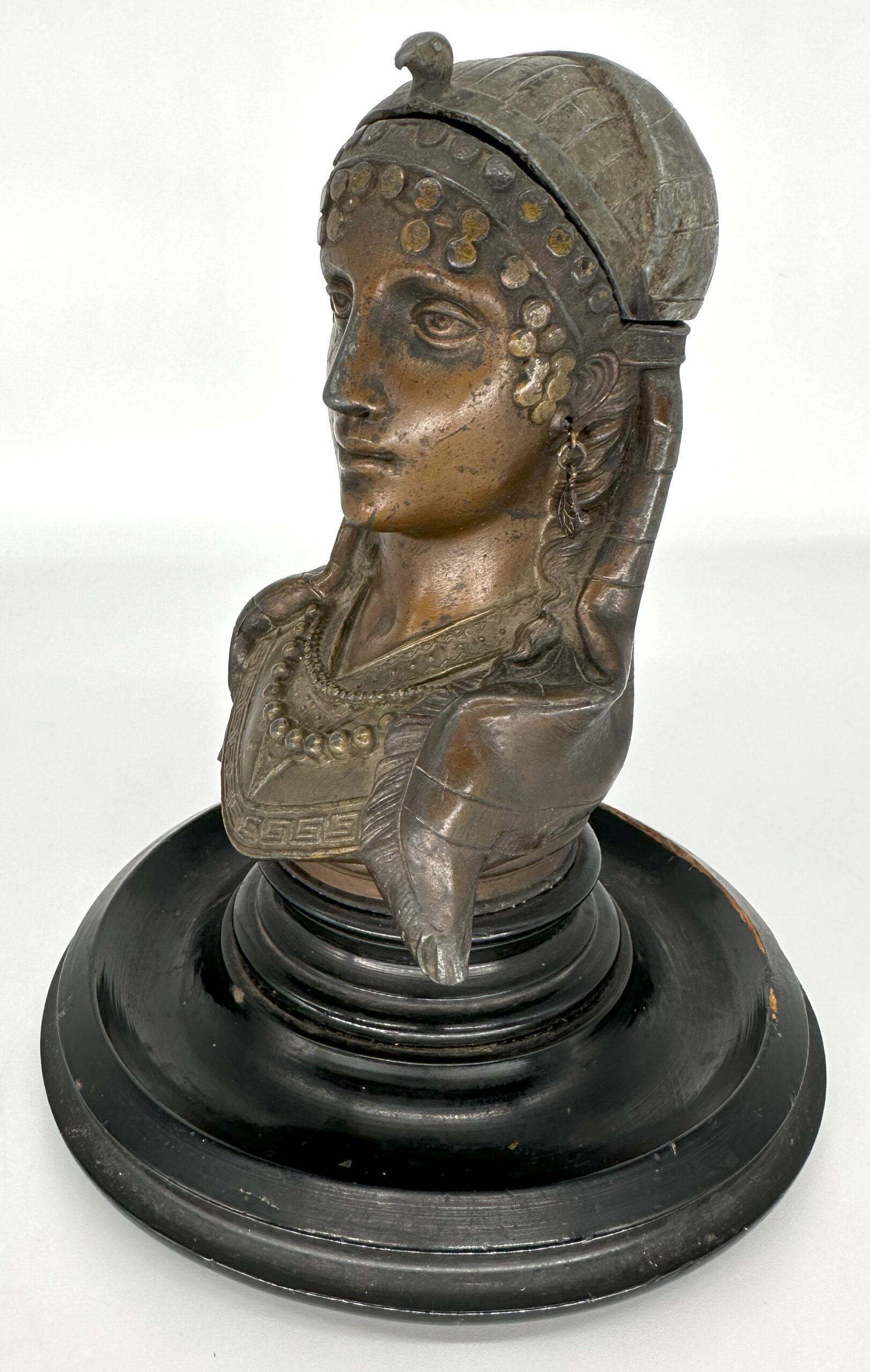This bronzed spelter inkstand features an Egyptian princess wearing the vulture crown headdress. The headdress is hinged and opens to reveal the inkwell. Detailed casting seen in the headdress, necklace, and jewelry which includes dangling earrings. The piece is mounted on a turned wood base.