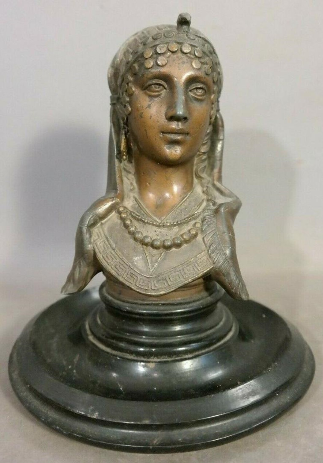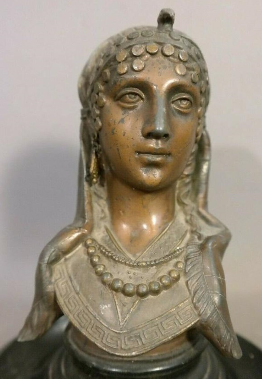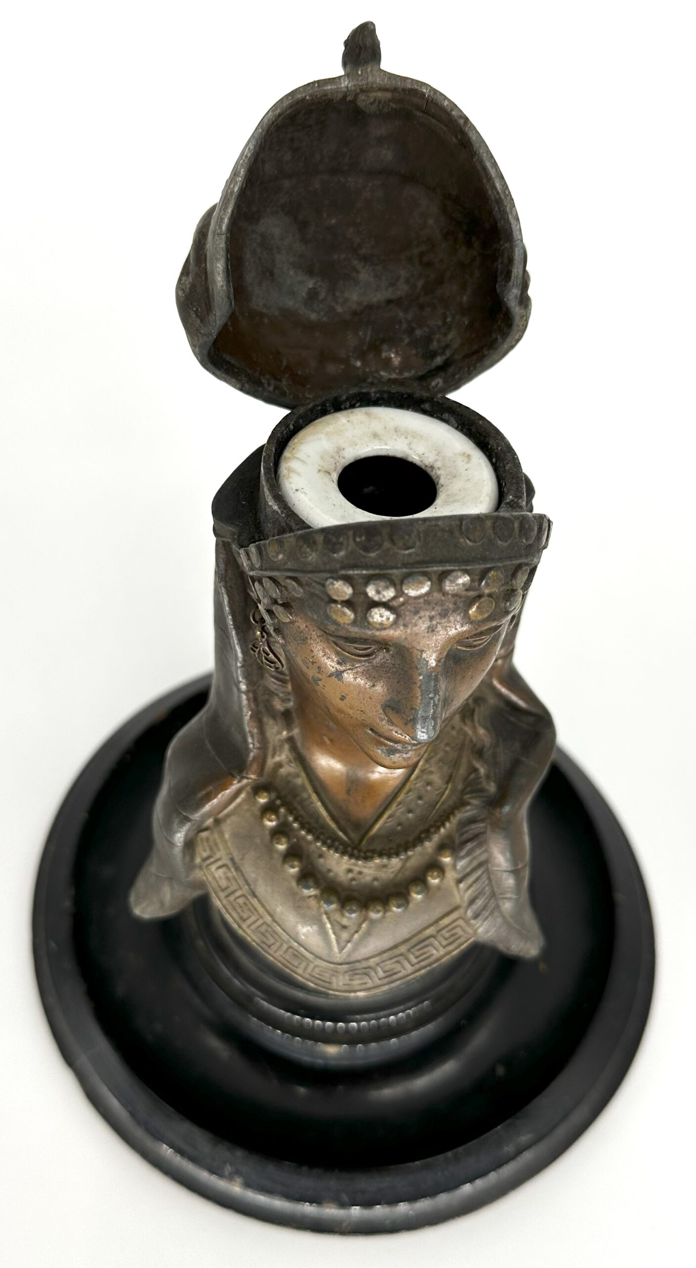 This bronzed spelter inkstand features an Egyptian princess wearing the vulture crown headdress. The headdress is hinged and opens to reveal the inkwell. Detailed casting seen in the headdress, necklace, and jewelry which includes dangling earrings. The piece is mounted on a turned wood base.