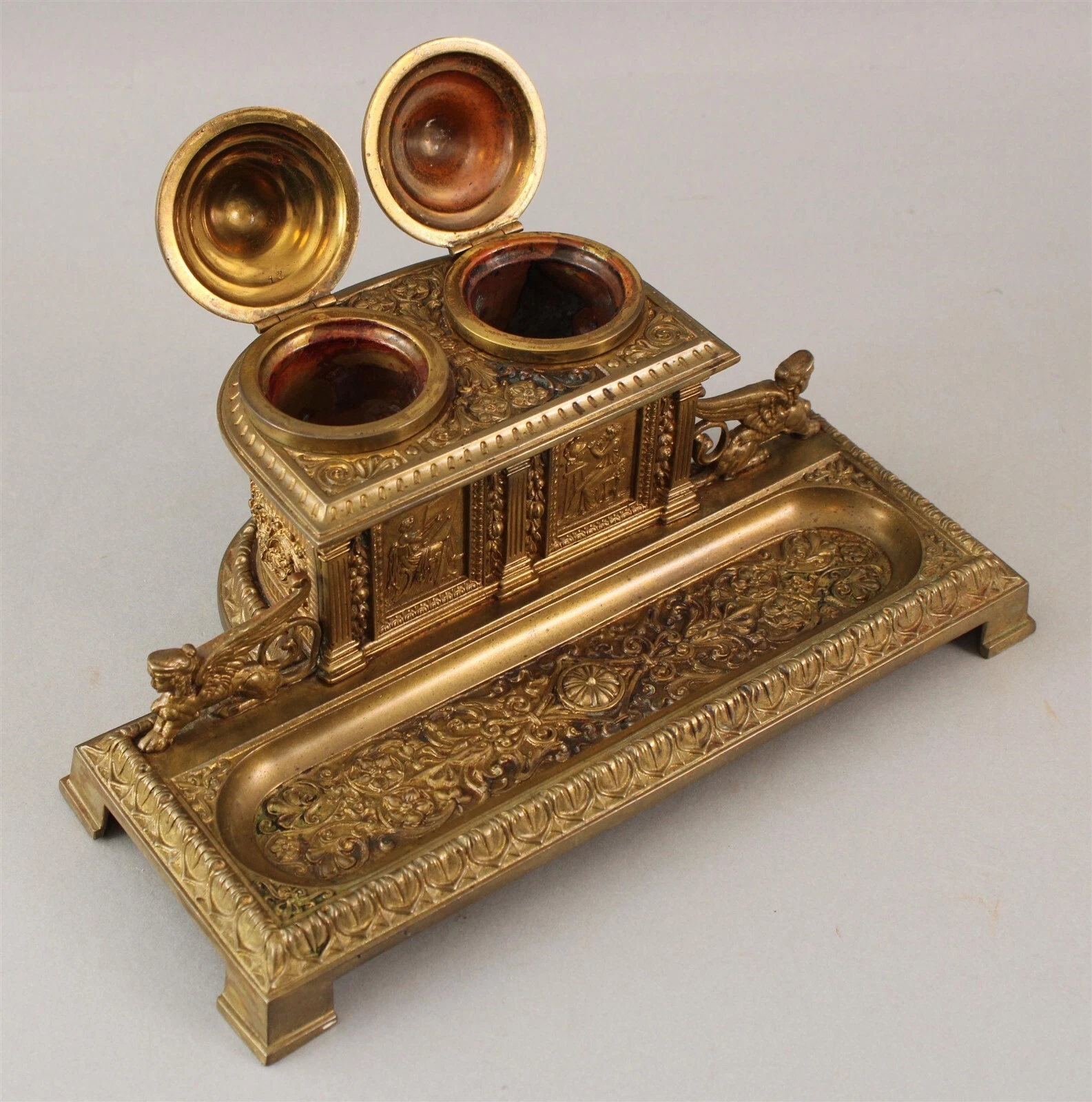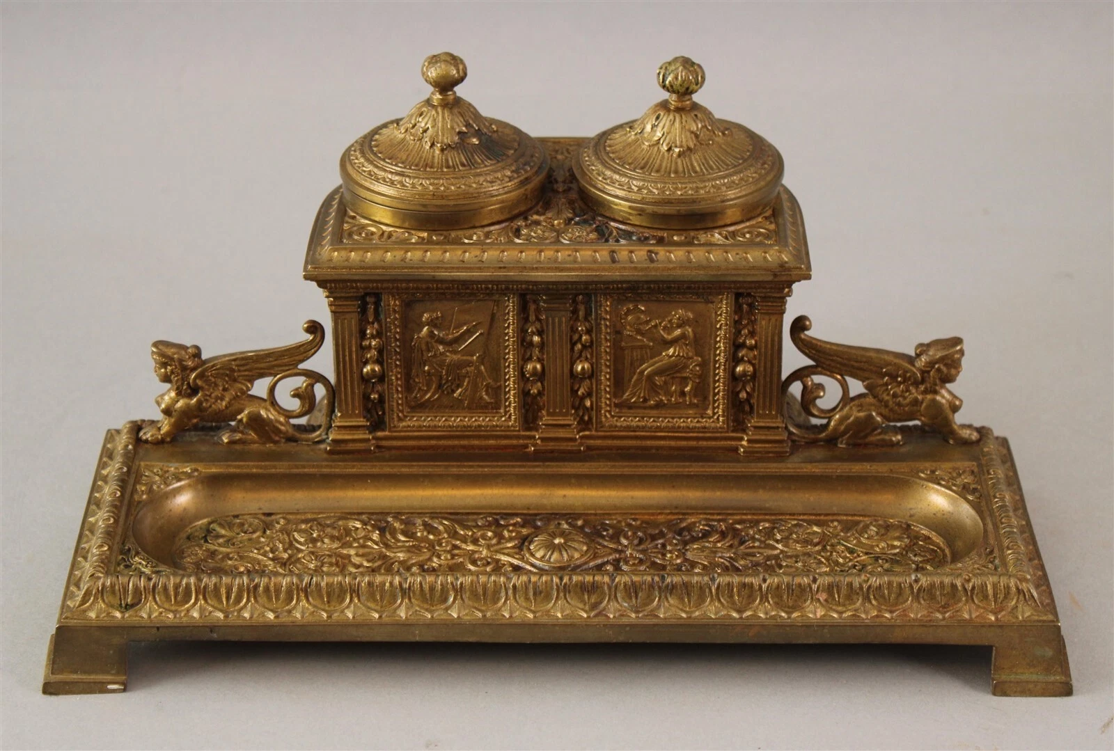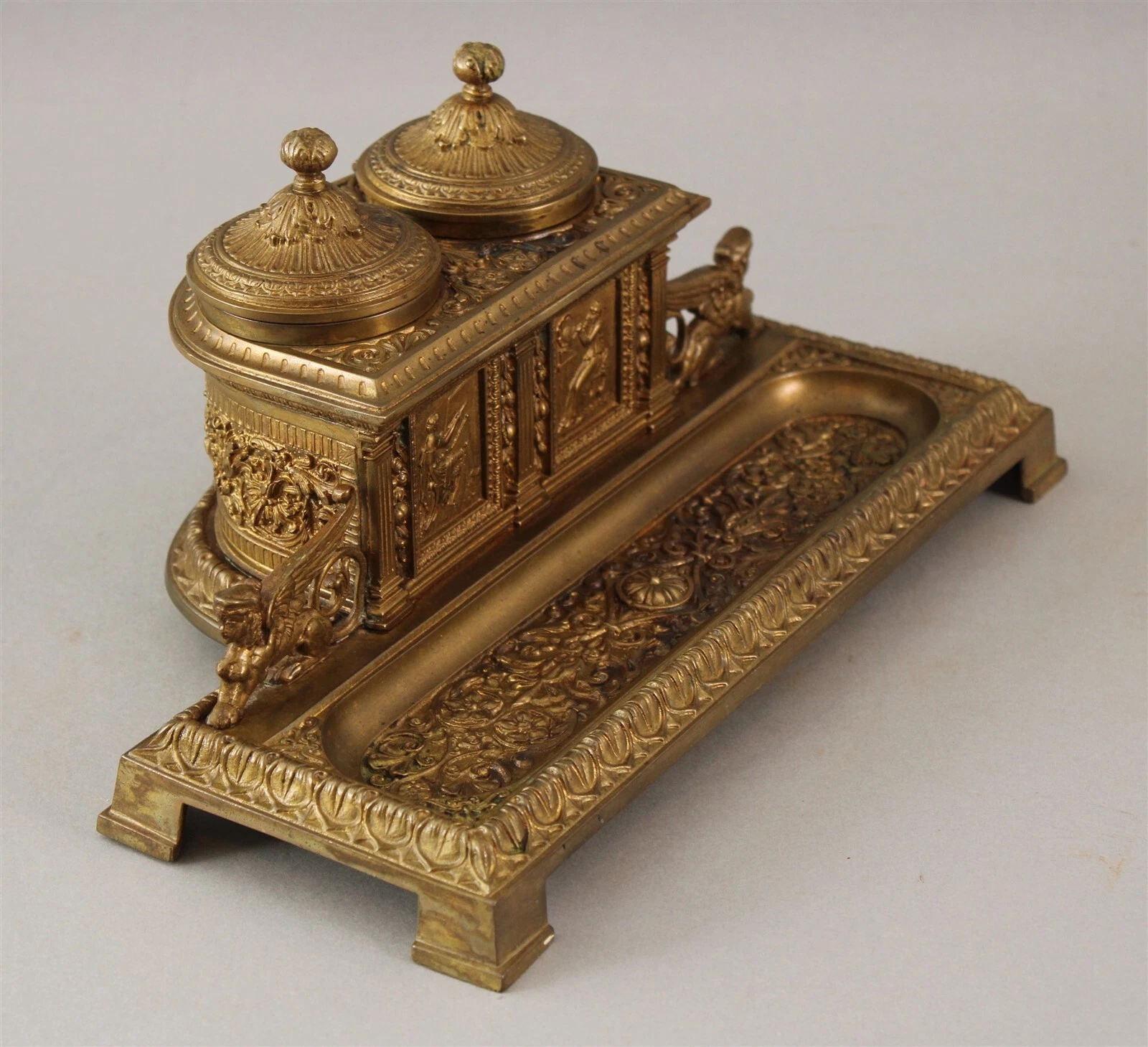 This 19th-century bronze standish (inkstand), distinguished by its Egyptian Revival design is a product of the German firm Erhard & Söhne. It’s a testament to the fascination with ancient Egypt that swept through Europe after archaeological discoveries and Napoleonic campaigns.
