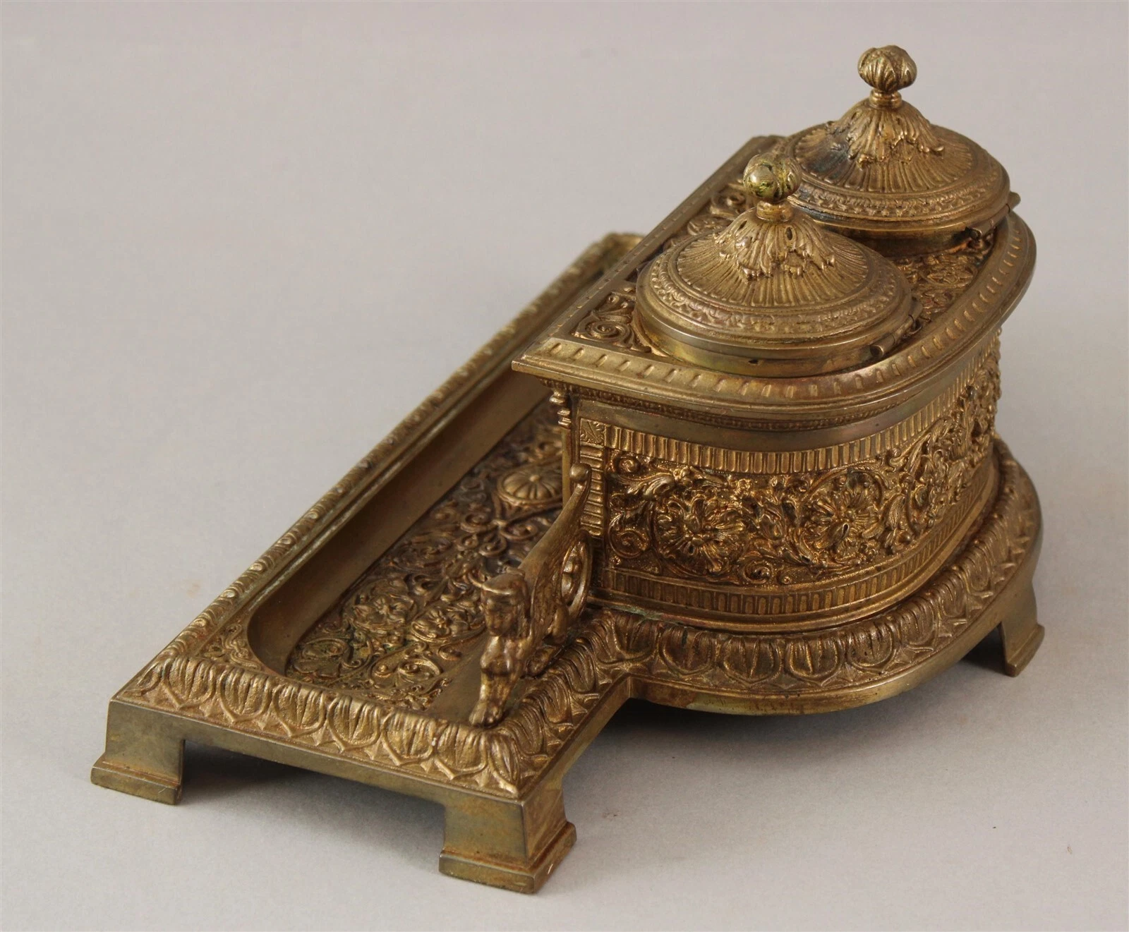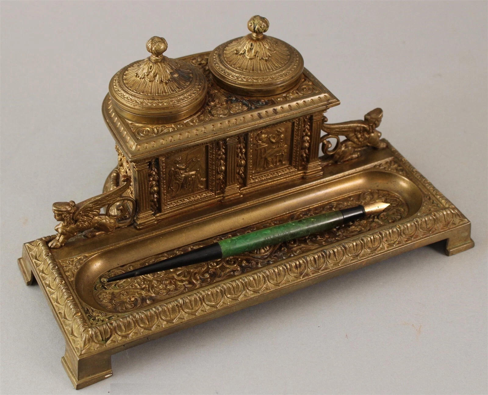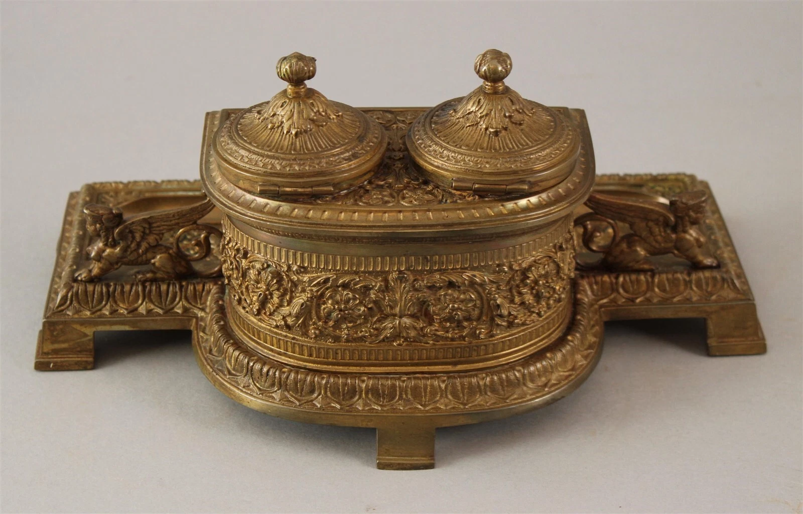 This 19th-century bronze standish (inkstand), distinguished by its Egyptian Revival design is a product of the German firm Erhard & Söhne. It’s a testament to the fascination with ancient Egypt that swept through Europe after archaeological discoveries and Napoleonic campaigns.