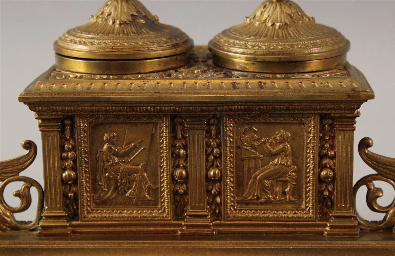 - Material and Construction: The inkstand is made of bronze. The dominant aesthetic is an interpretation of Egyptian Revival style. This style, popular in the 19th century, incorporated motifs and forms inspired by ancient Egyptian art and architecture.