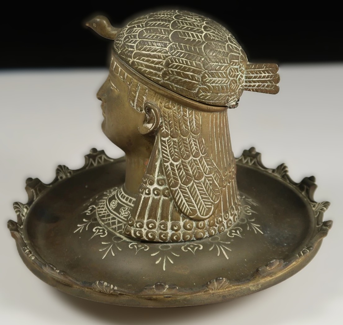 • Figural Design: The central feature is a bust of an Egyptian woman, possibly a goddess or pharaoh like Cleopatra. She wears a detailed vulture headdress, which, as a separate piece, lifts off to access the inkwell. Her face is finely modeled, with a classical expression.