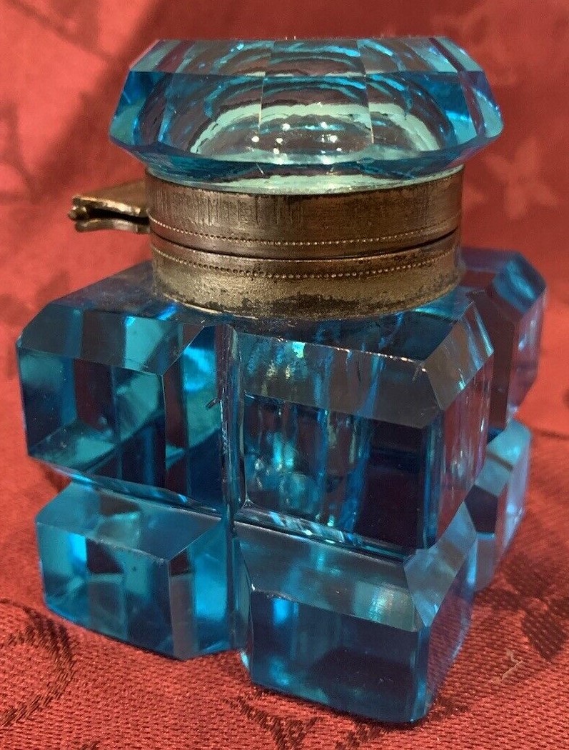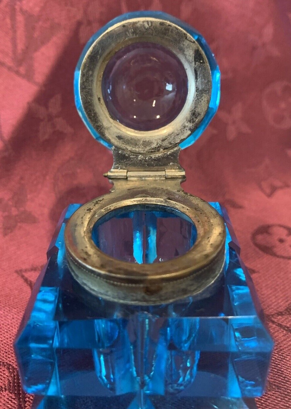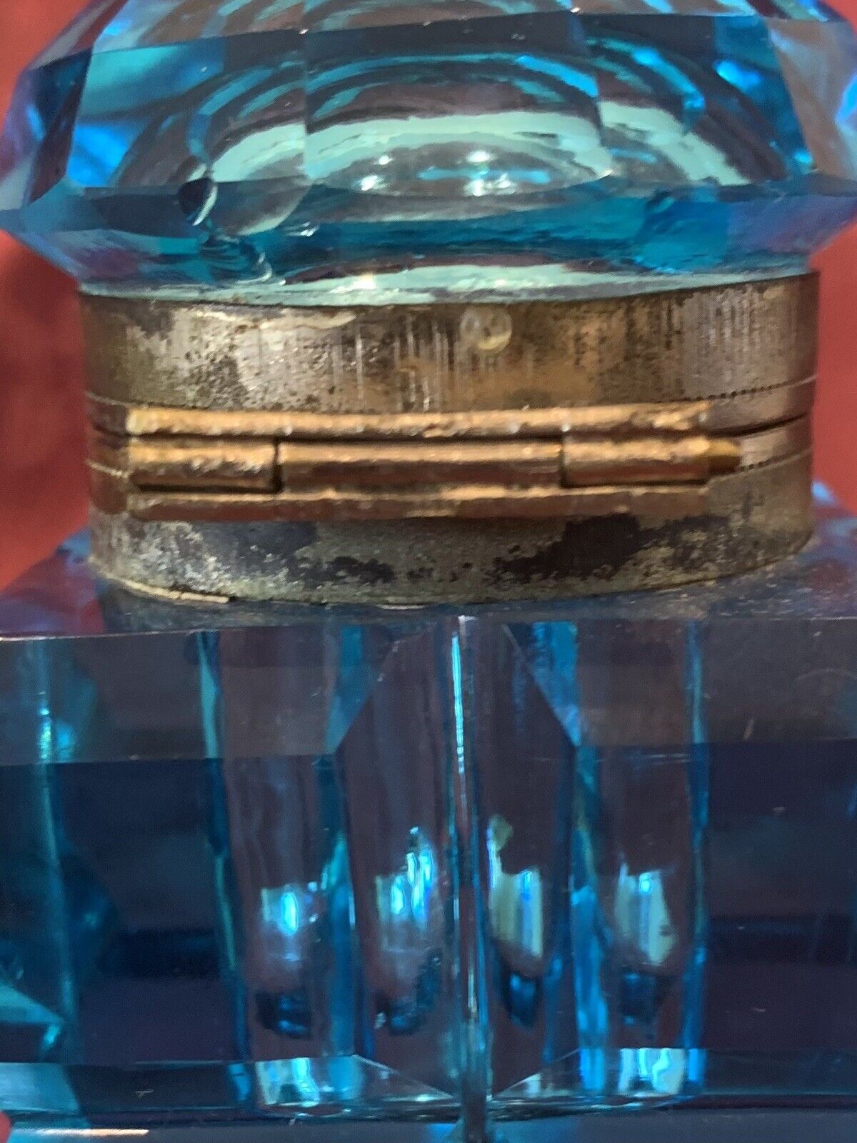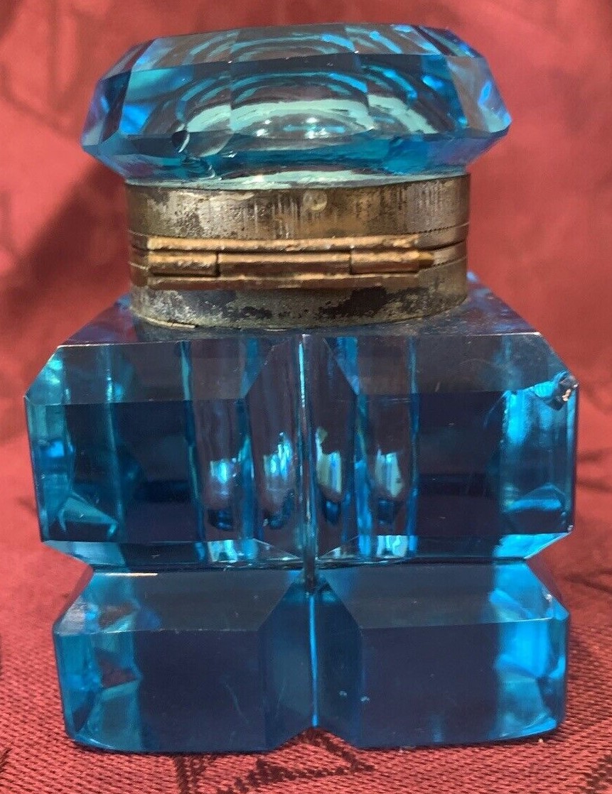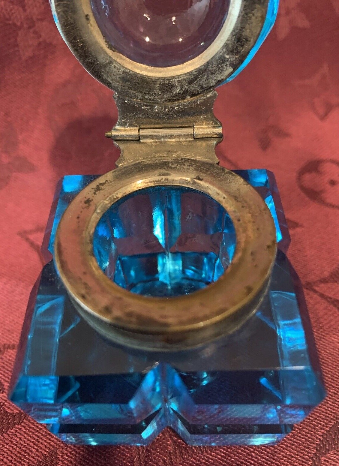 This electric blue cut crystal inkwell has a faceted body and hinged brass mounts.