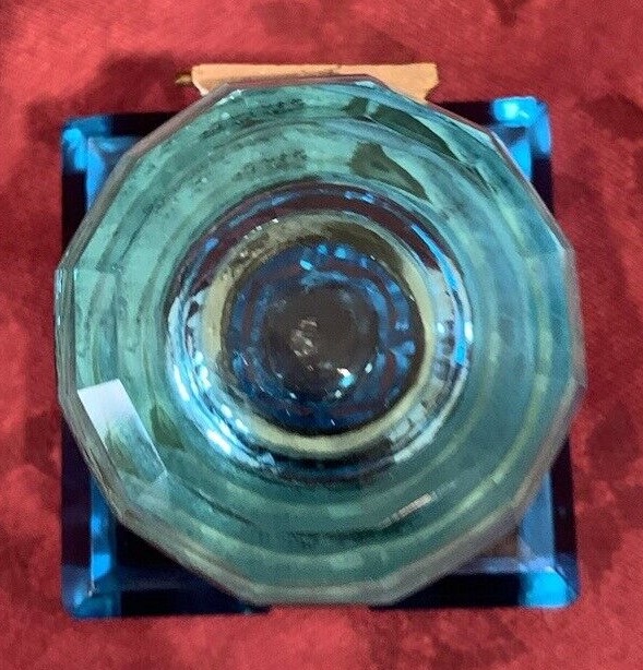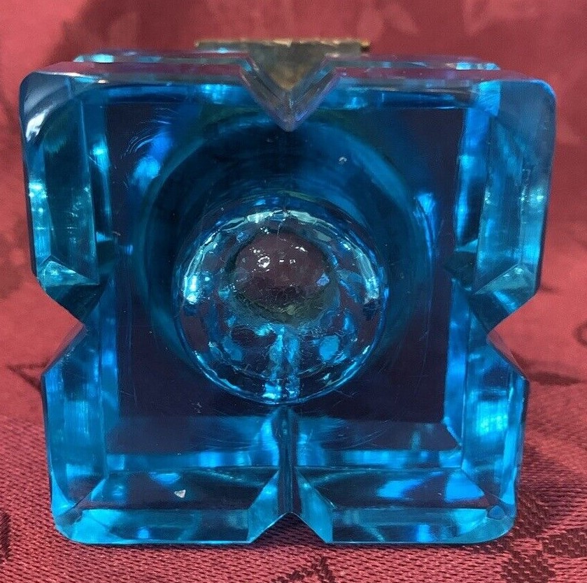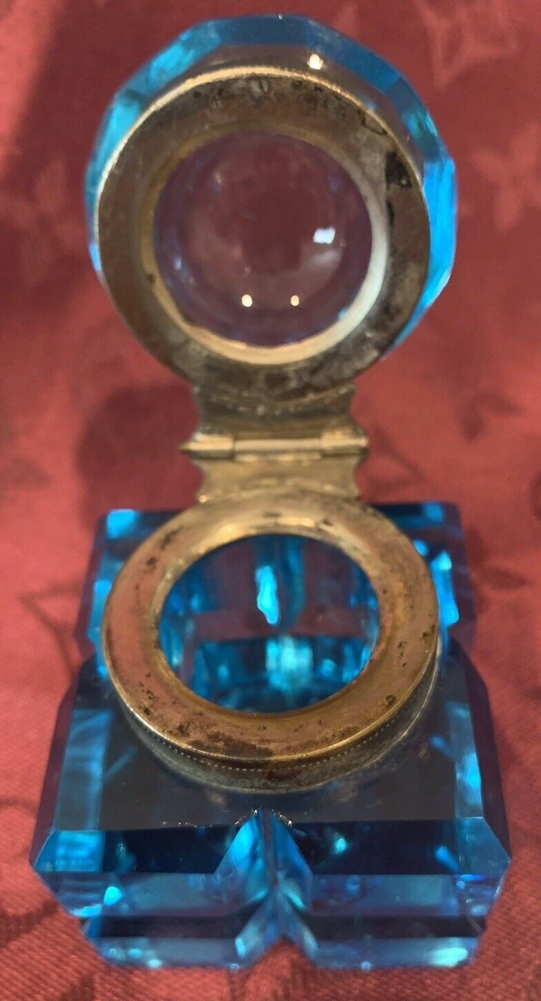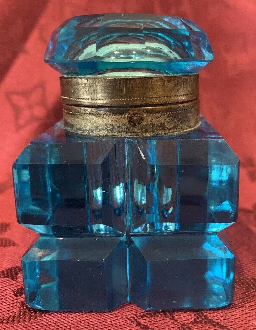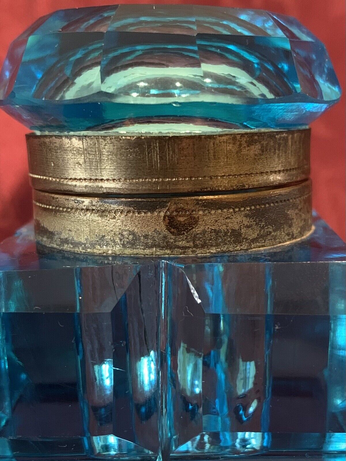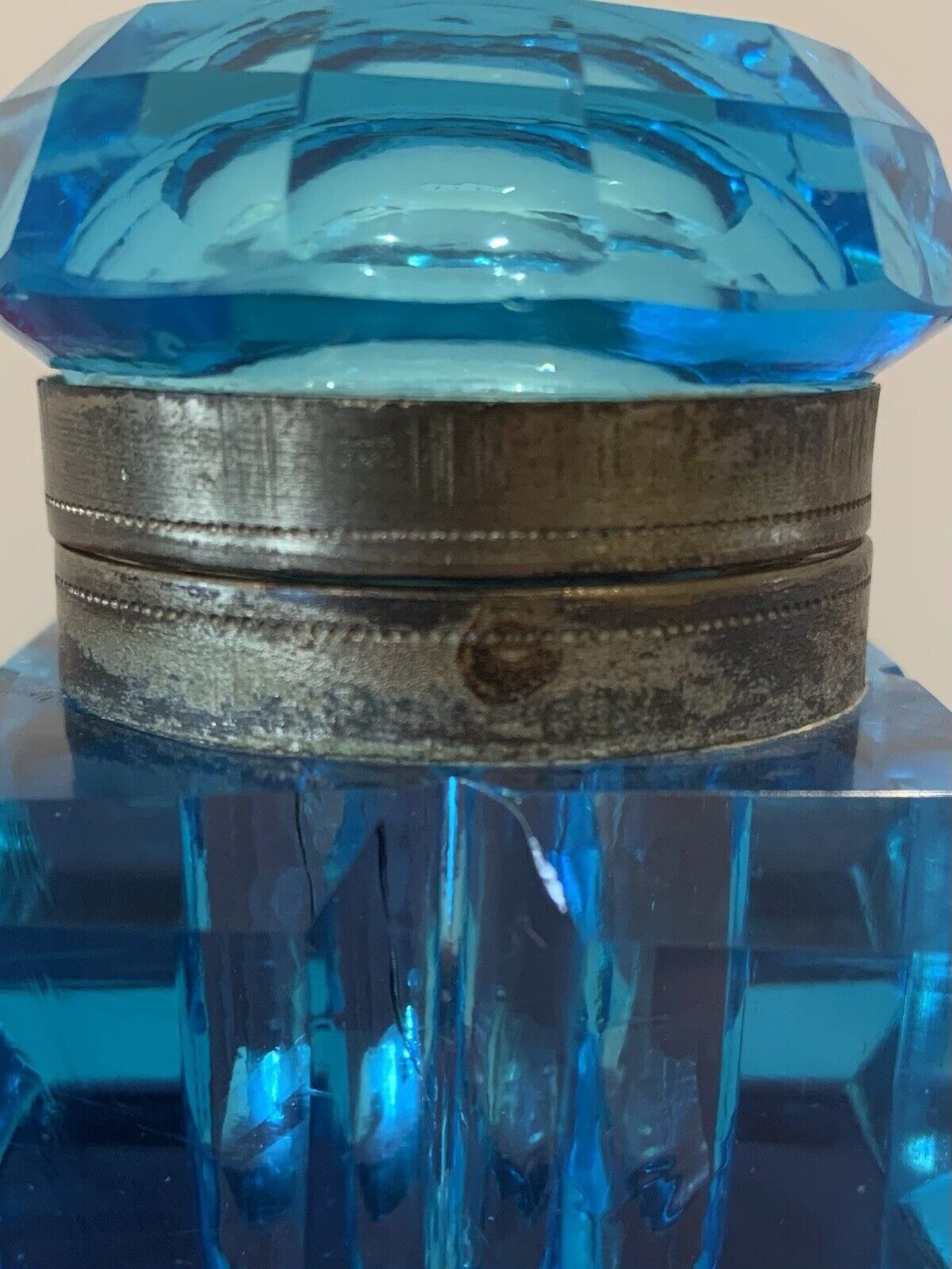 This electric blue cut crystal inkwell has a faceted body and hinged brass mounts.