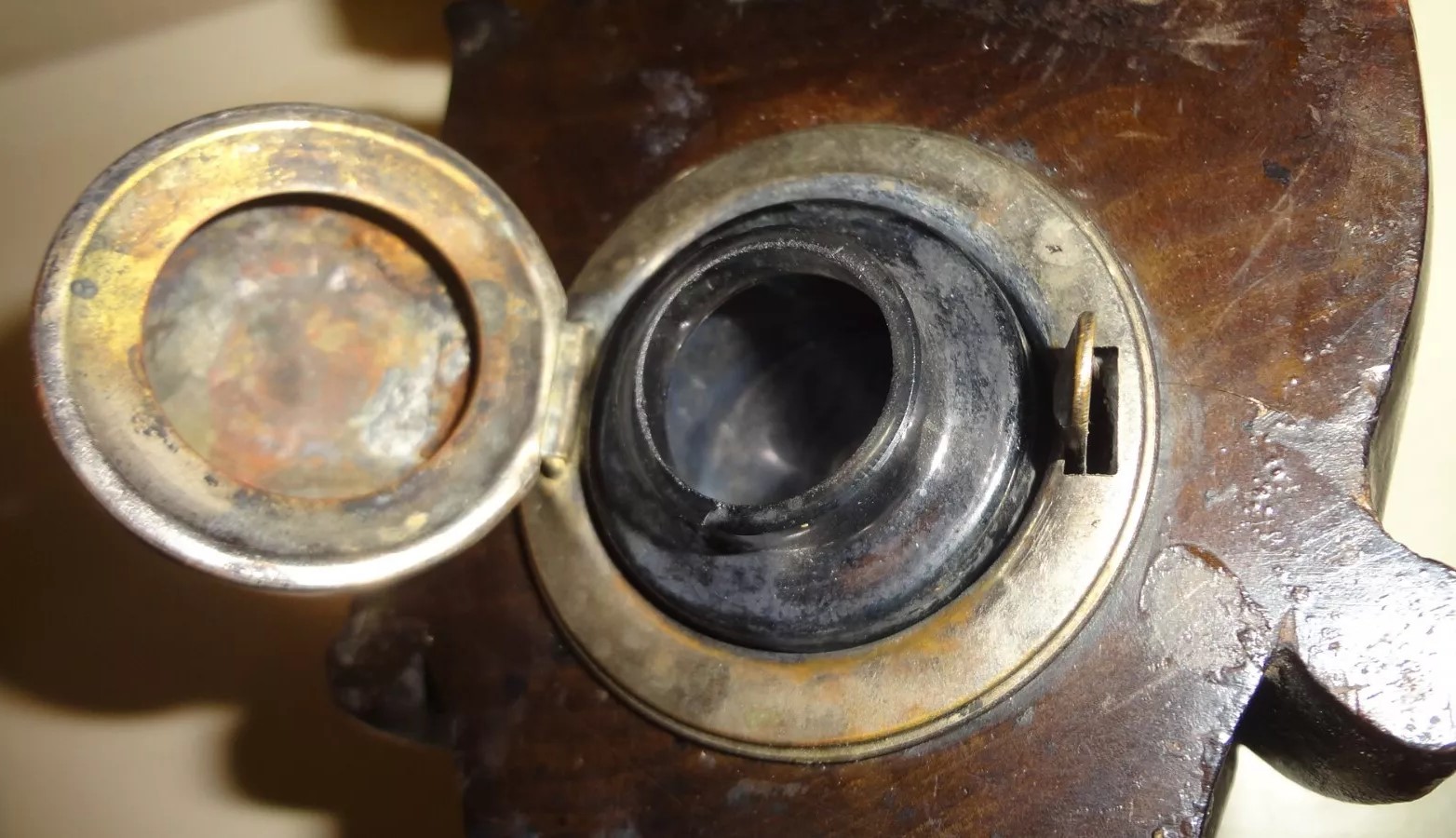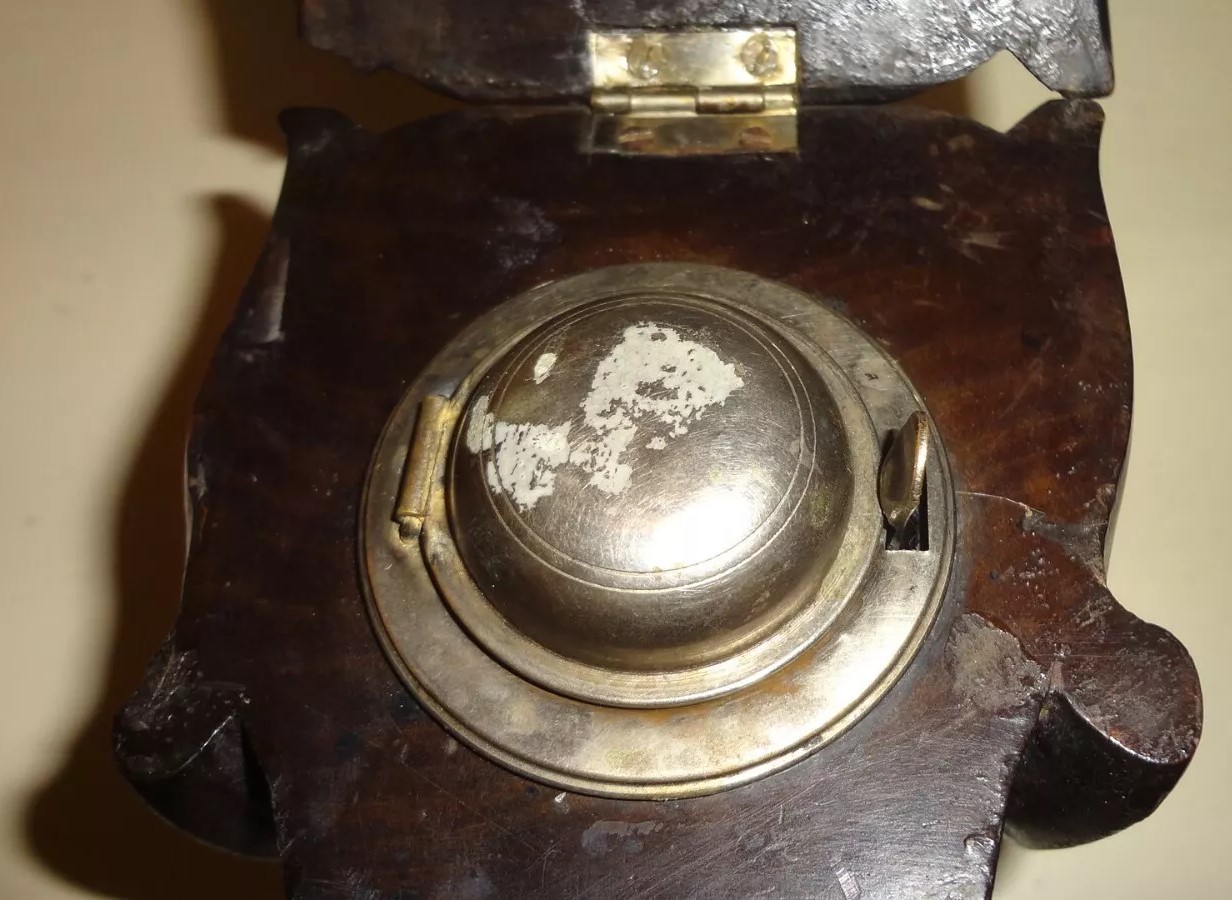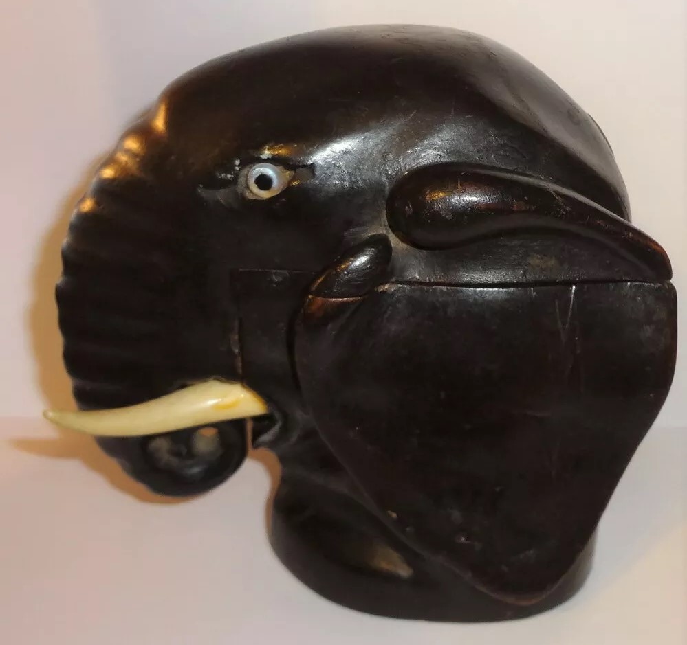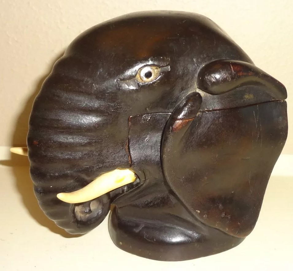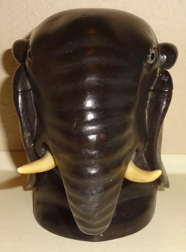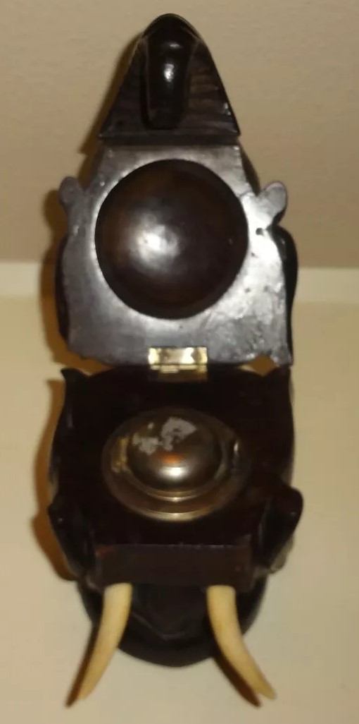 This inkwell was made from ebonized wood in the form of an elephant’s head. It has a smooth polished finish with detailed carvings in the folds of the trunk, the large ears, and the wrinkled texture of the forehead and cheeks. The elephant’s eyes are made of round beads of glass. Ivory tusks protrude from the sides. The back of the elephant’s head is hinged, allowing it to be opened, revealing the inner inkwell compartment. The actual ink container inside the elephant’s head features a spring-loaded lid, opened by pressing a latch.