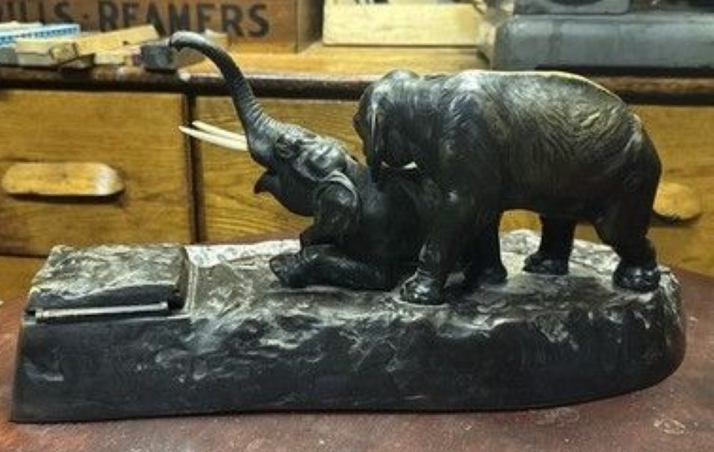 - Subject: The inkstand features two elephants cast in an active, dynamic pose on a rocky, naturalistic base. One elephant is larger, standing behind the smaller elephant, which is crouched, with its trunk raised in a trumpeting posture.