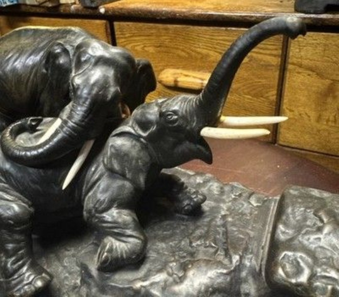 - Material: The sculpture is made of bronze and is characteristic of the items made by Austrian and German bronze foundries of the period. The smaller elephant has visible tusks, which are made of ivory or bone for realistic effect.