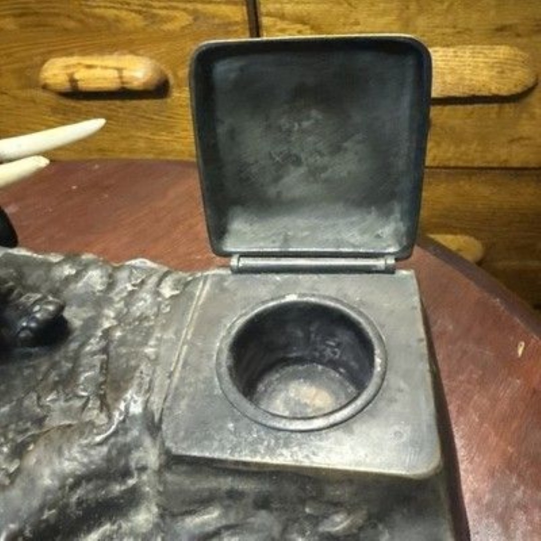 - Inkwell: The inkwell is integrated into the rocky base, beneath a hinged lid. The broad, flat expanse of the base provides a rest for pens.