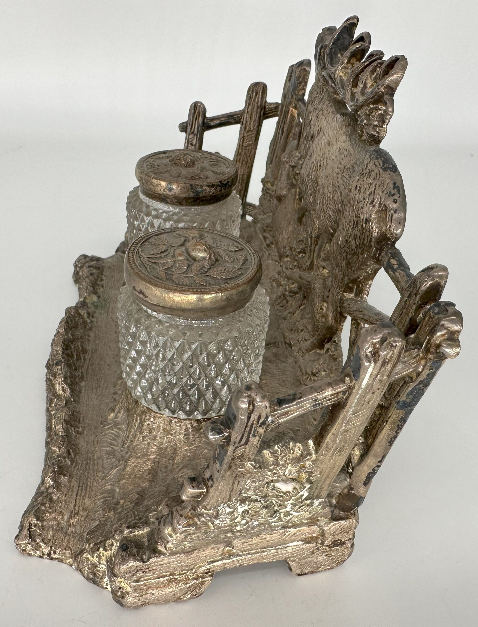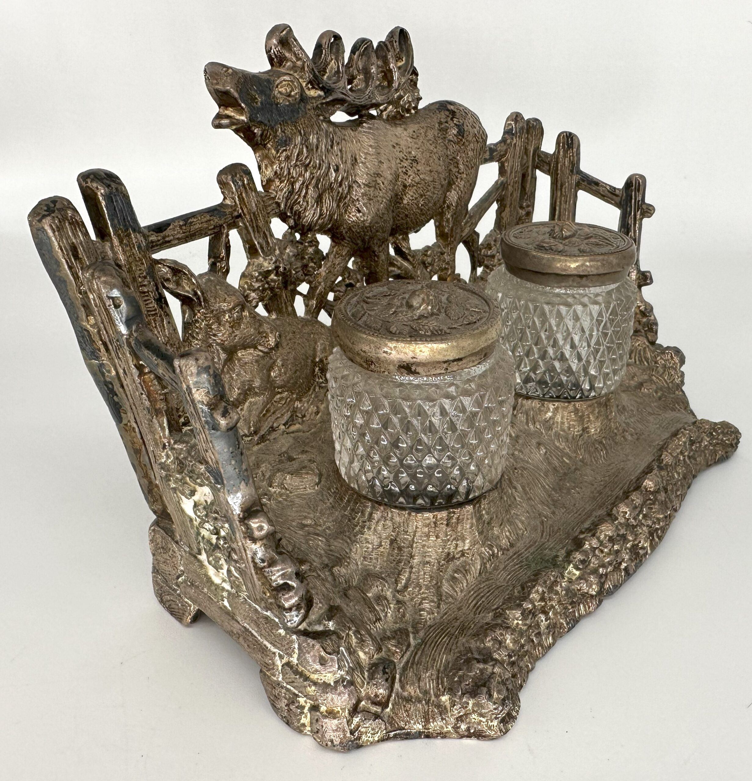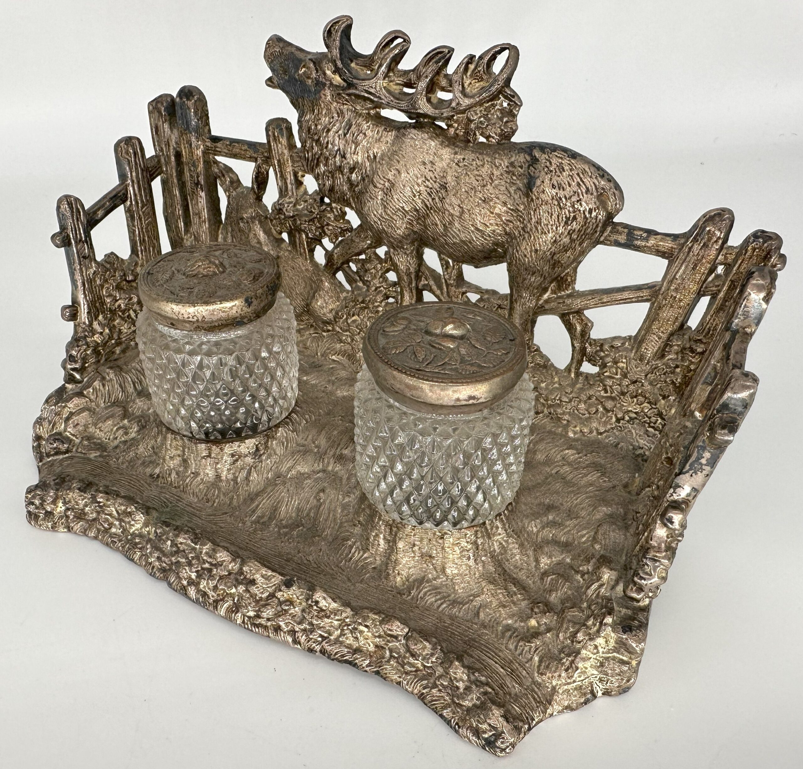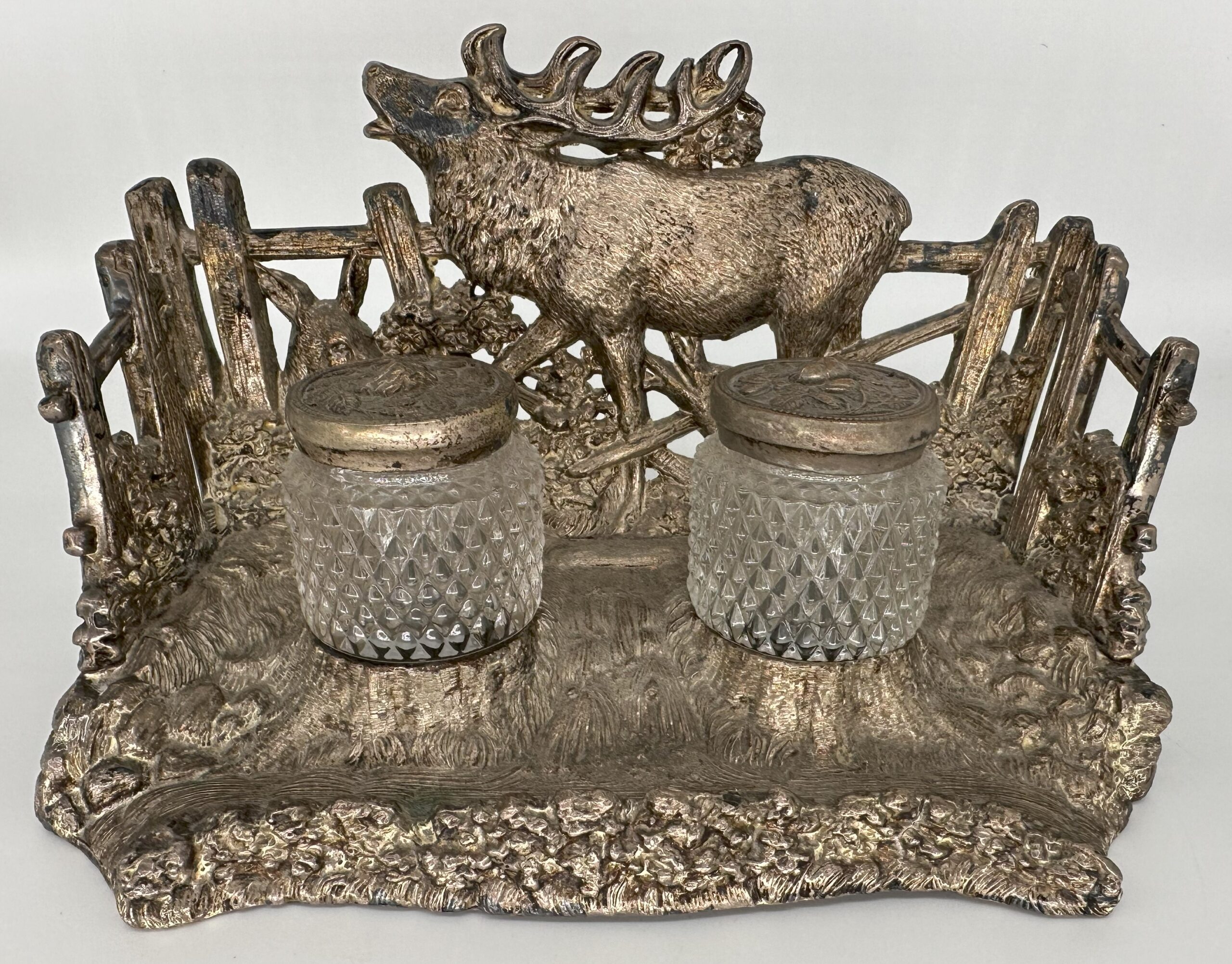 Double inkstand with two diamond point design pressed glass inkwells with lids. A fence and an elk in relief dominates the background along with the head of a calf. The furrow in the foreground serves as a pen channel.