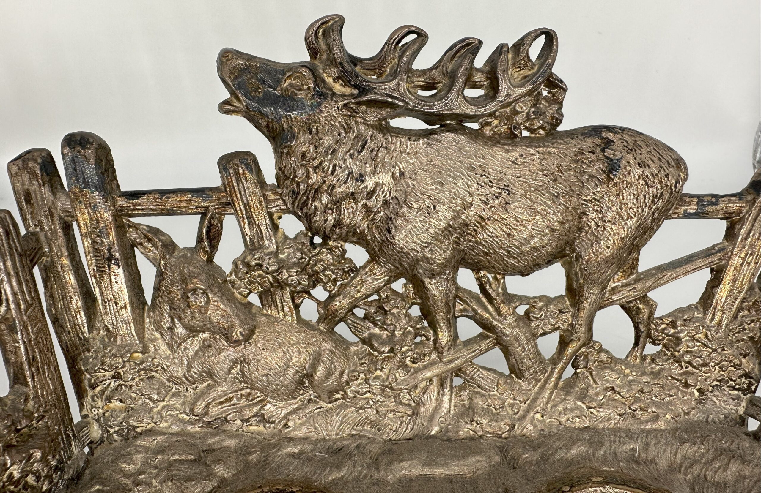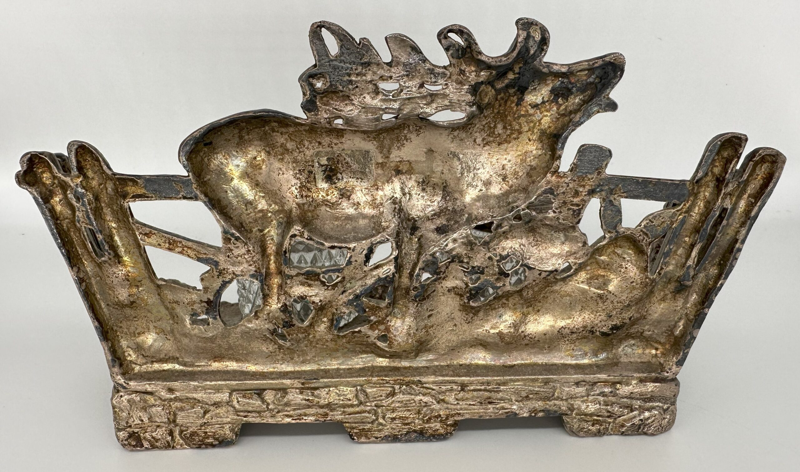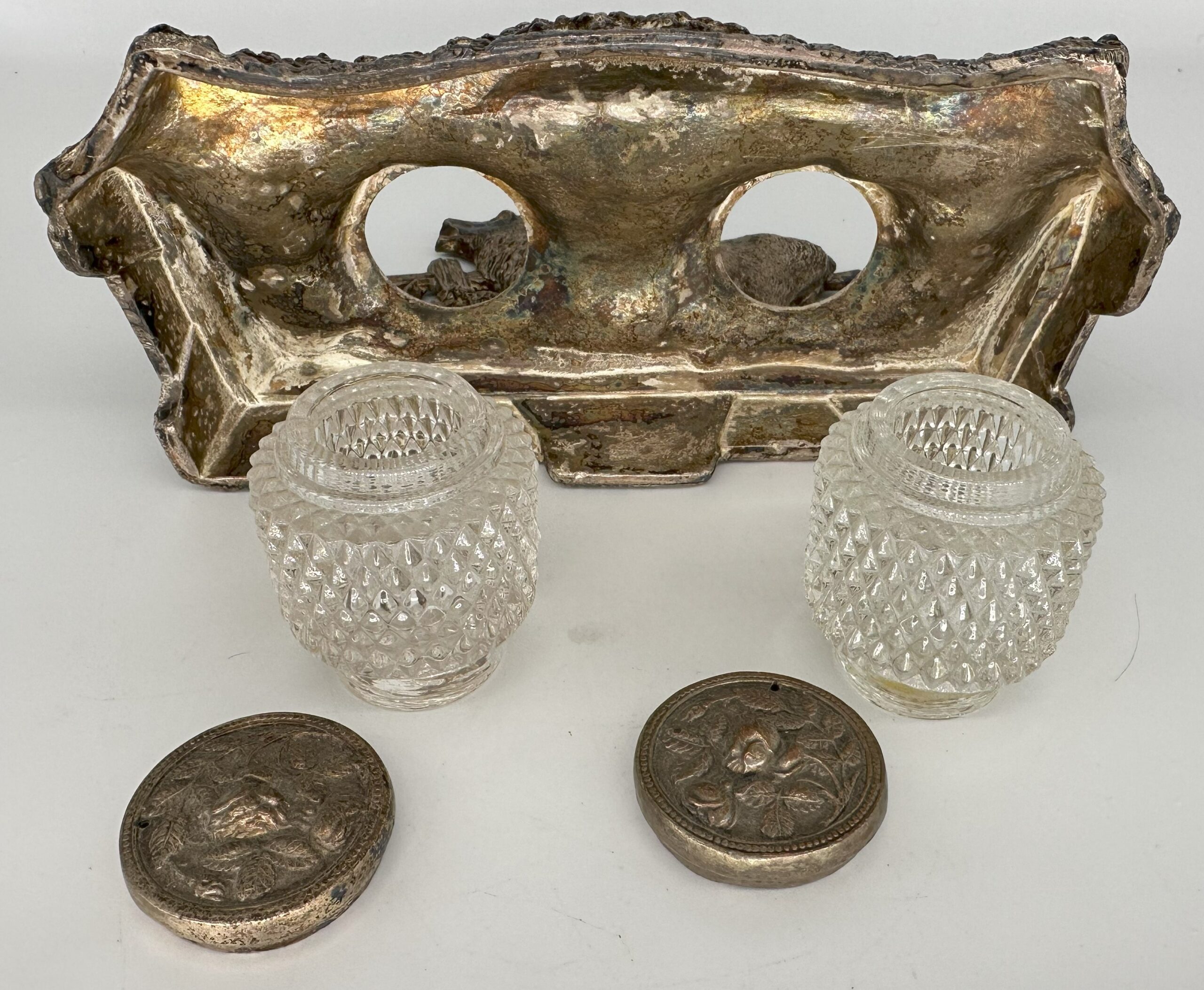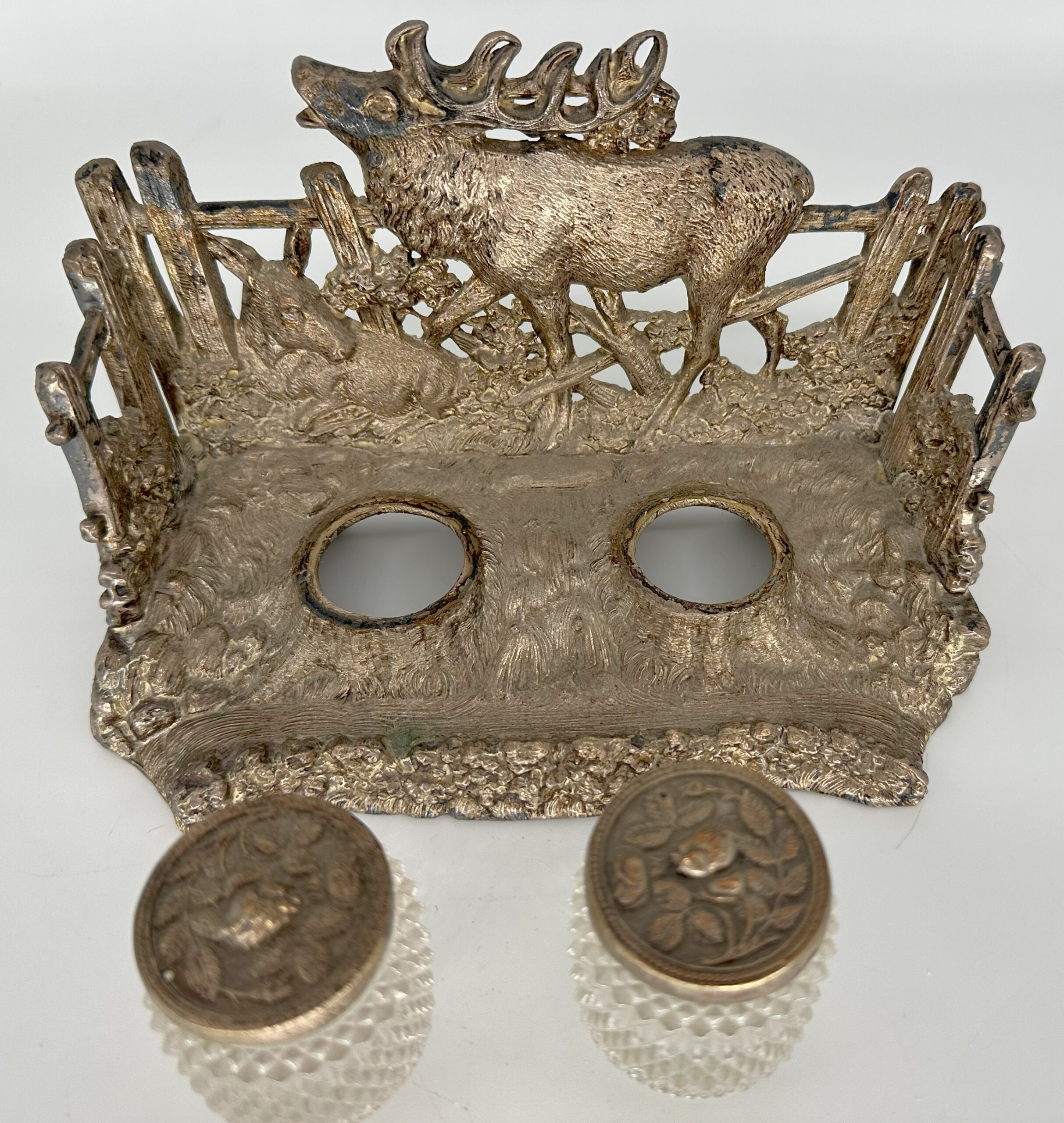 Double inkstand with two diamond point design pressed glass inkwells with lids. A fence and an elk in relief dominates the background along with the head of a calf. The furrow in the foreground serves as a pen channel.