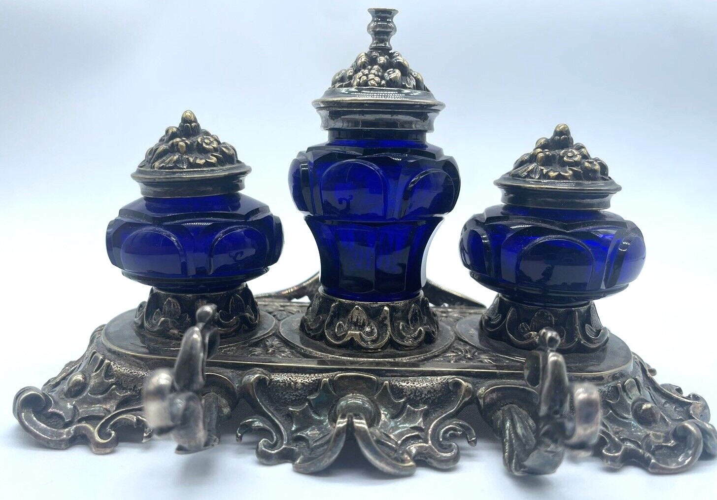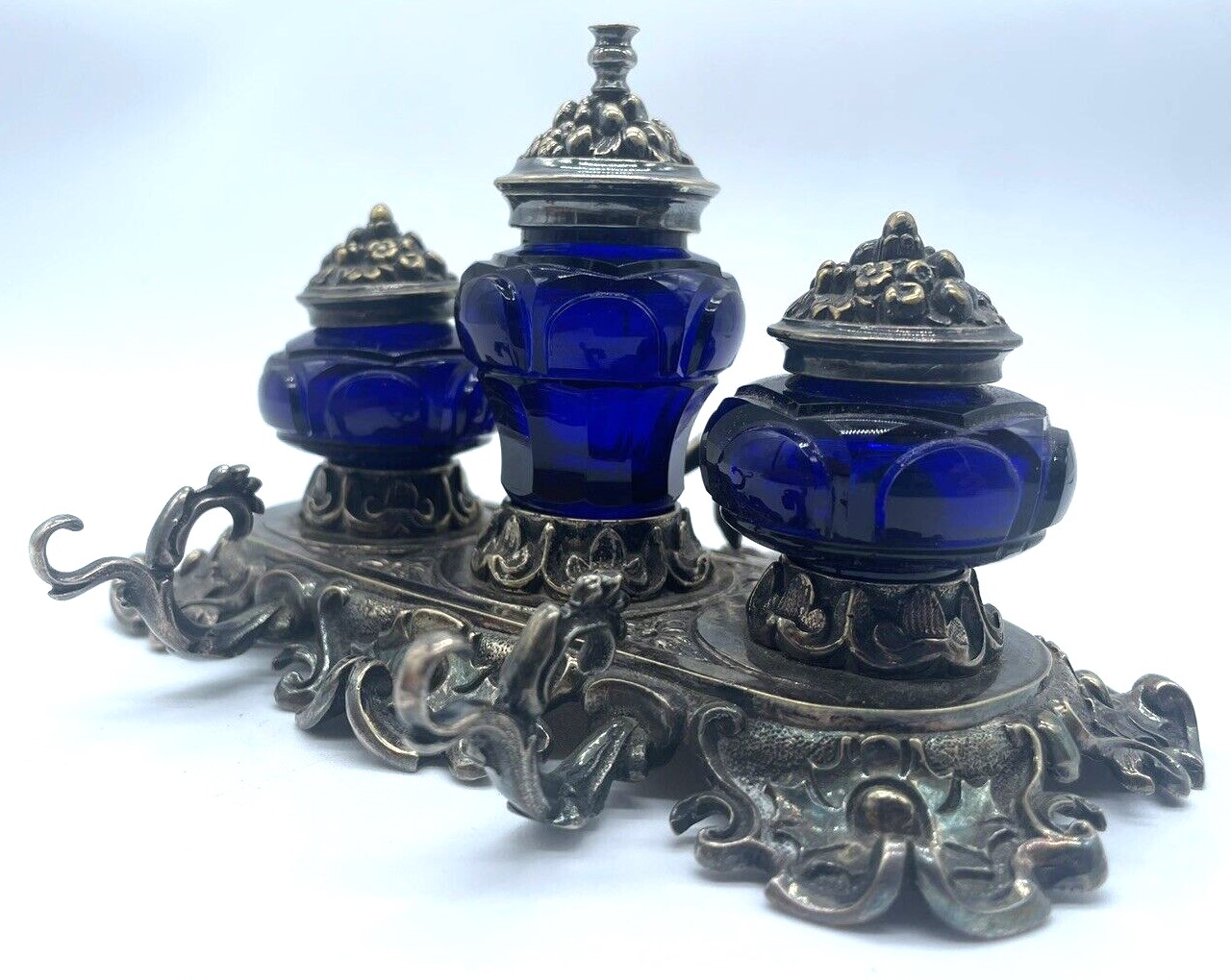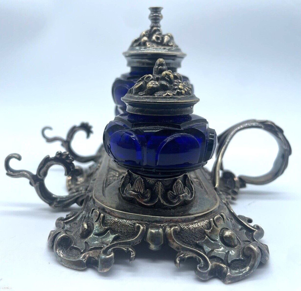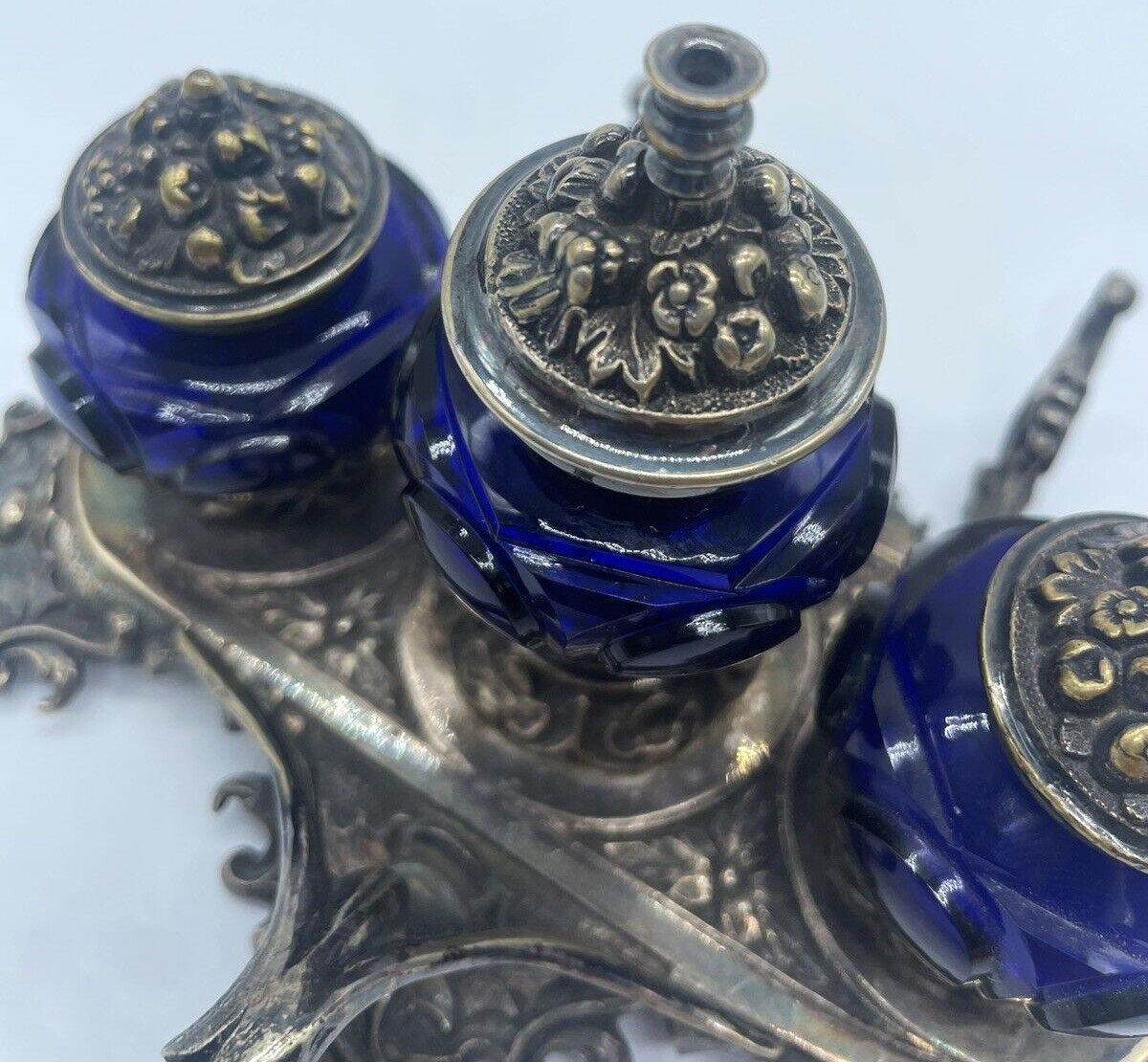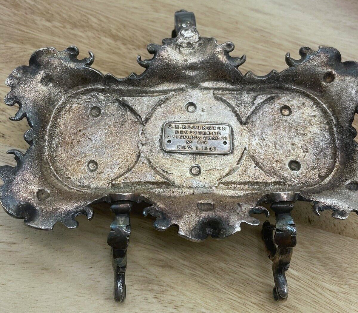 The underside of this inkstand is marked “G.R. Elkington, registered, 2 Victoria Chap 17. No. 899, Nov 1 1841”. The cast silverplate base with a leaf and scroll design has a handle on one side, a pen holder on the other. The stemmed cobalt blue inkwells are multifaceted and have unattached lids with a fruit design.