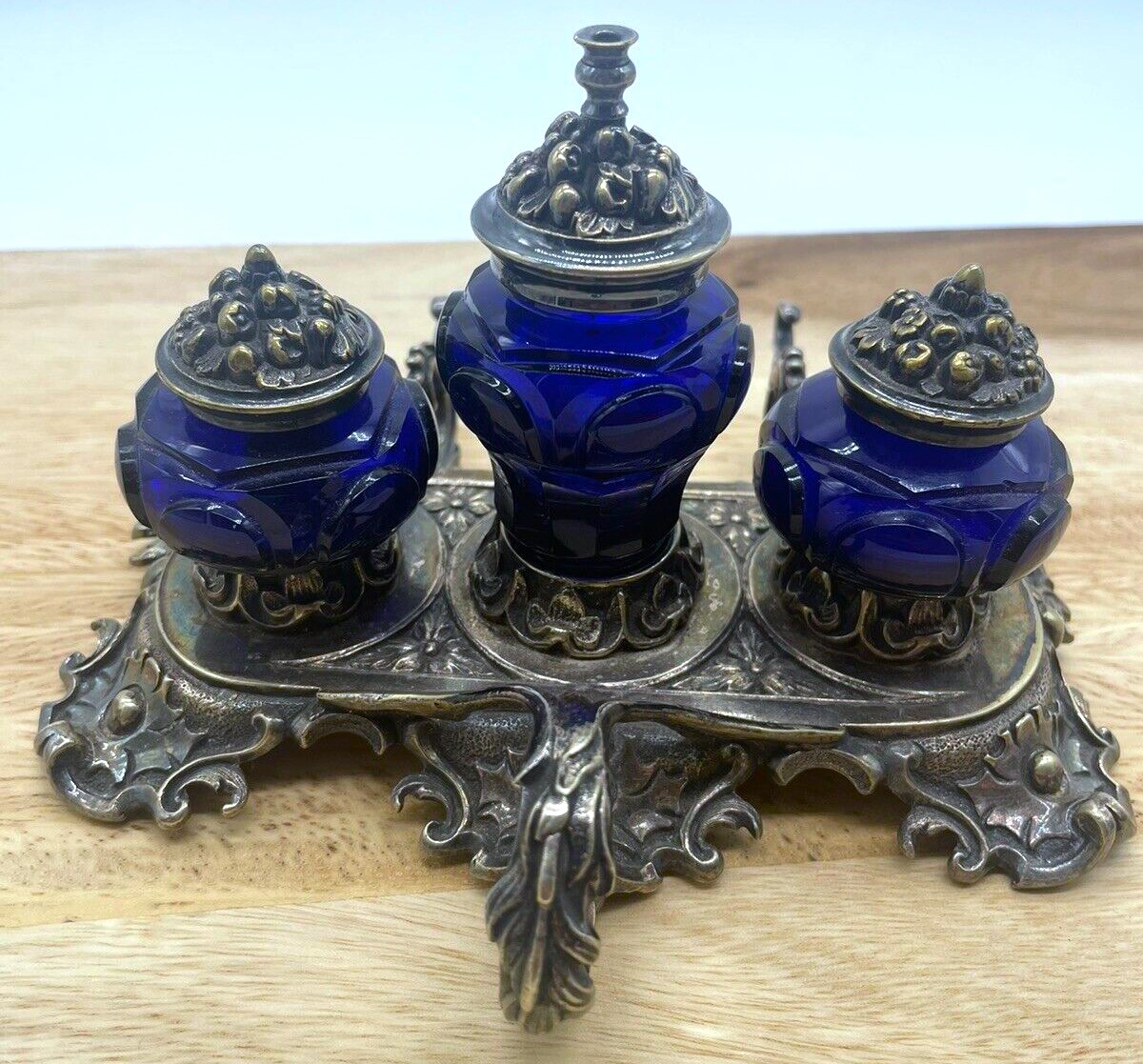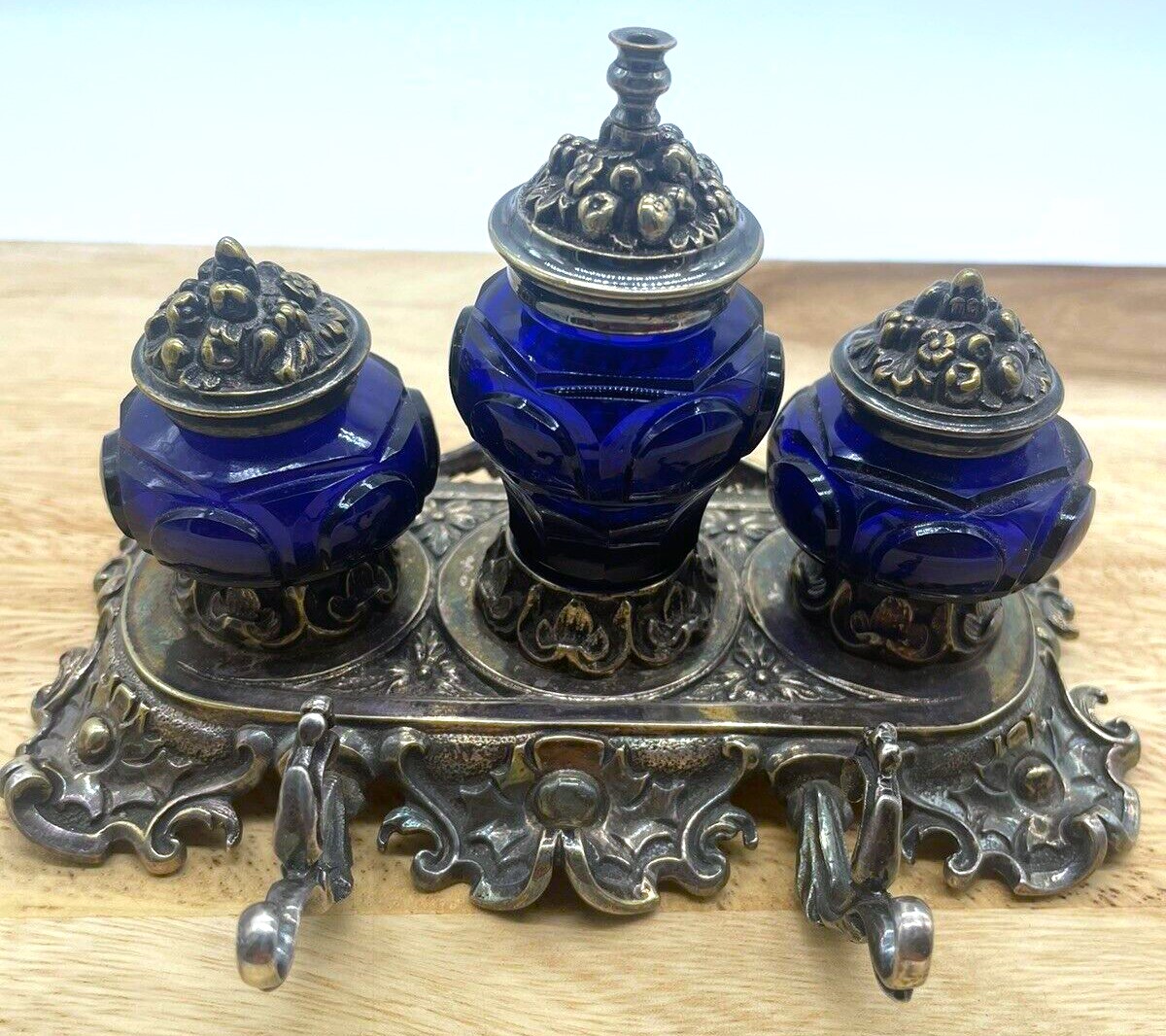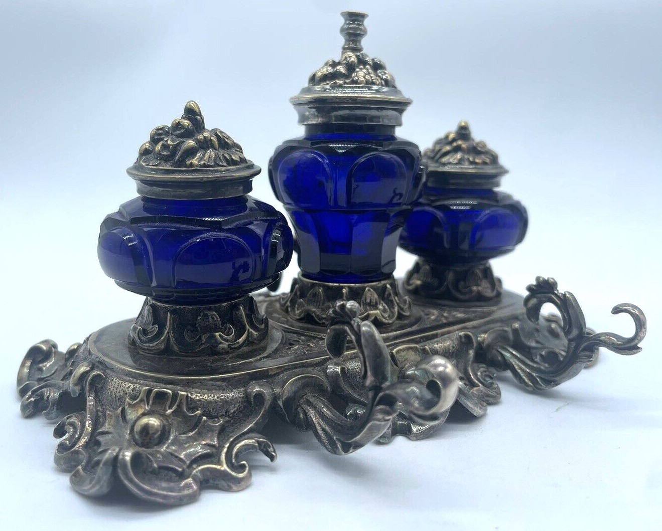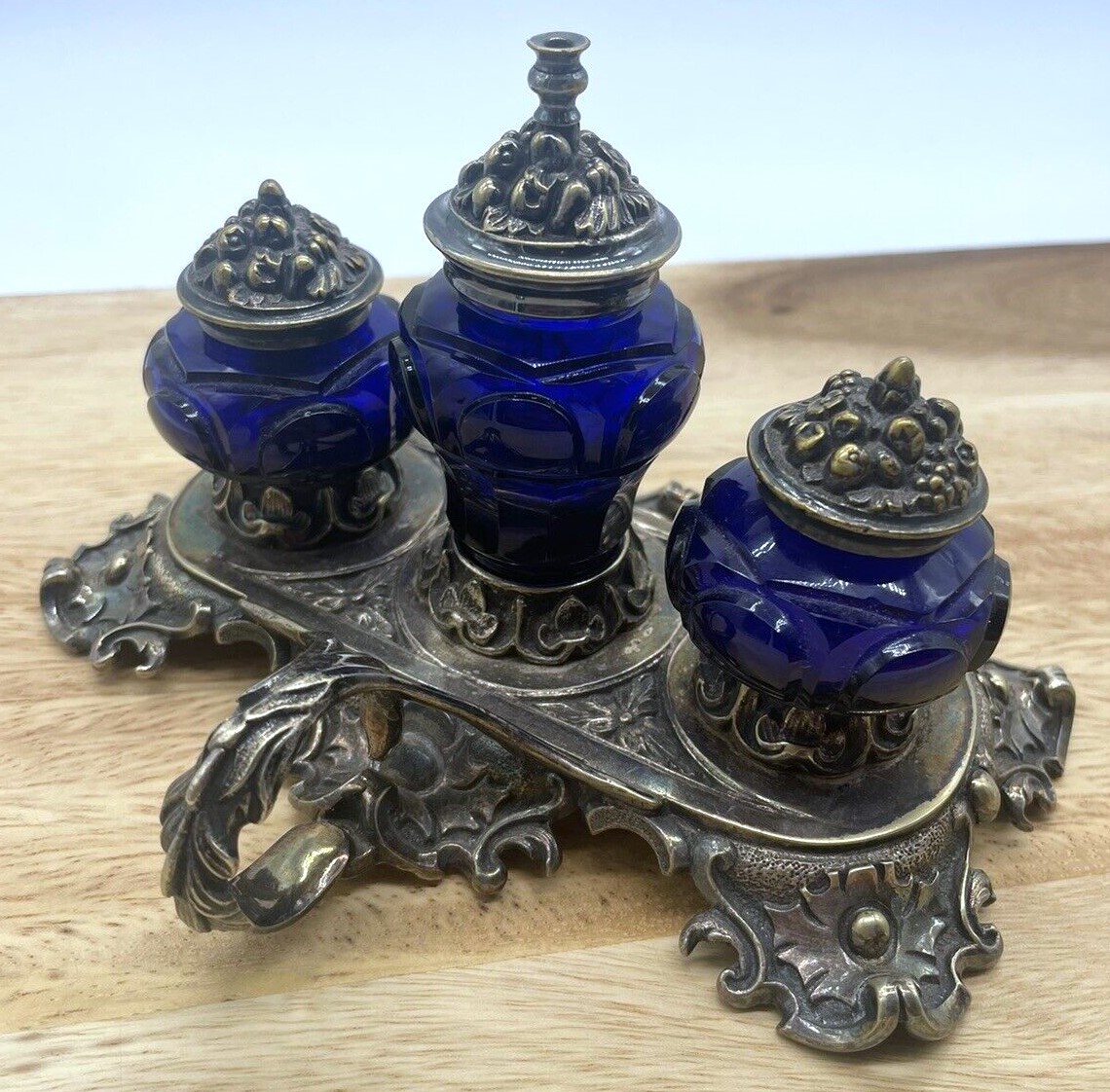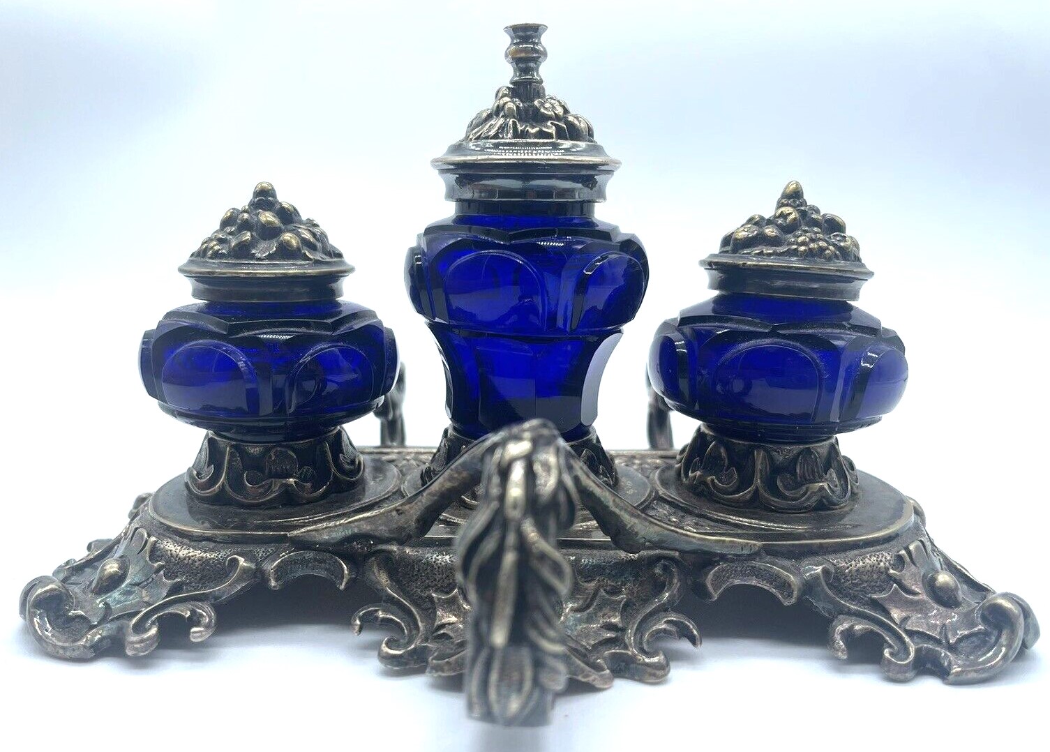 The underside of this inkstand is marked “G.R. Elkington, registered, 2 Victoria Chap 17. No. 899, Nov 1 1841”. The cast silverplate base with a leaf and scroll design has a handle on one side, a pen holder on the other. The stemmed cobalt blue inkwells are multifaceted and have unattached lids with a fruit design.