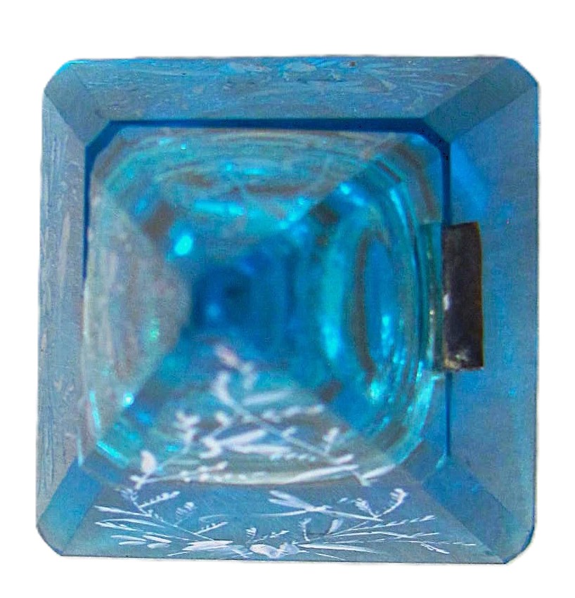 - Material: The piece is made from translucent blue glass – sometimes called “Bristol Blue” or “Cobalt Blue” – which provides a high-contrast background for the decoration.