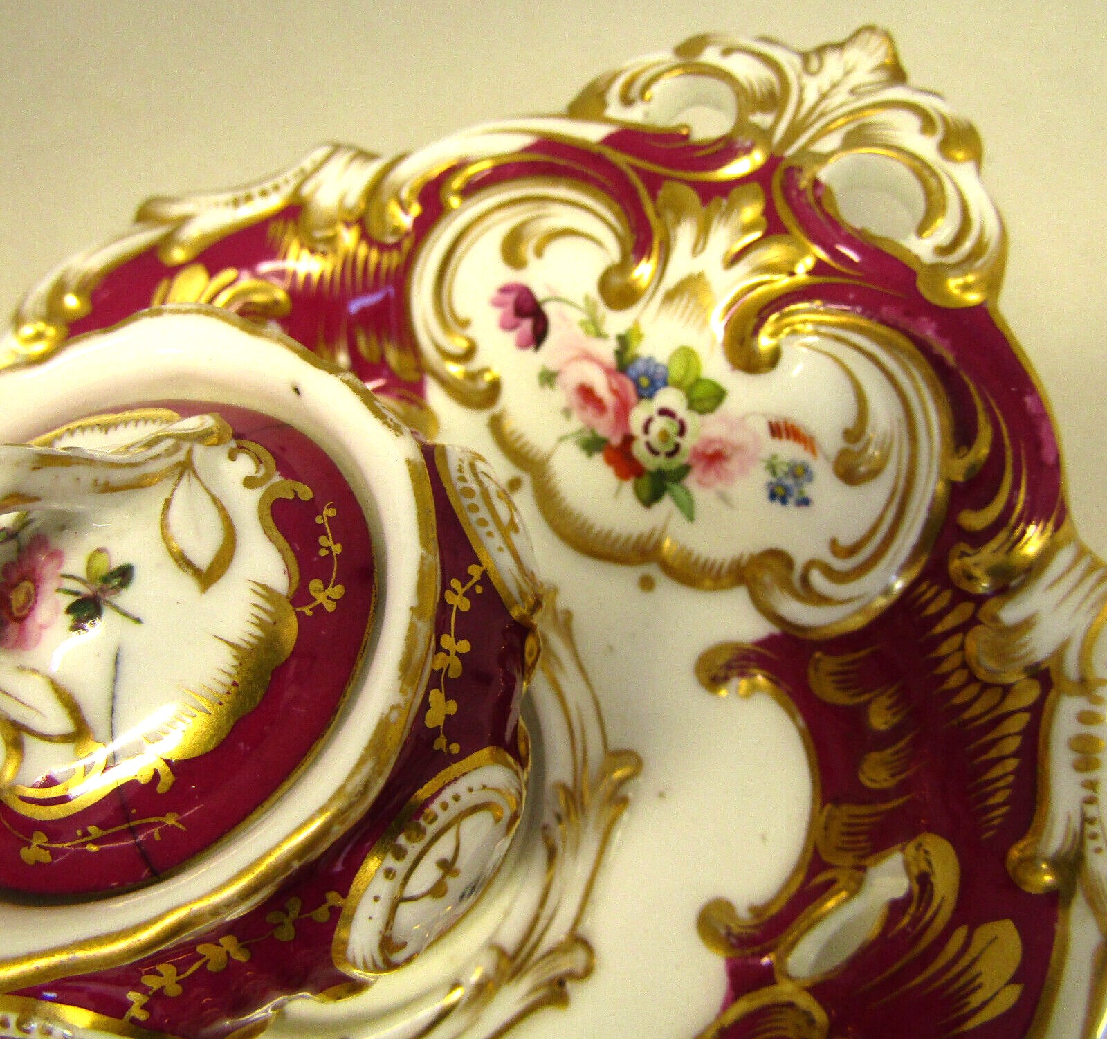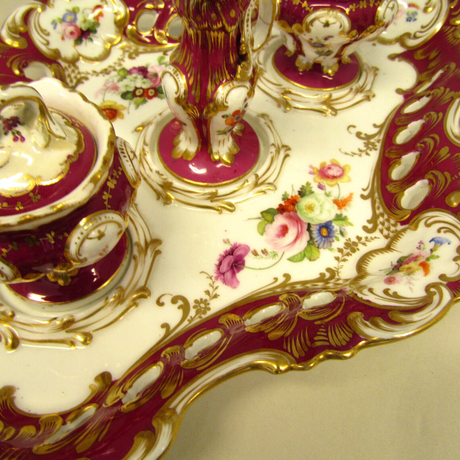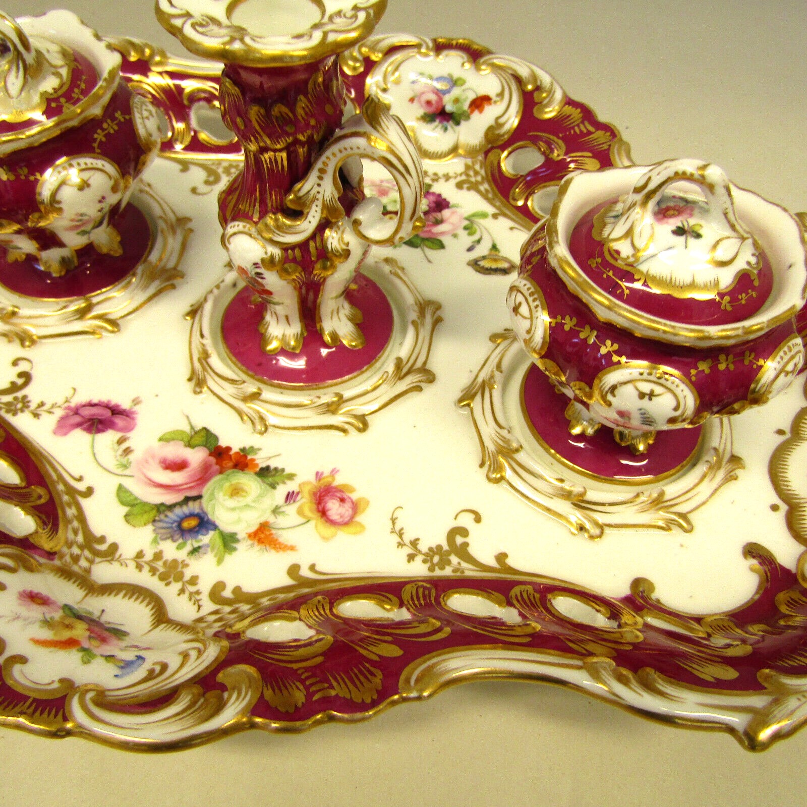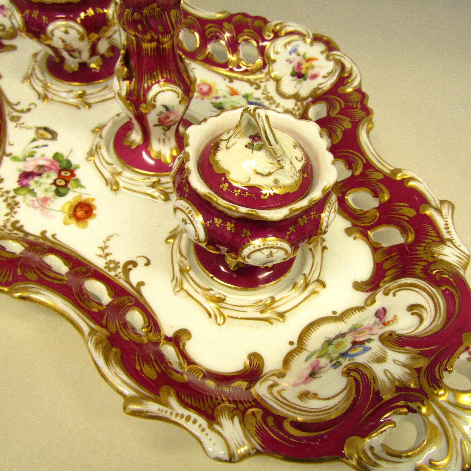 This English porcelain inkstand consists of a fitted reticulated tray, two ink pots and lids, and a candle stand. The pieces are profusely decorated with delicate, hand painted florals and gilding. The tray, with a pierced puce and gilt border, has raised compartments to hold the ink pots and candle stand. Each ink pot has six panels of hand painted flowers, each one different.