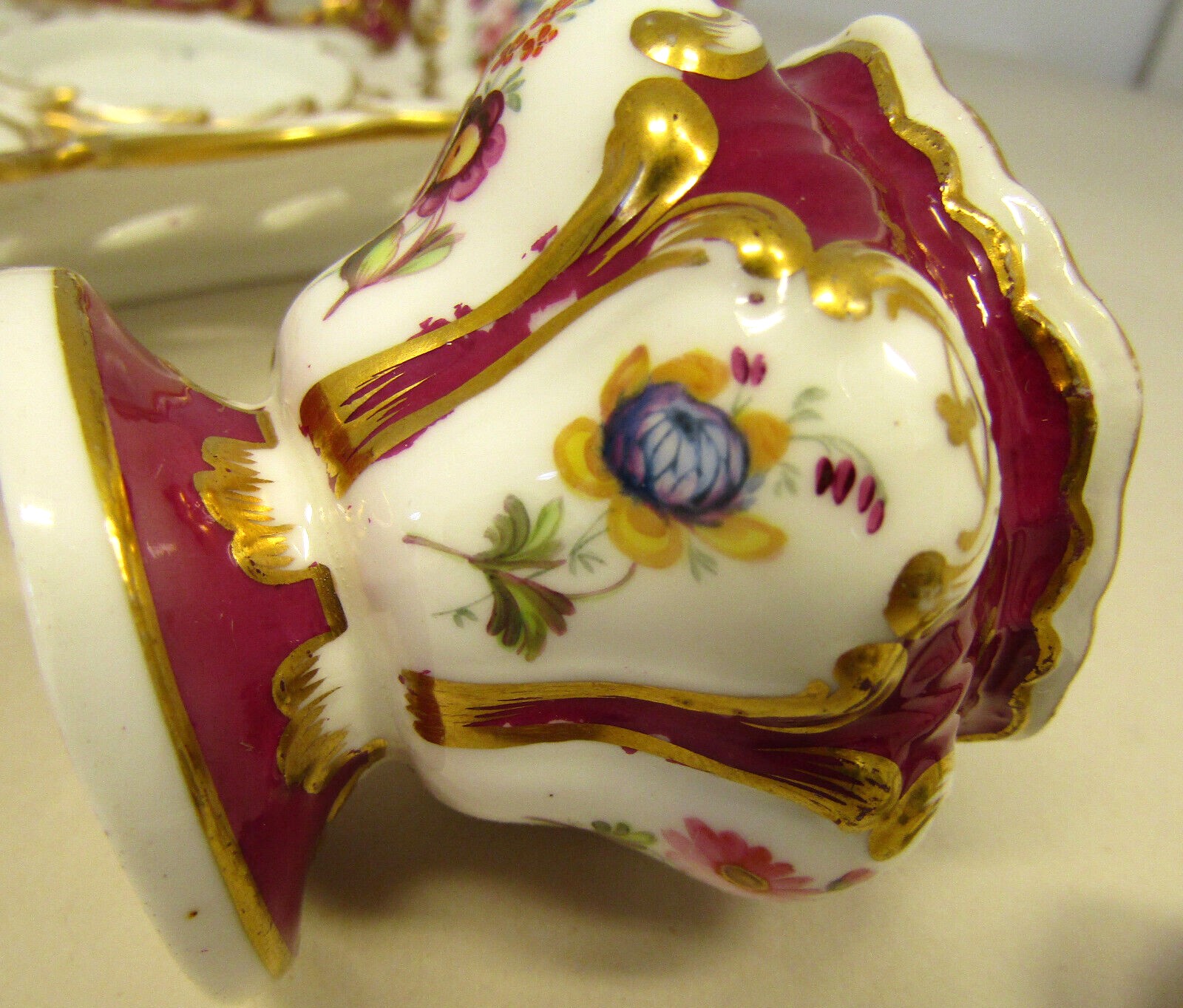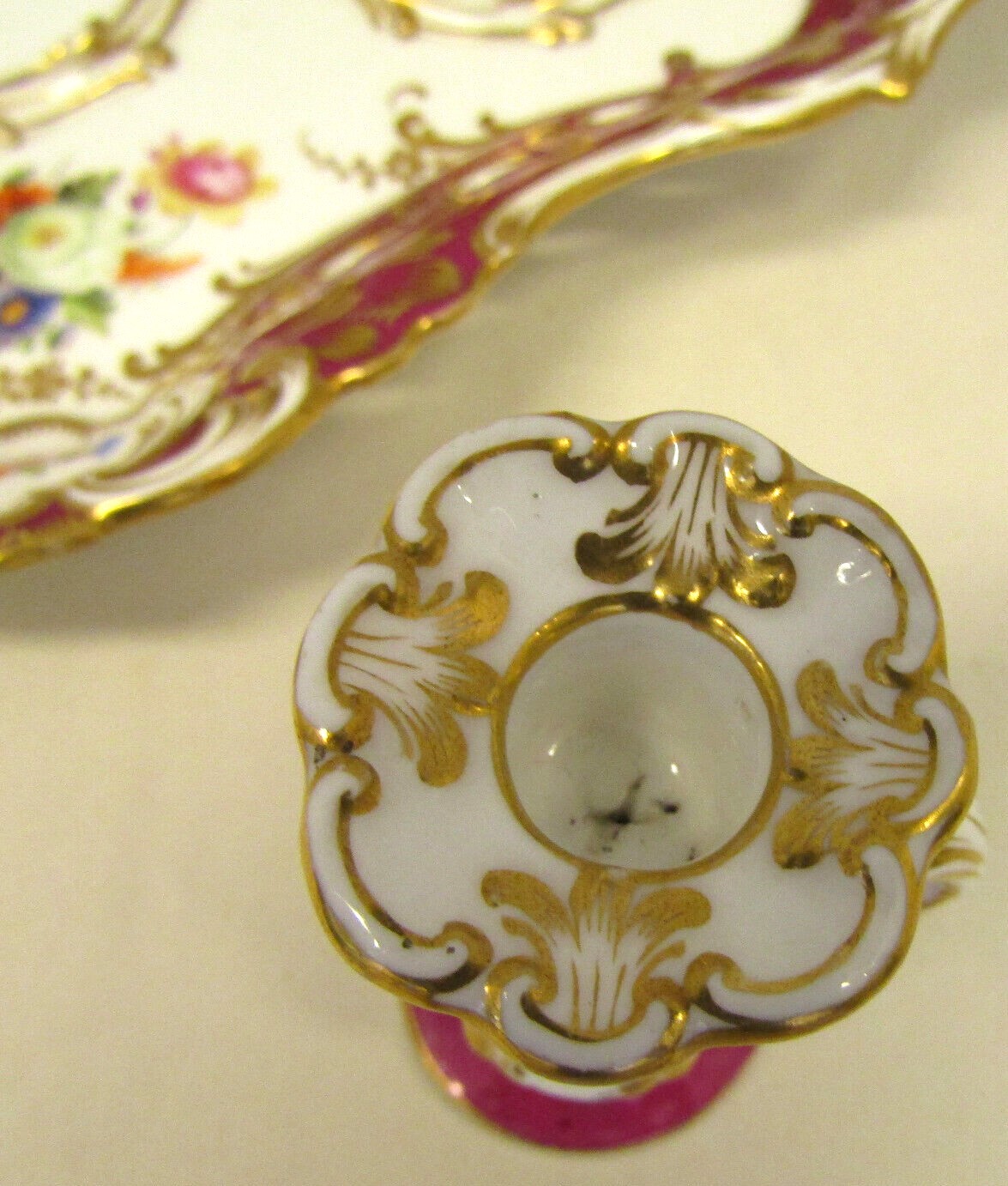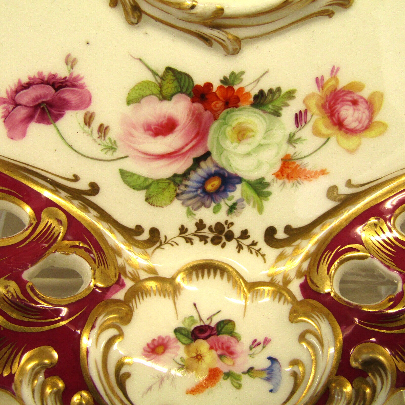 This English porcelain inkstand consists of a fitted reticulated tray, two ink pots and lids, and a candle stand. The pieces are profusely decorated with delicate, hand painted florals and gilding. The tray, with a pierced puce and gilt border, has raised compartments to hold the ink pots and candle stand. Each ink pot has six panels of hand painted flowers, each one different.