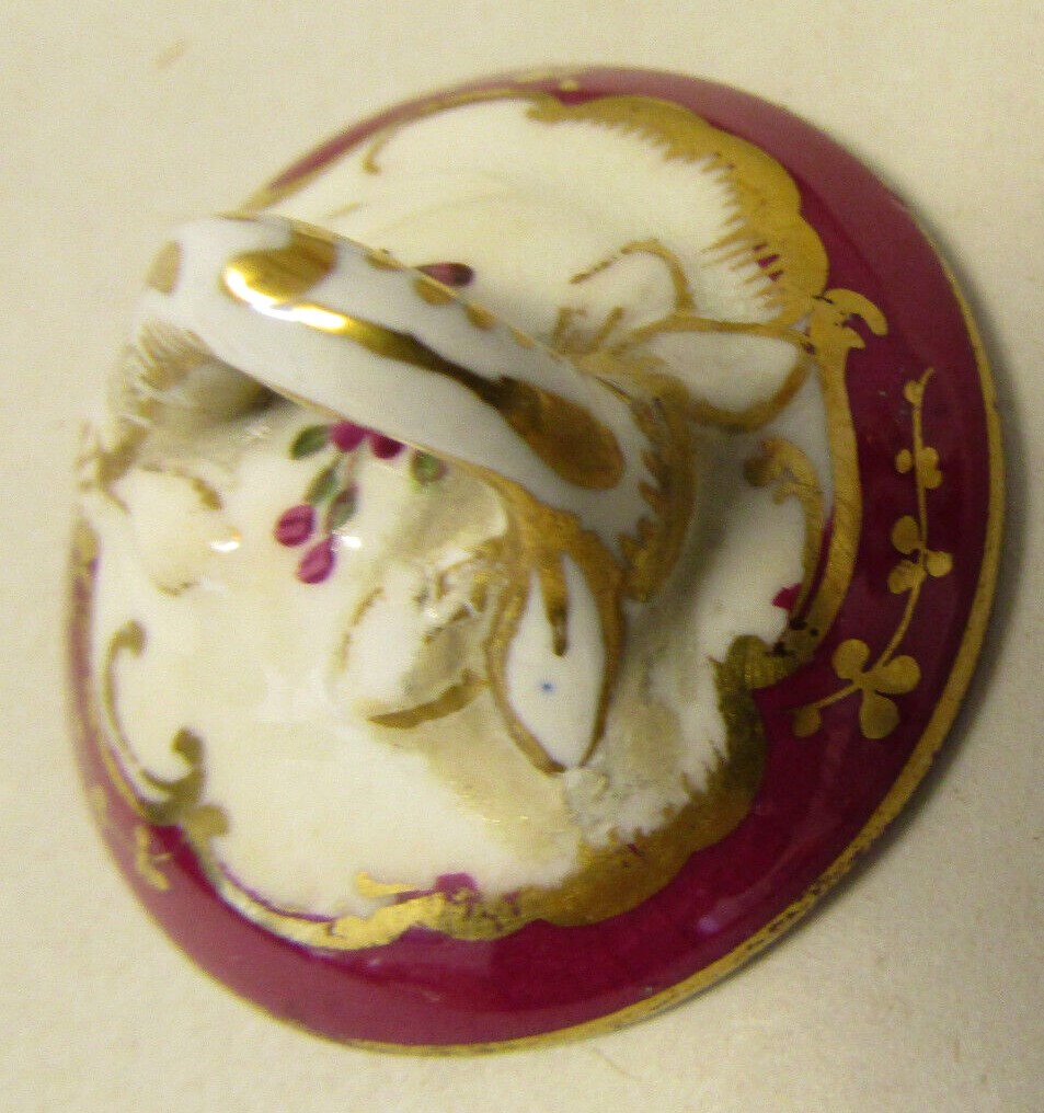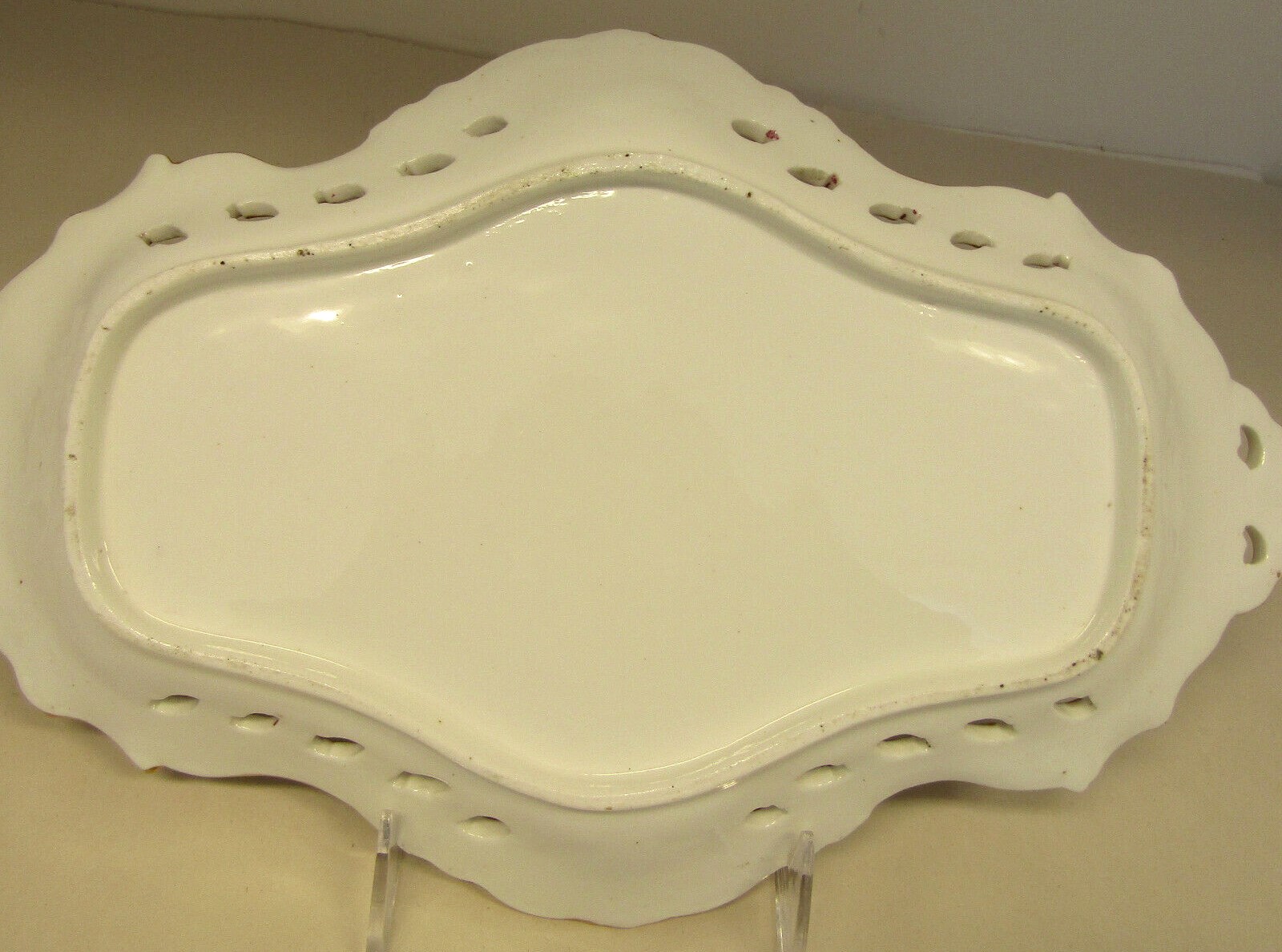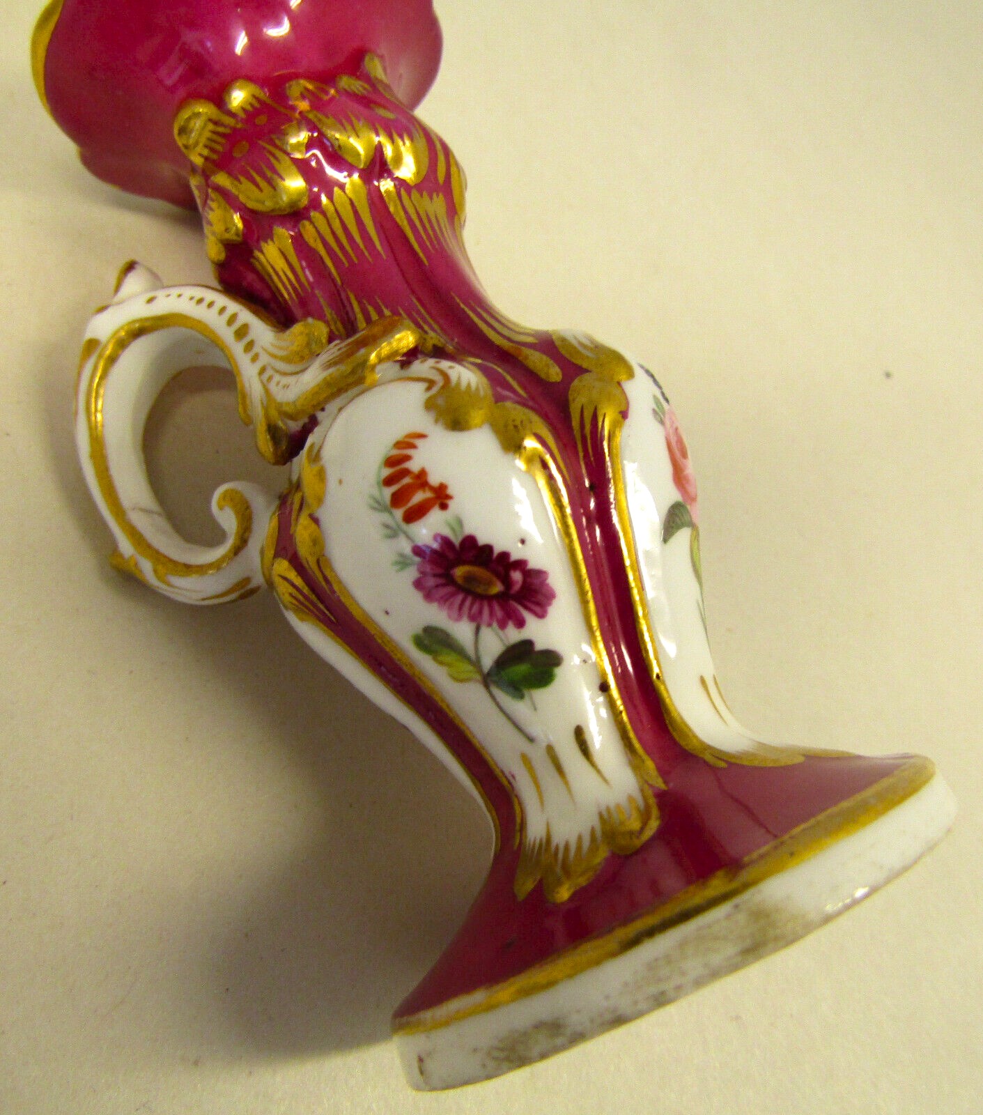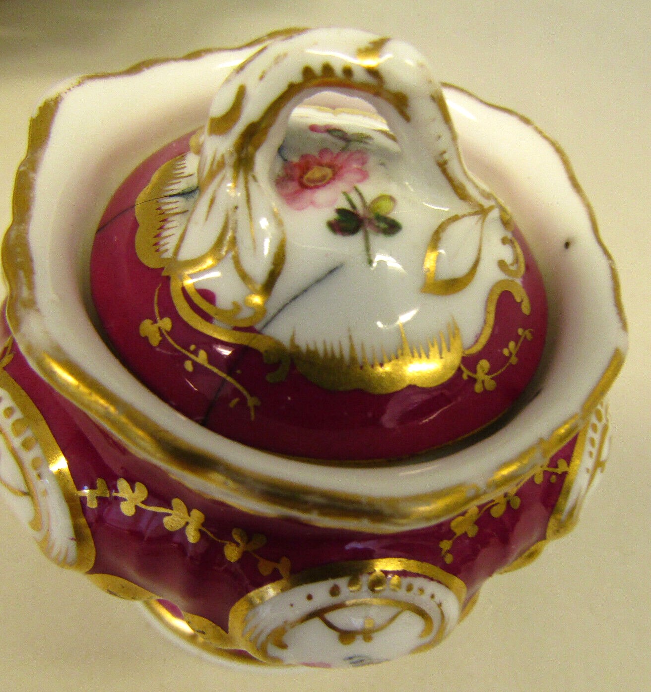 This English porcelain inkstand consists of a fitted reticulated tray, two ink pots and lids, and a candle stand. The pieces are profusely decorated with delicate, hand painted florals and gilding. The tray, with a pierced puce and gilt border, has raised compartments to hold the ink pots and candle stand. Each ink pot has six panels of hand painted flowers, each one different.