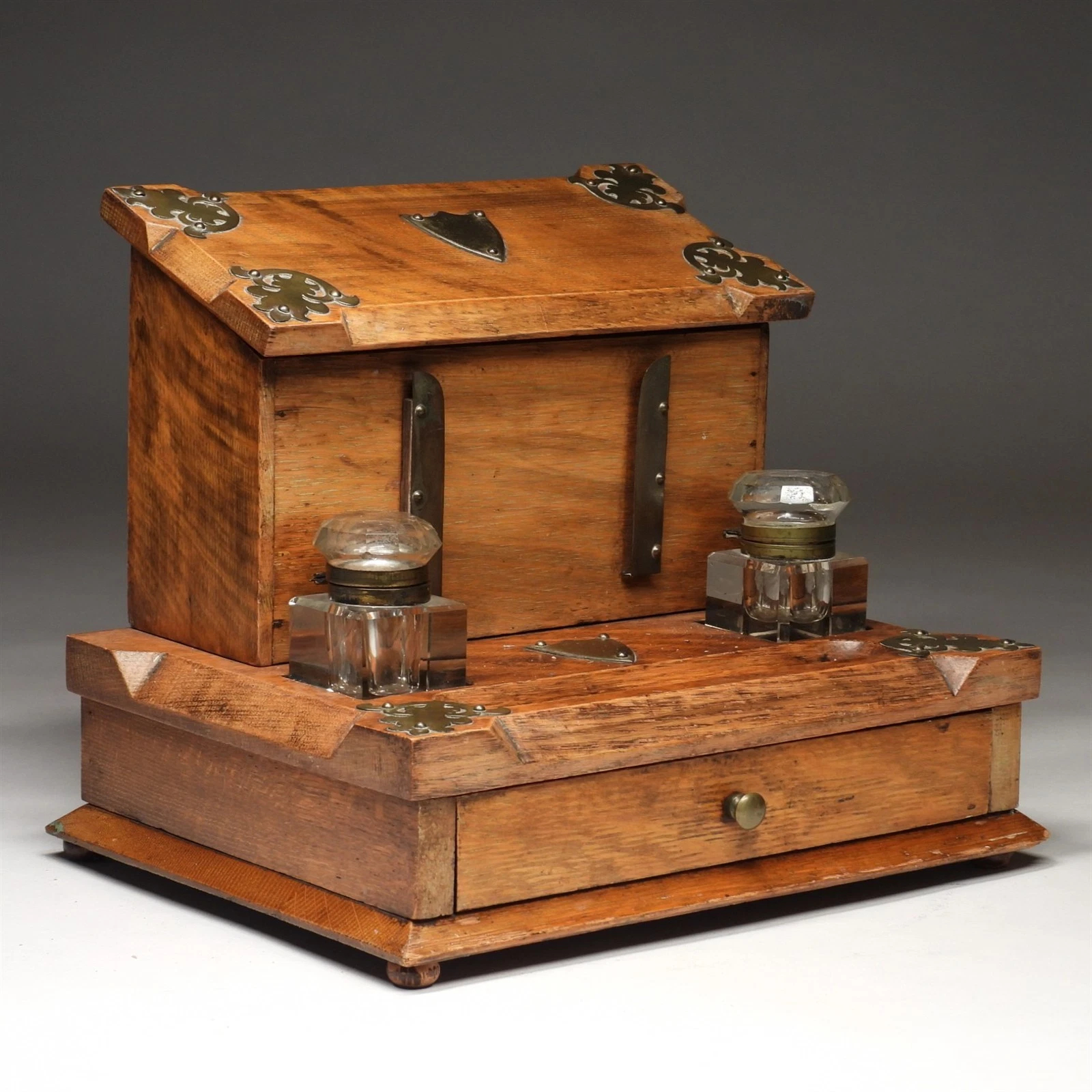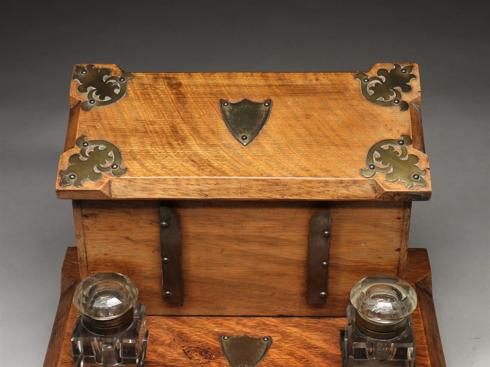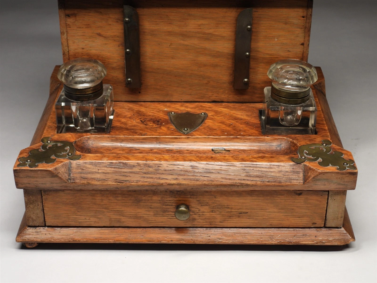 Escutcheons: Three shield-shaped brass plaques are centered on the piece—one on the slope lid, one on the facade between the rails, and one on the base—allowing for custom engraving or simply serving as a focal point.