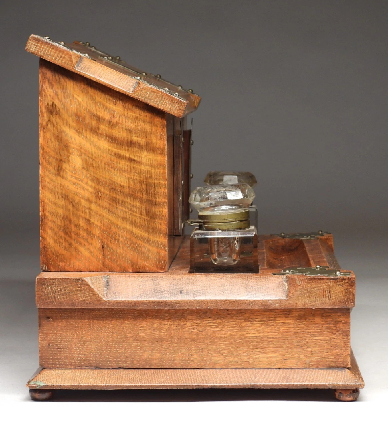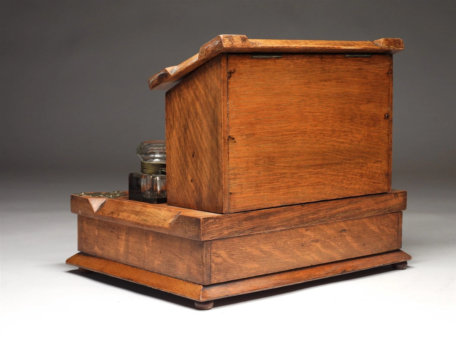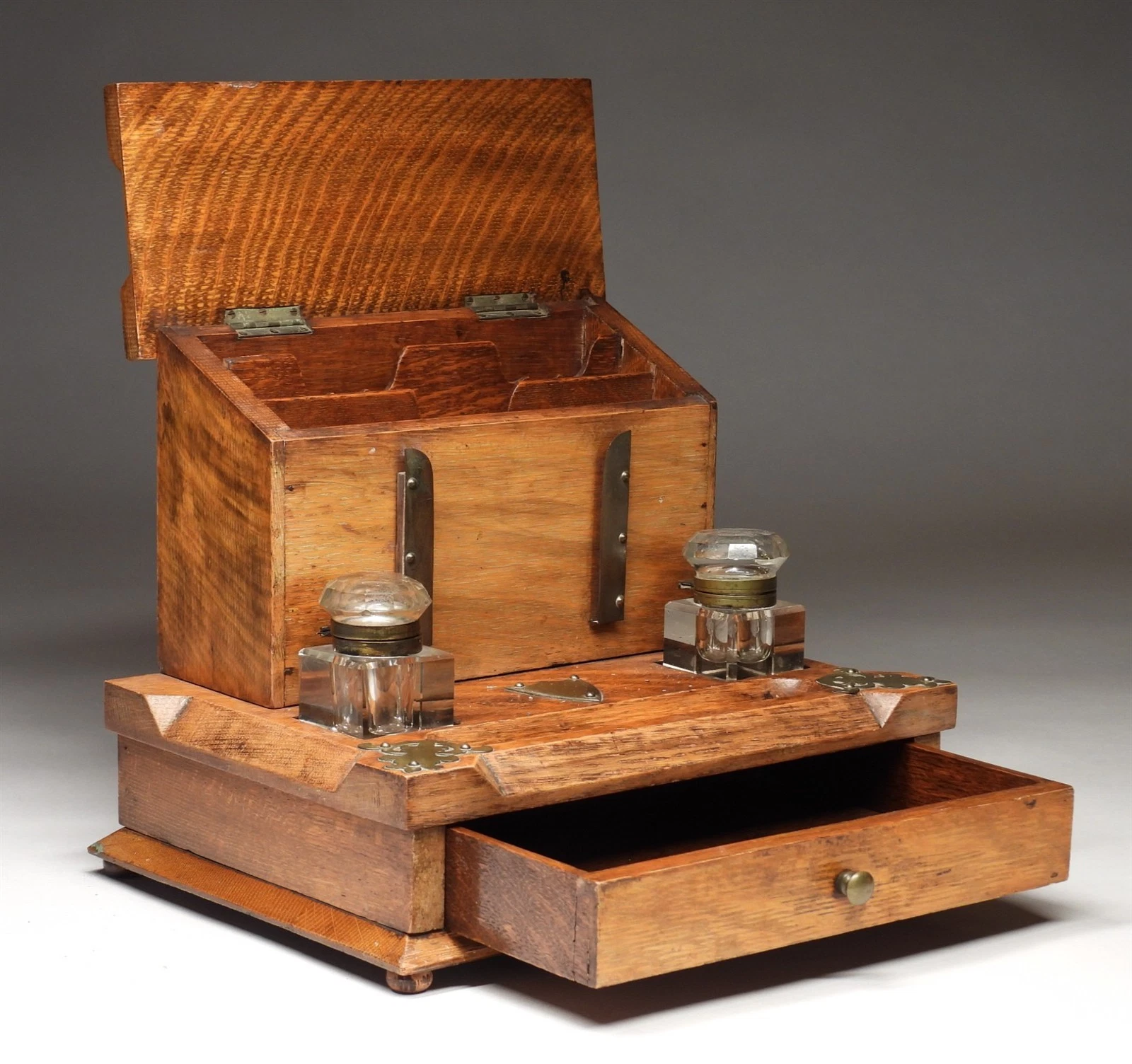 This is a handsome example of late 19th-century English office cabinetry, combining the functionality of a stationery cabinet with the convenience of a double inkstand. The use of quartersawn oak—evident in the prominent medullary rays (the “tiger stripe” grain)—gives the piece a sturdy, architectural presence characteristic of the high Victorian or Arts & Crafts era.