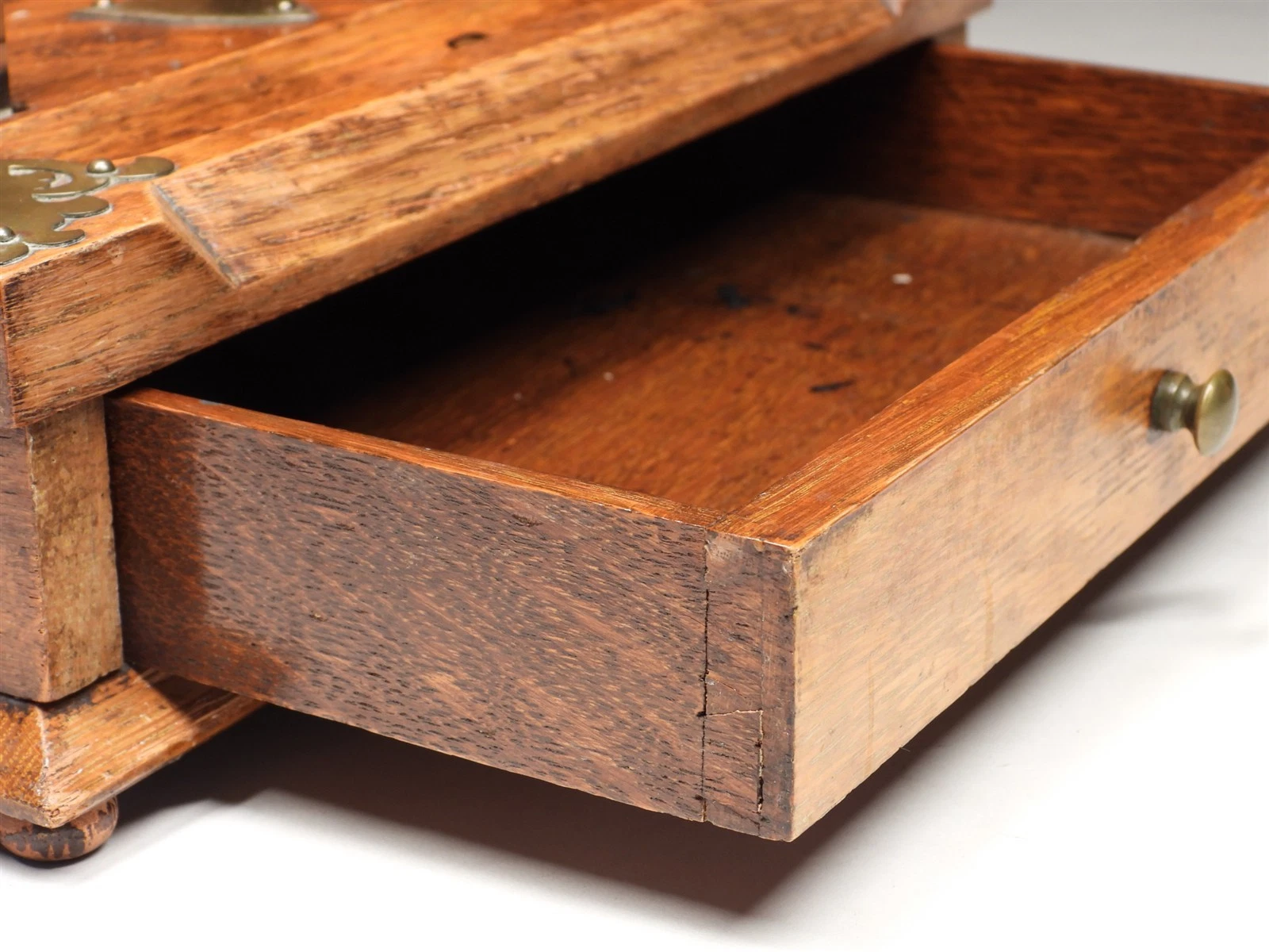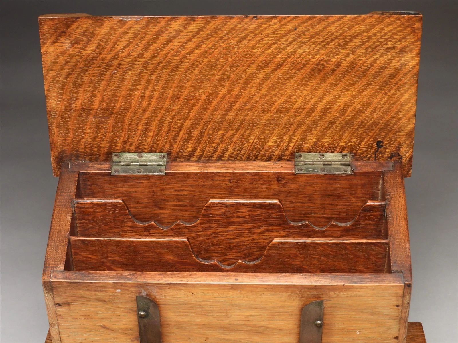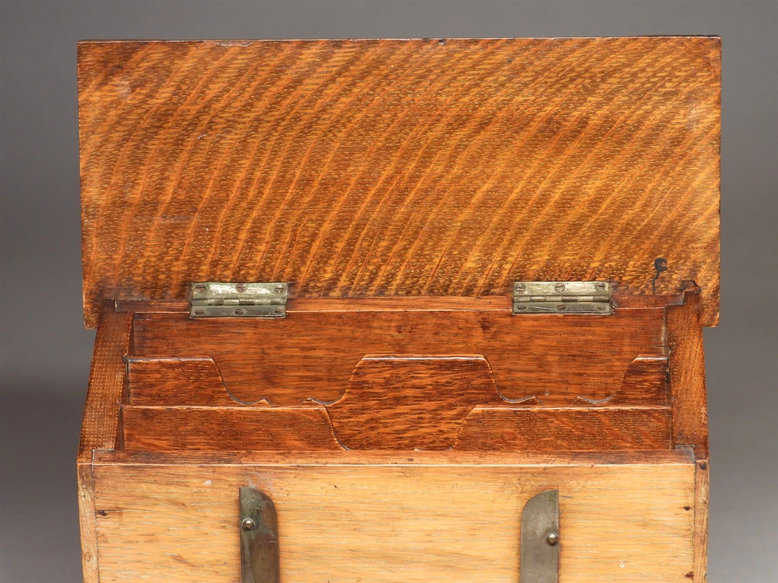 - Stationery Compartment: The upper section features a canted (sloped) lift-top that opens on two internal brass hinges. Inside, the cabinet is divided into three-tiered compartments, sized for sorting correspondence, envelopes, and telegrams.