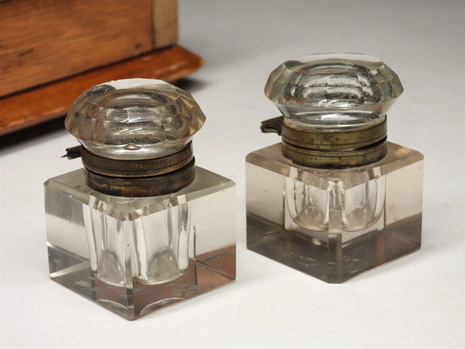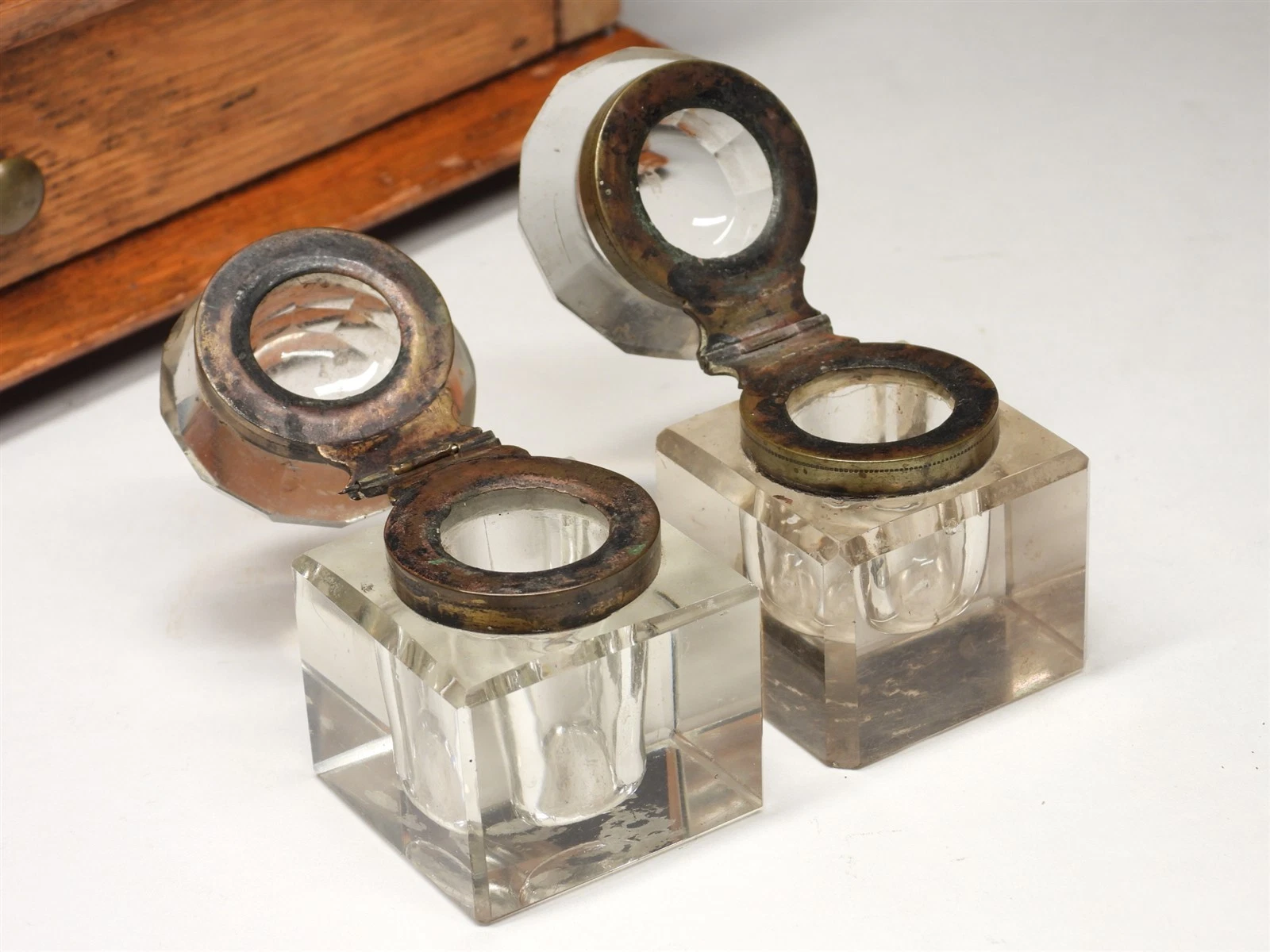 - Inkwells: The set includes its two original heavy glass inkwells. These are cut in a square block form with deep, circular reservoirs. They are topped with faceted, star-cut glass lids mounted on brass collars.
