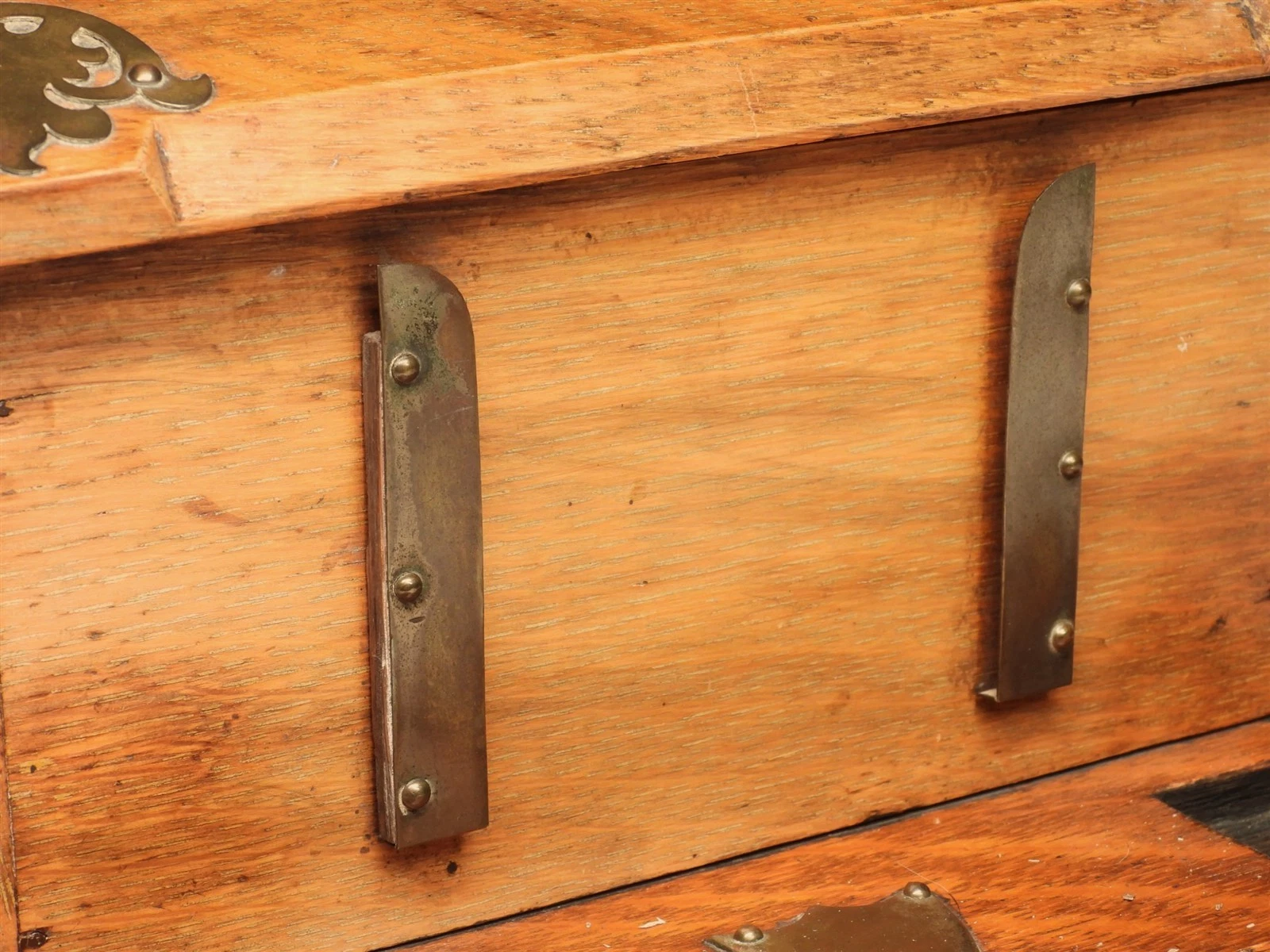The piece is heavily accented with ornate brass (or bronze) hardware that provides a striking contrast to the honey-toned oak: