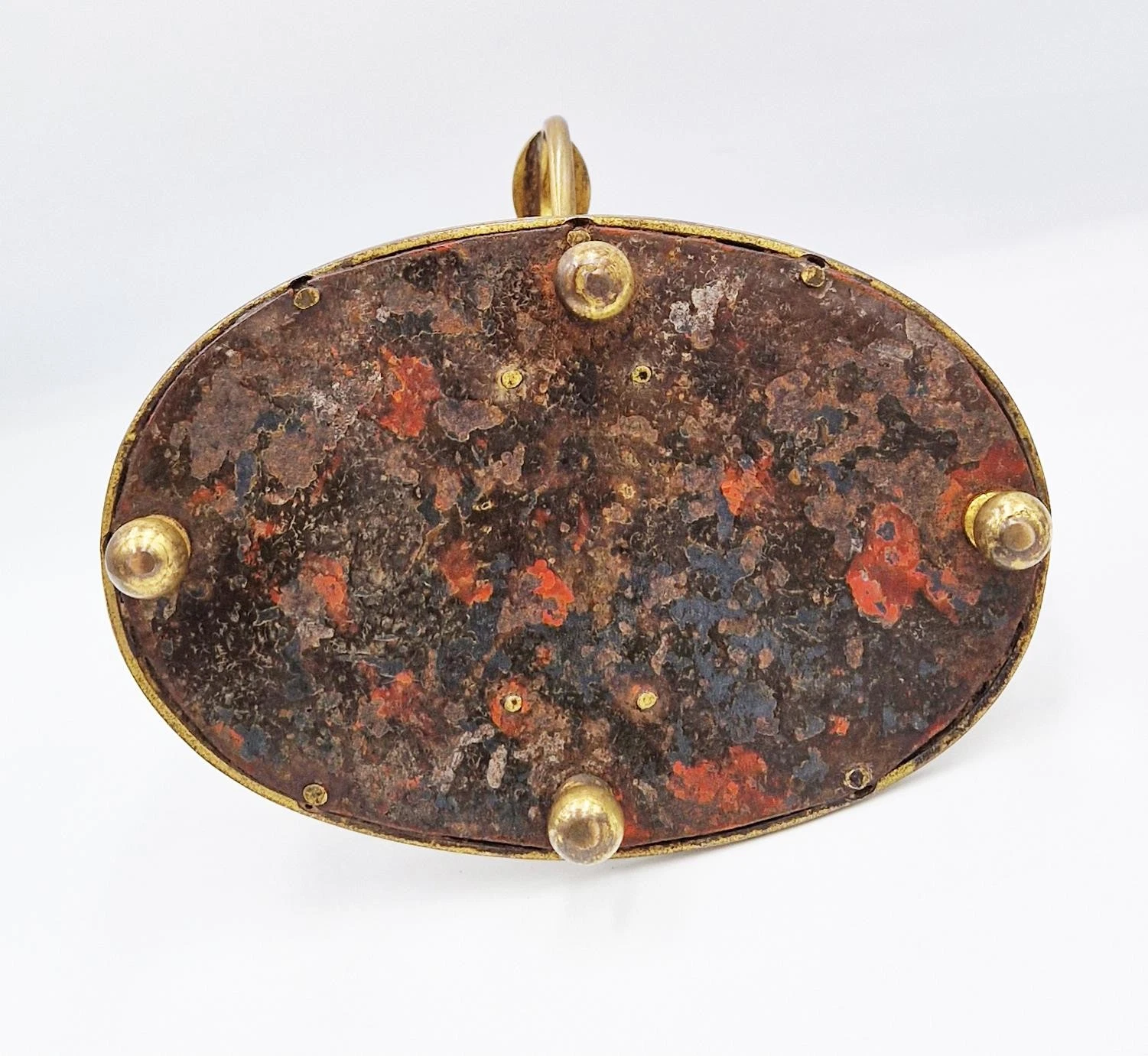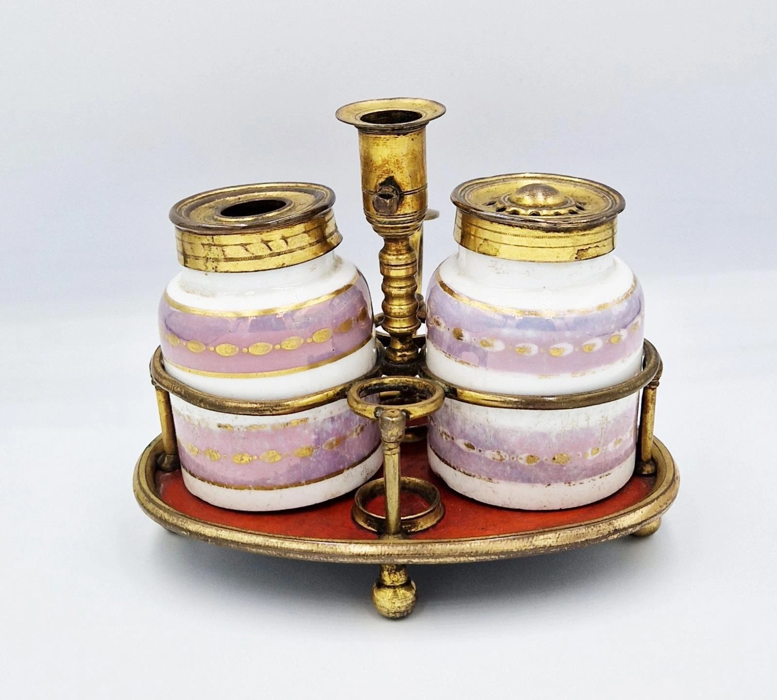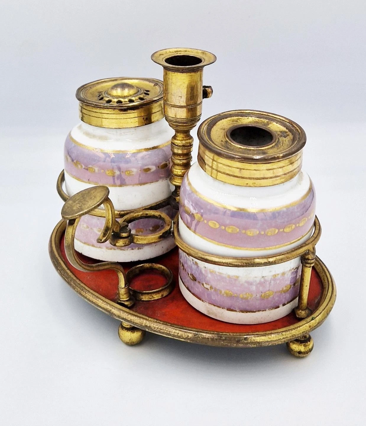 • The Standish (Base): An oval toleware (lacquered or “japanned” tin) base, finished in a deep, rich oxblood or cinnabar red. The base is elevated on four gilded brass ball feet and is finished with a polished brass rim.