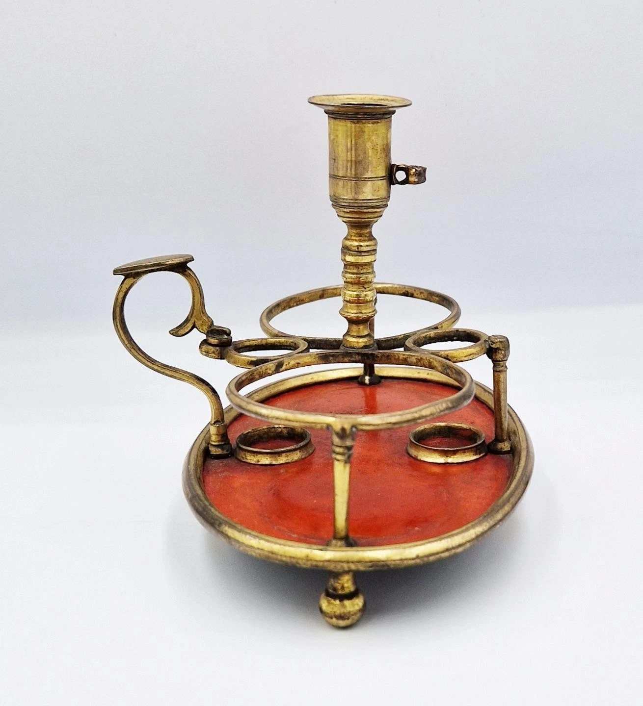 • The Fittings: Centrally mounted is a taperstick (a small candleholder) used for melting sealing wax. It features a scrolling, integrated carrying handle with an oval thumb-rest for easy portability between rooms.