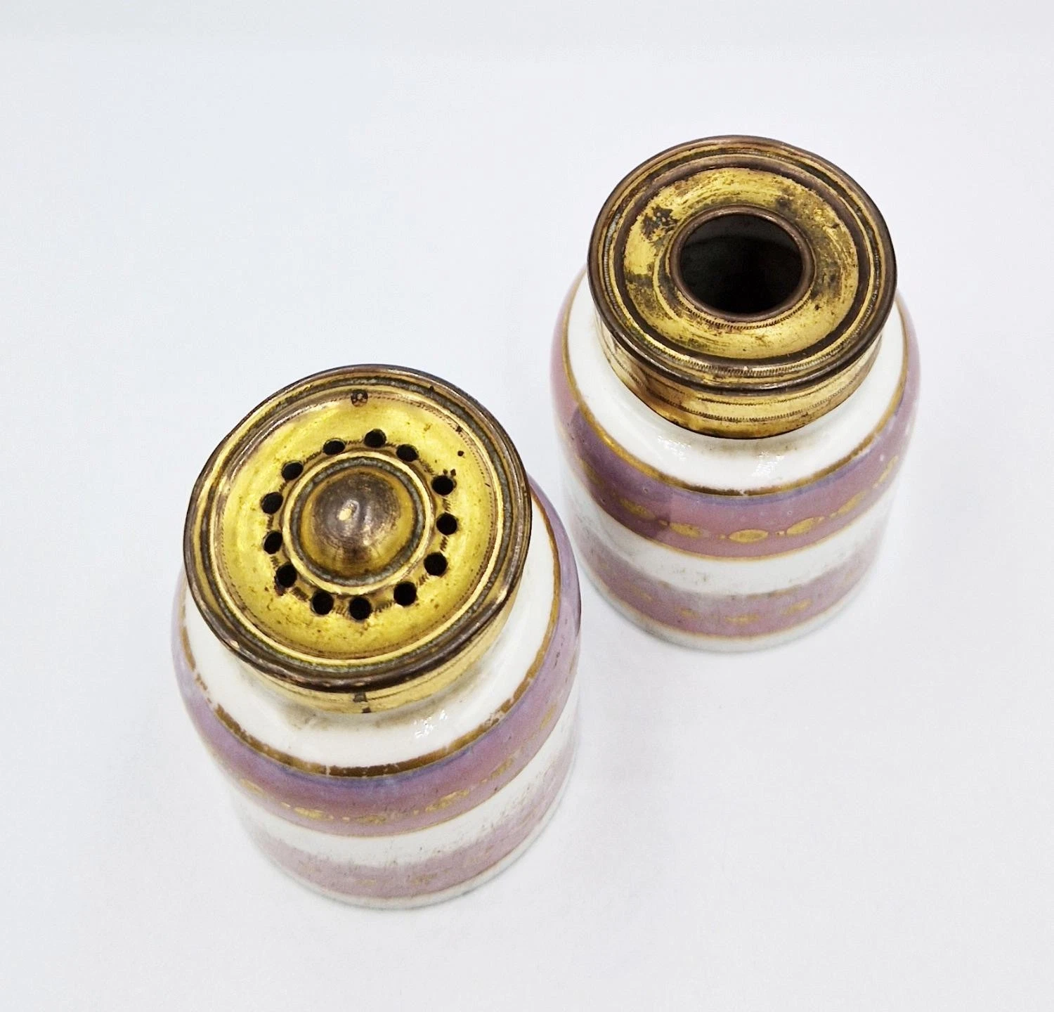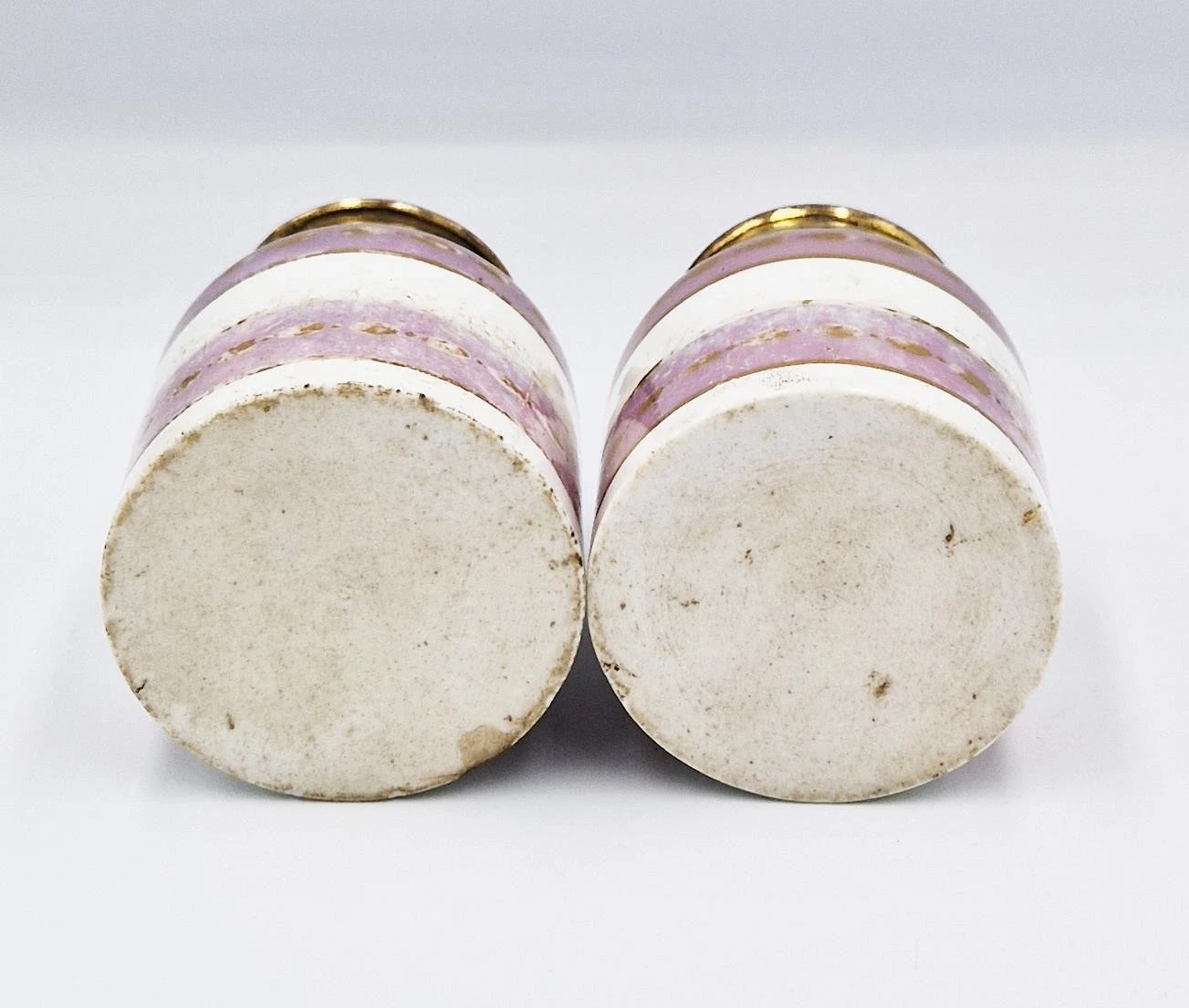 • Decoration: The porcelain is decorated with horizontal bands of pink/purple luster glaze, accented by hand-painted gilded geometric “eye” or “oval” patterns.