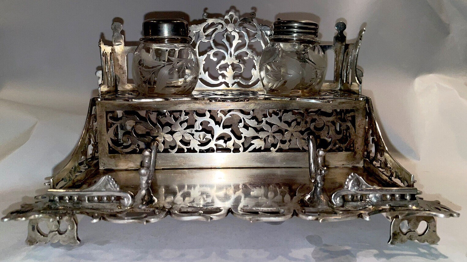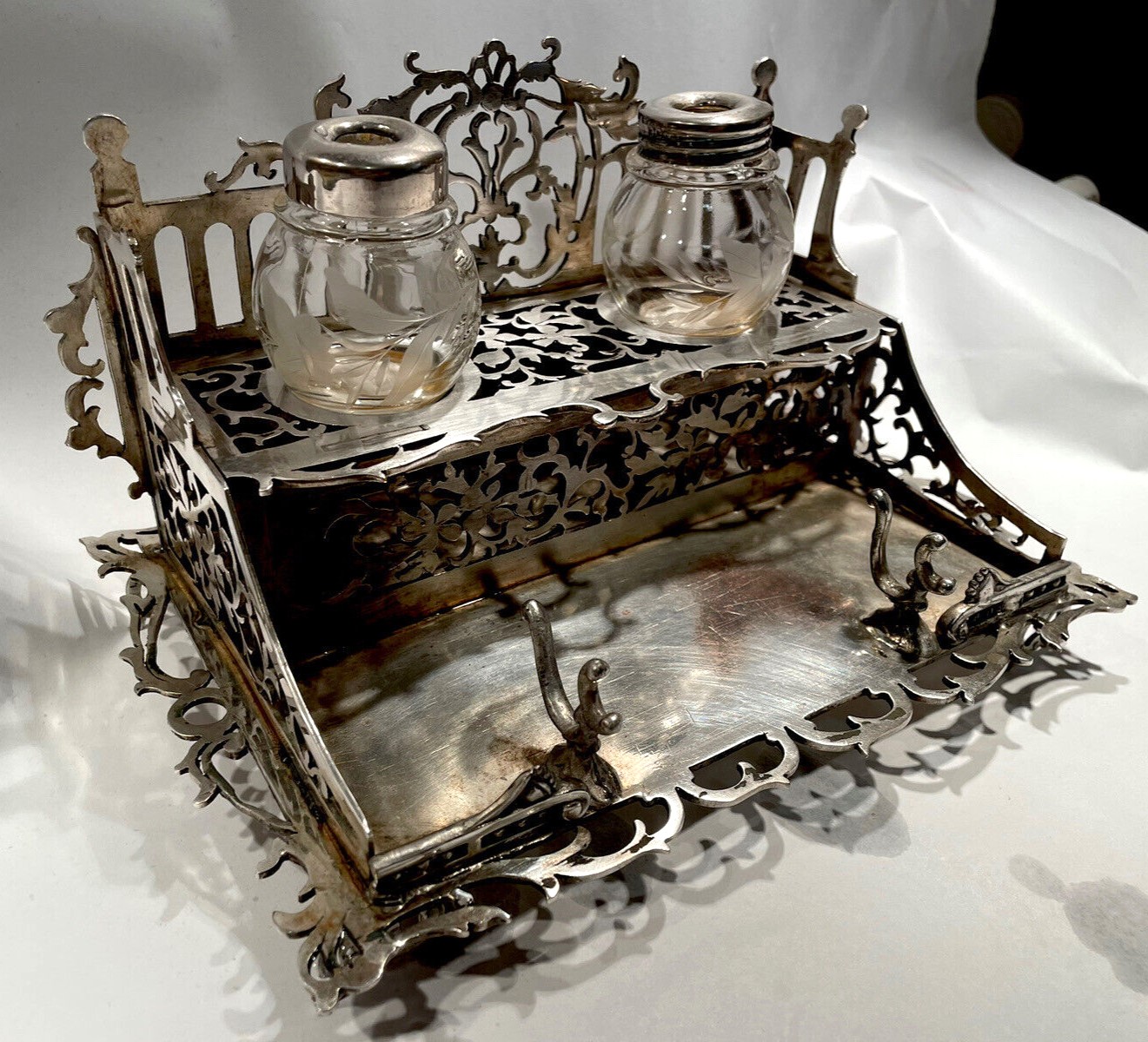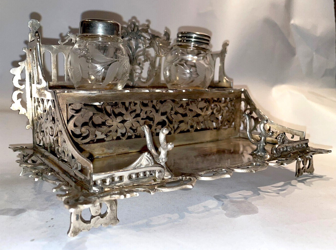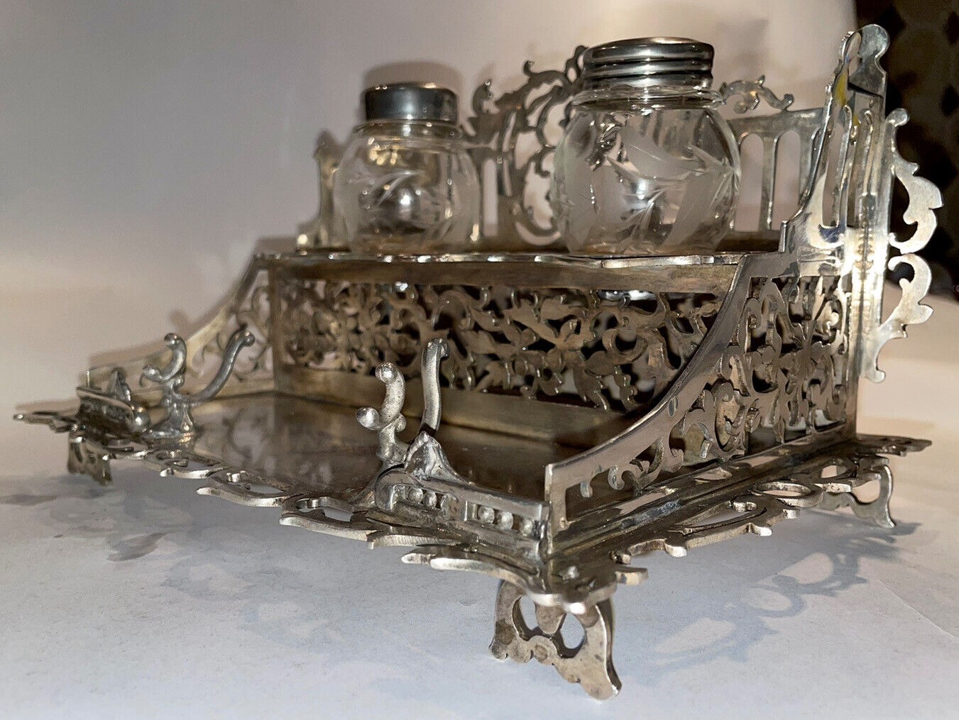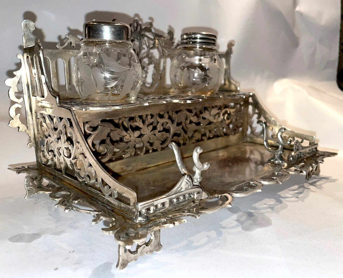 Victorian two-tiered silver inkstand designed with ornate latticework holds two glass inkwells etched with a foliate design on the upper tier. Below is a pen holder and space for writing implements.