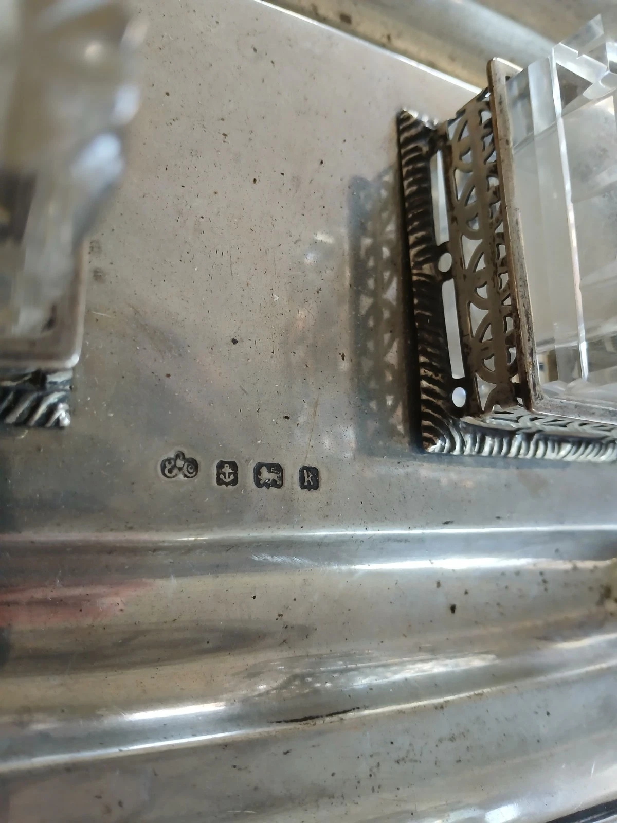 - Inkwells: The set includes two heavy, square-cut crystal inkwells. These sit within two fixed silver pierced galleries (frames) that are secured to the tray with threaded nuts on the underside.