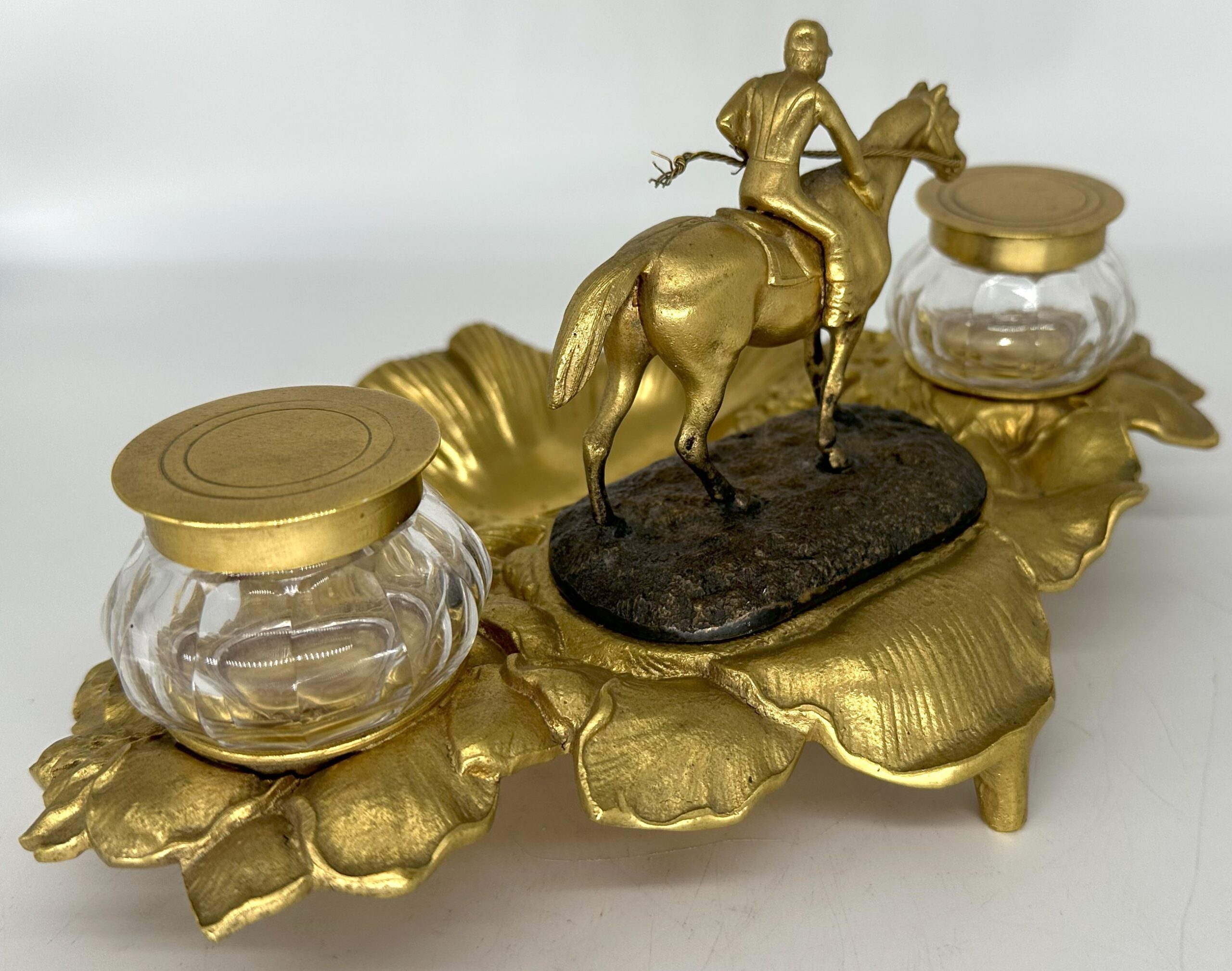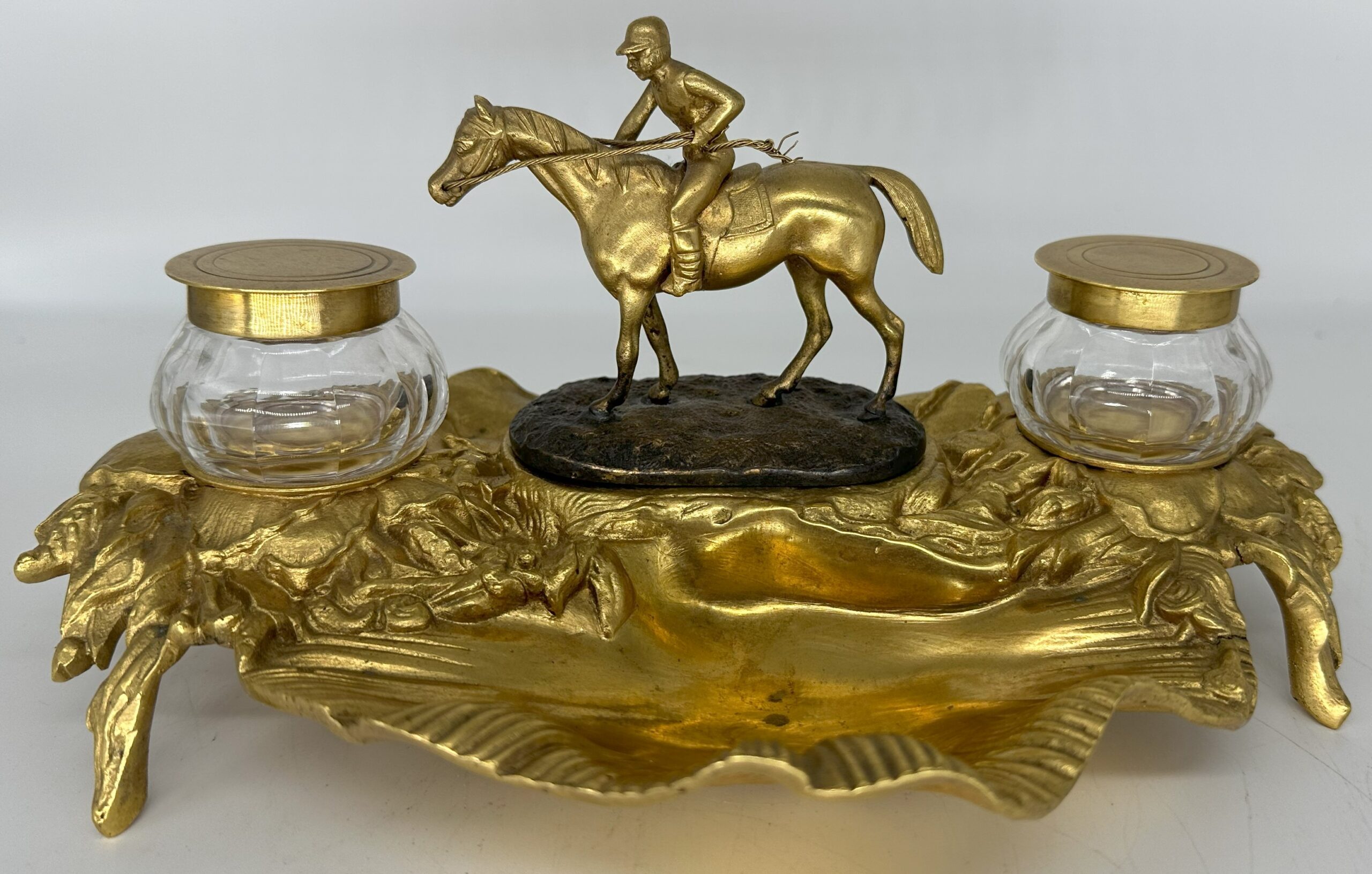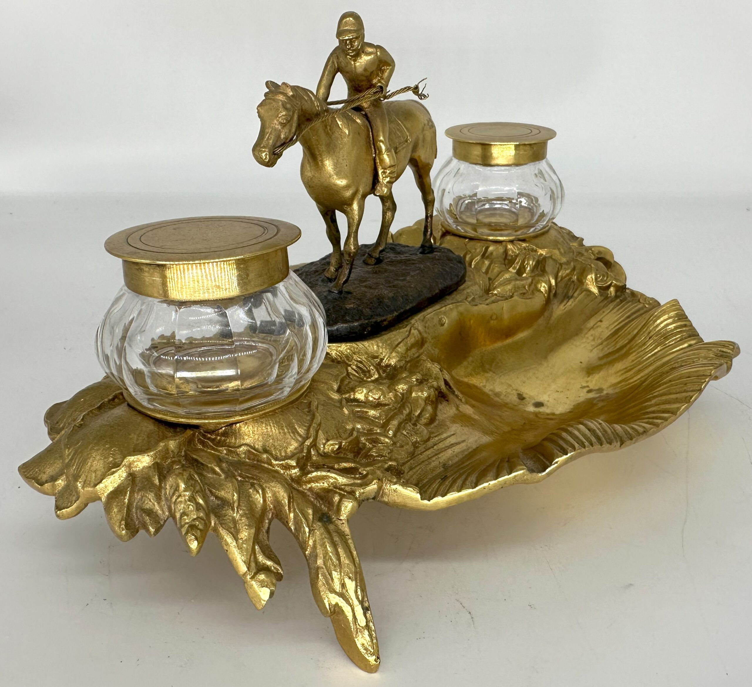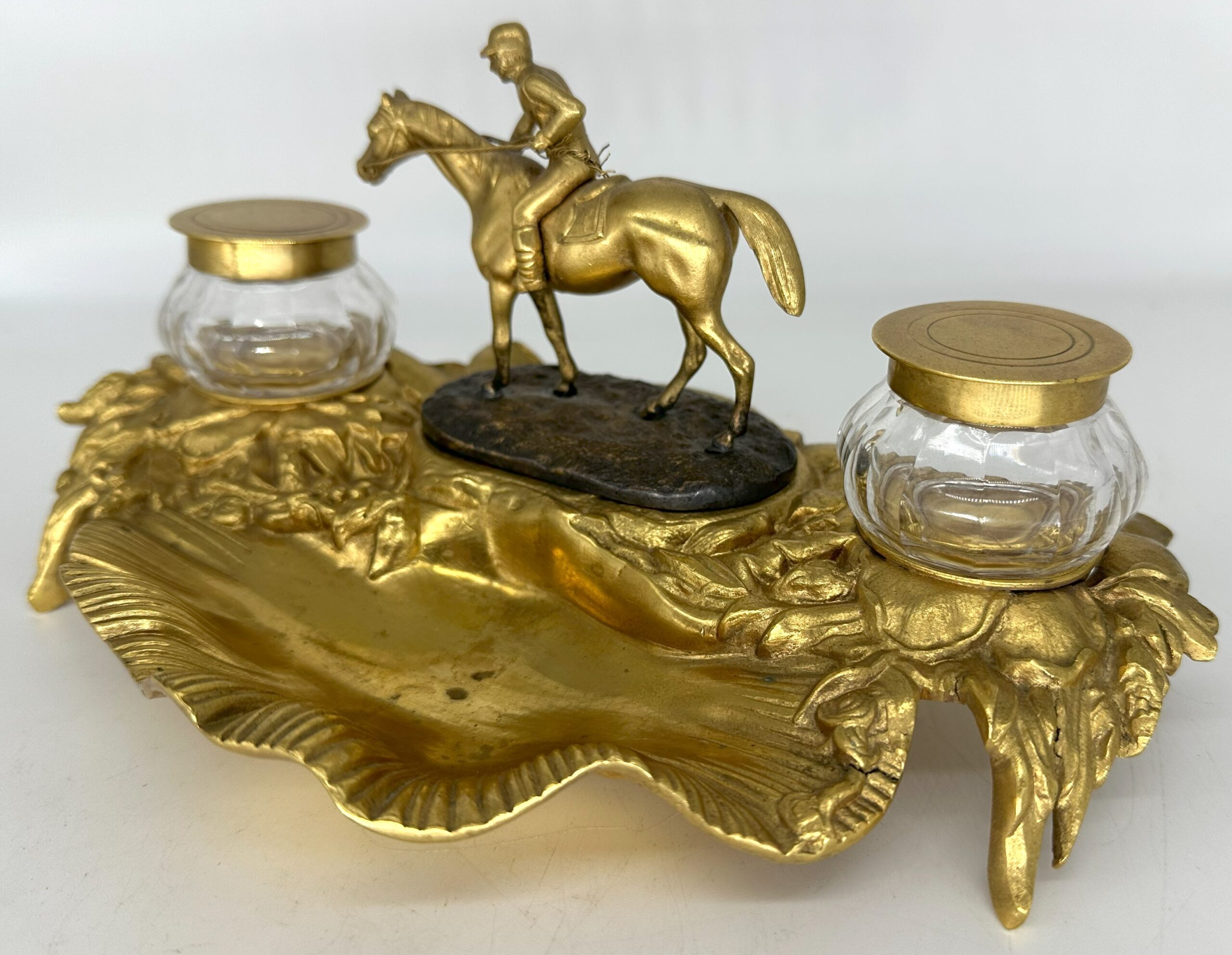 A gold ormolu over metal base with a shell-shaped pen tray holds two glass inkwells with brass lids. Floral decoration surrounds the inkwells. In the center is a racehorse with a jockey rider. The horse and rider cover a storage compartment.