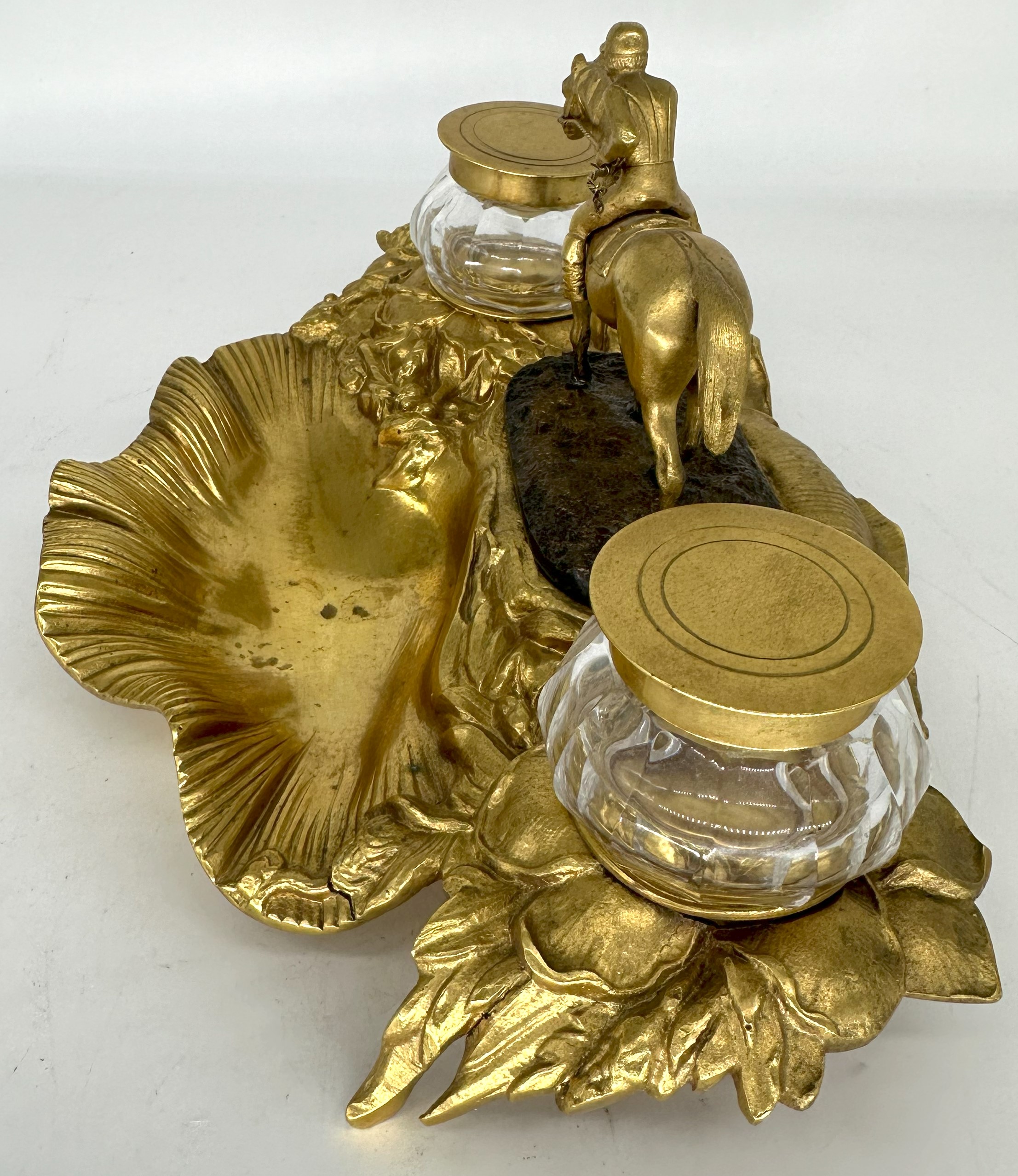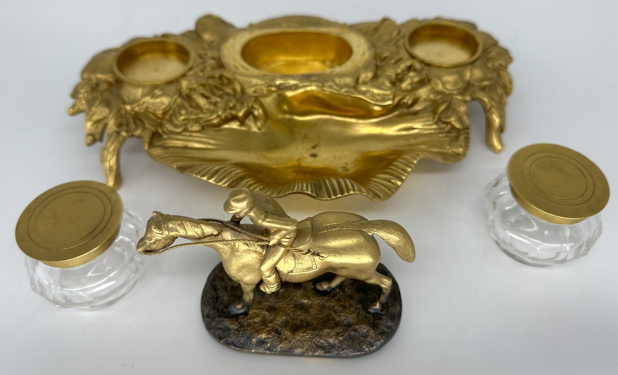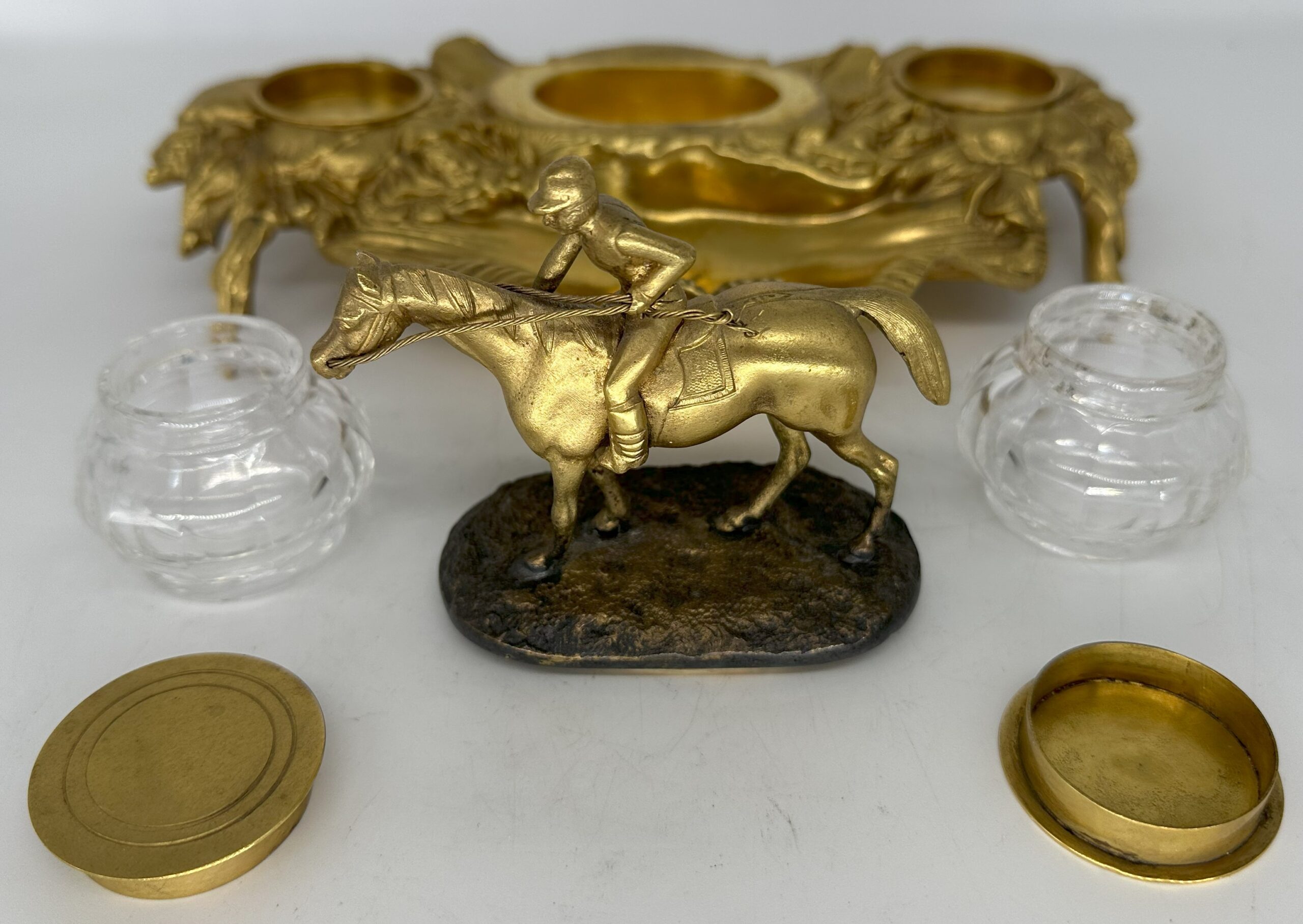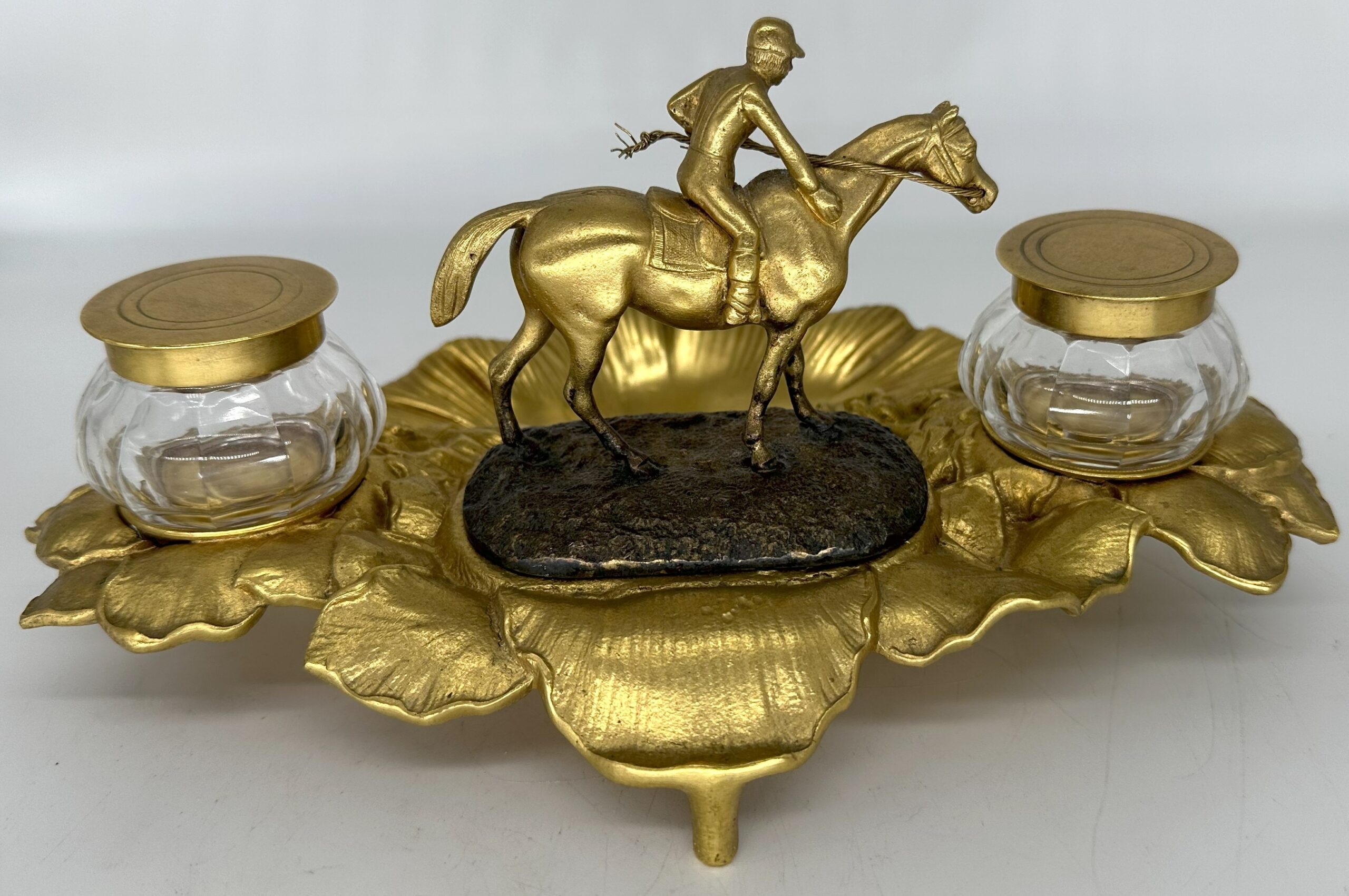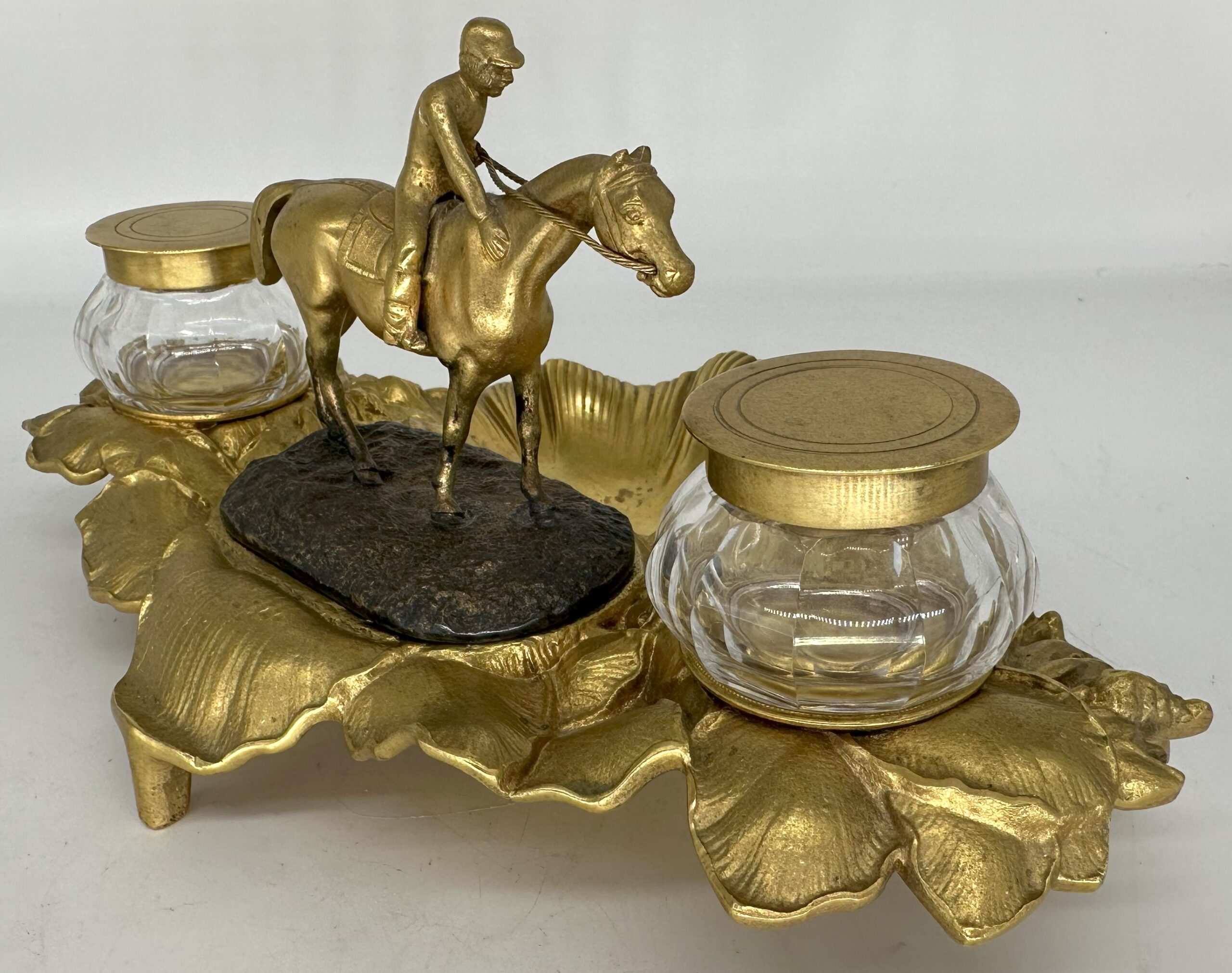 A gold ormolu over metal base with a shell-shaped pen tray holds two glass inkwells with brass lids. Floral decoration surrounds the inkwells. In the center is a racehorse with a jockey rider. The horse and rider cover a storage compartment.