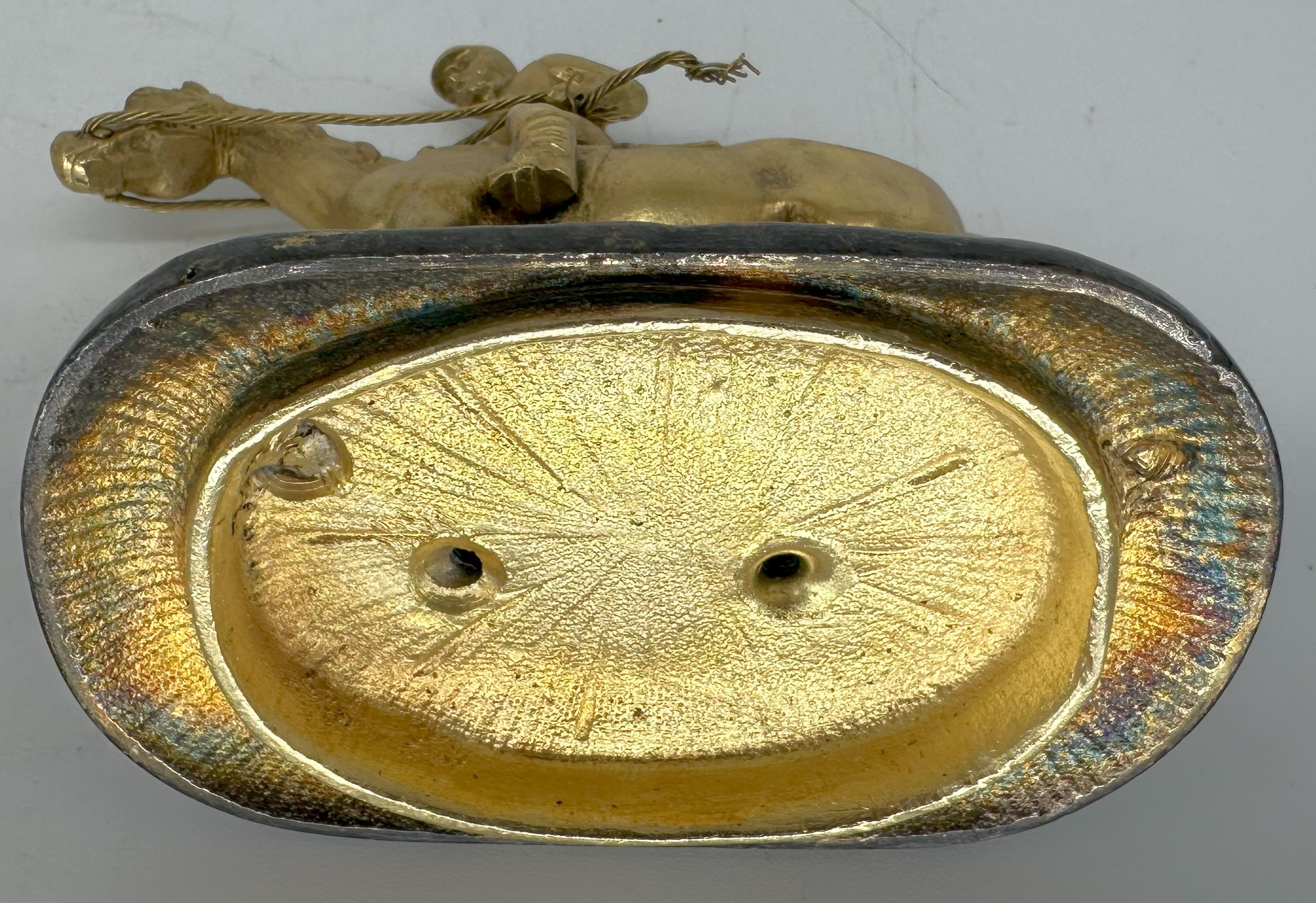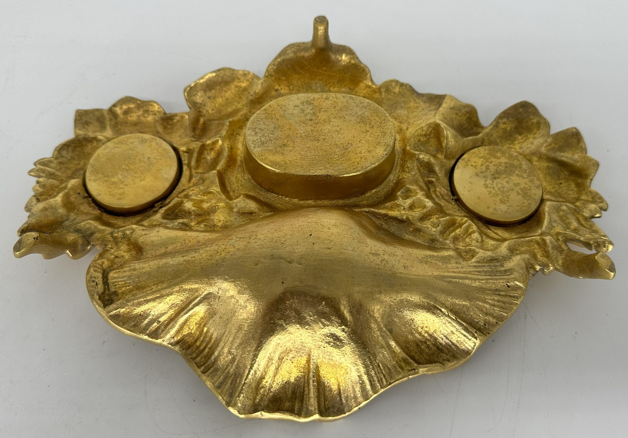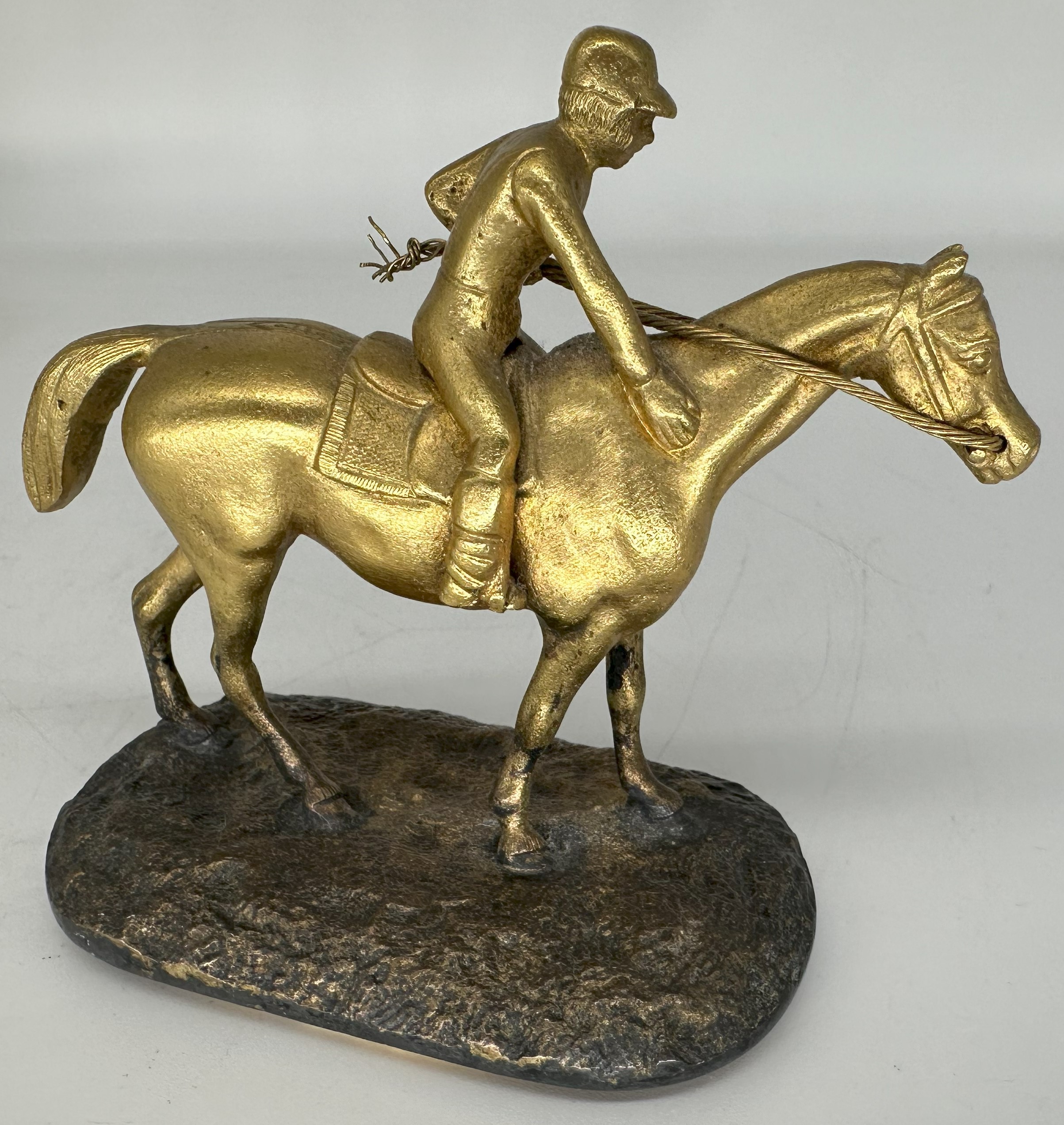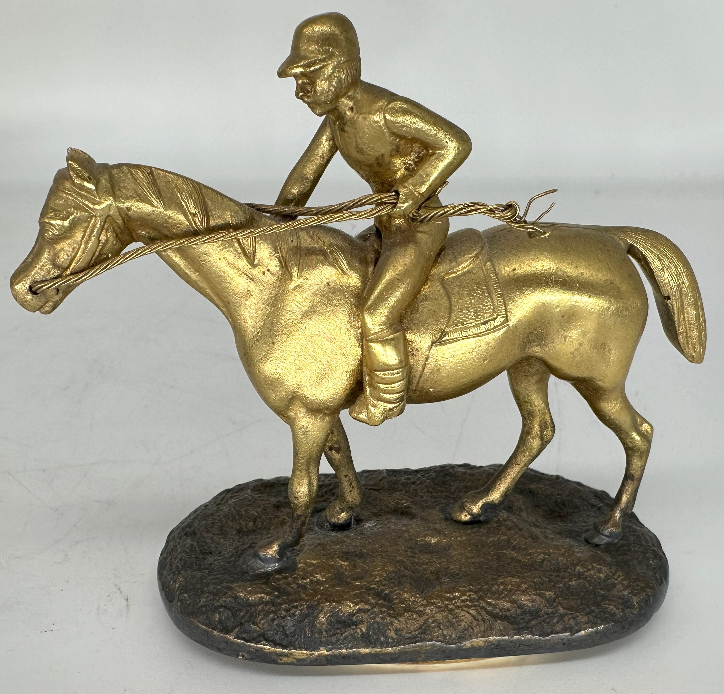 A gold ormolu over metal base with a shell-shaped pen tray holds two glass inkwells with brass lids. Floral decoration surrounds the inkwells. In the center is a racehorse with a jockey rider. The horse and rider cover a storage compartment.